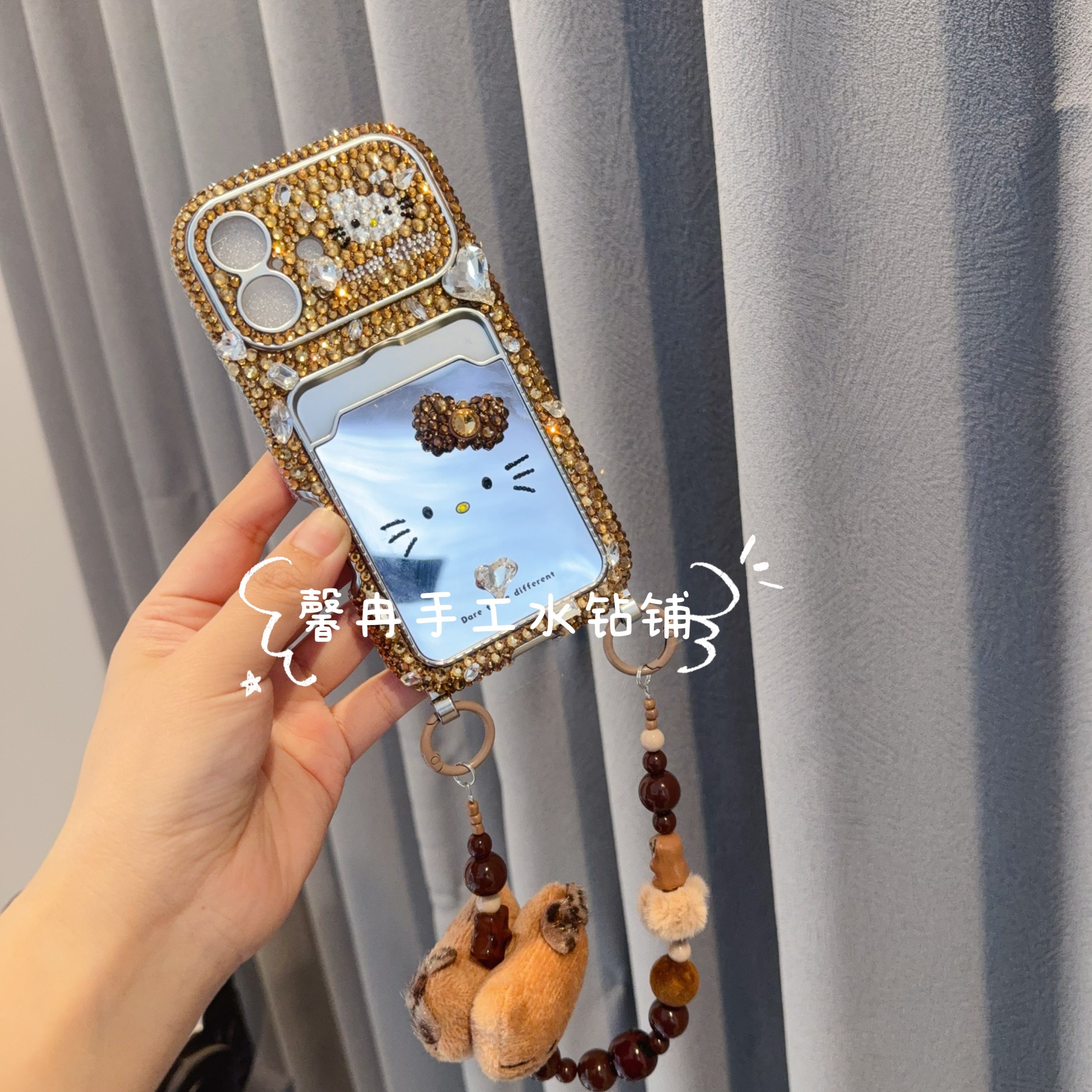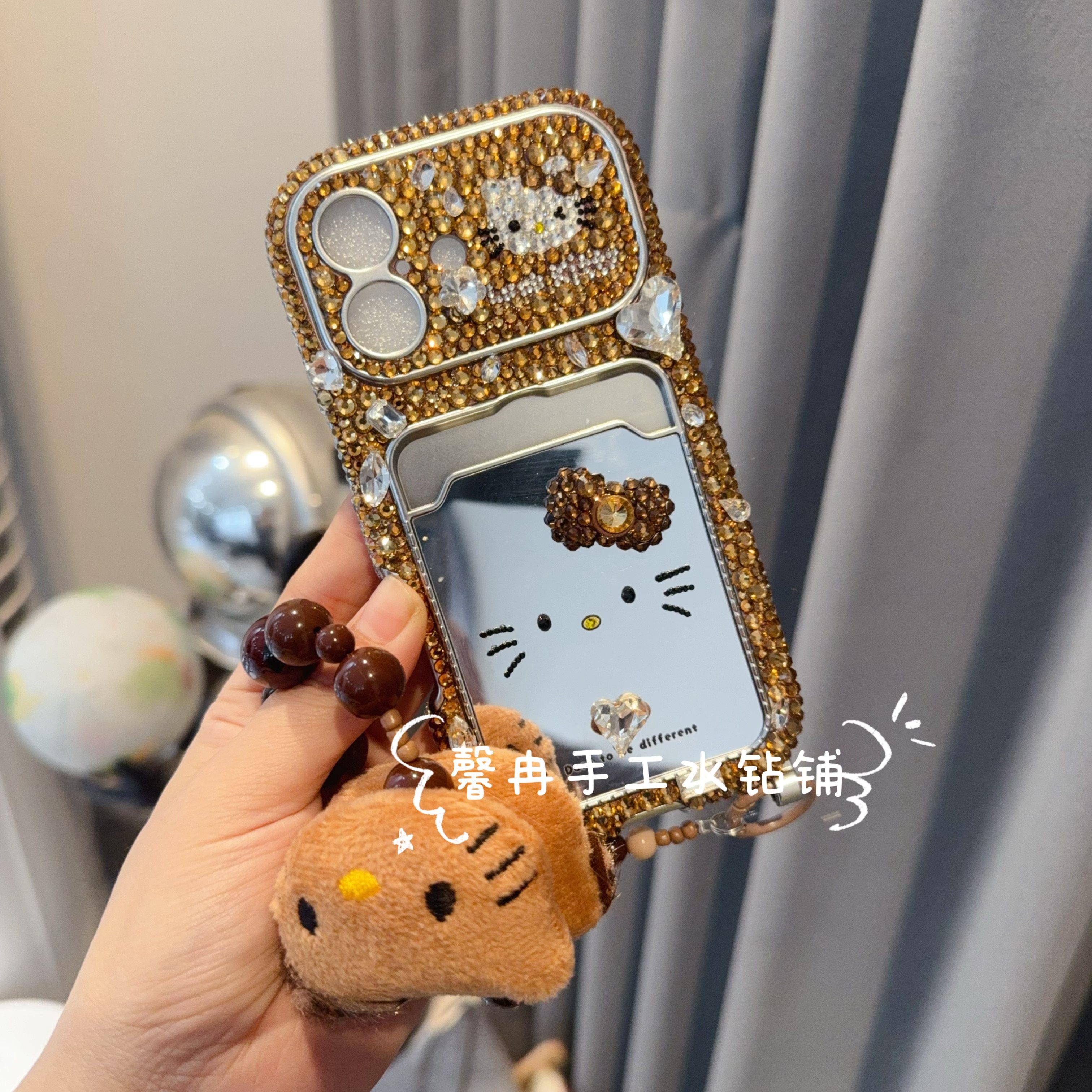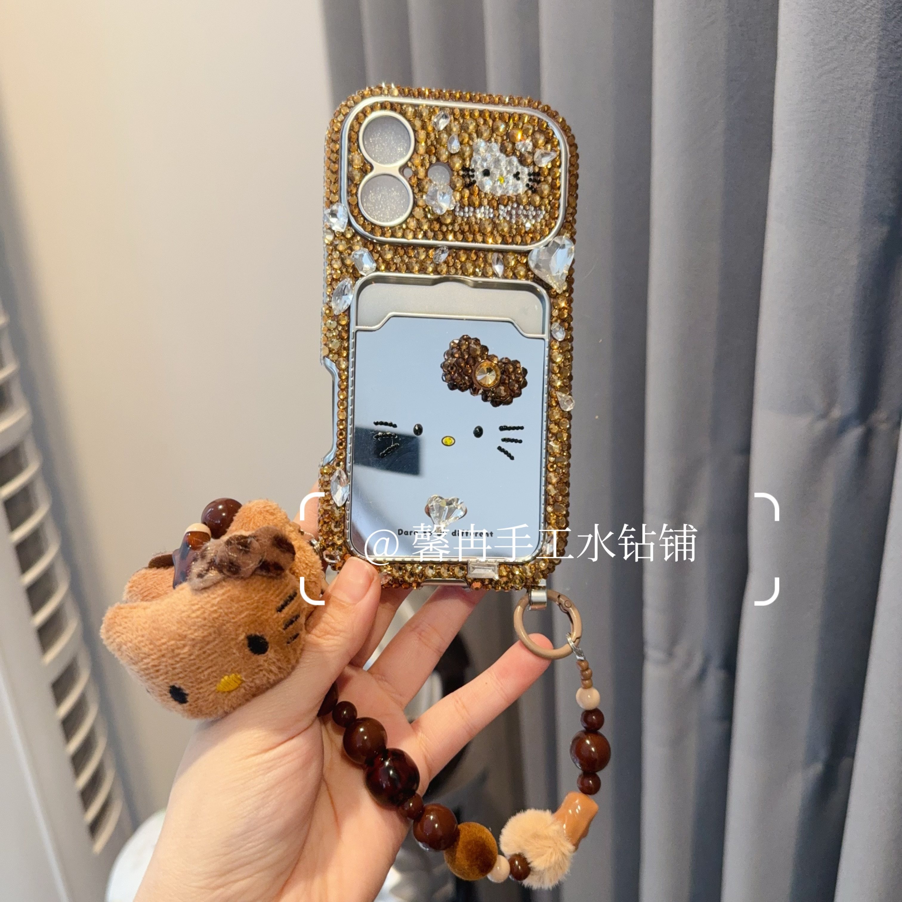 📚 17promax棕色简约爱心kt补妆镜卡包手提链水钻手机壳16pro保护套