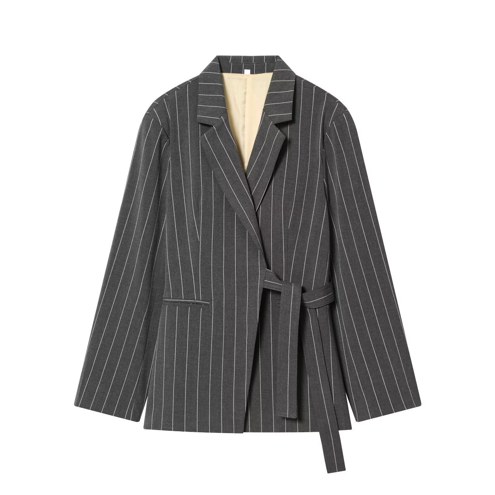 📚 欧美女装 港风复古条纹西装外套女宽松休闲系带裹身收腰西服春