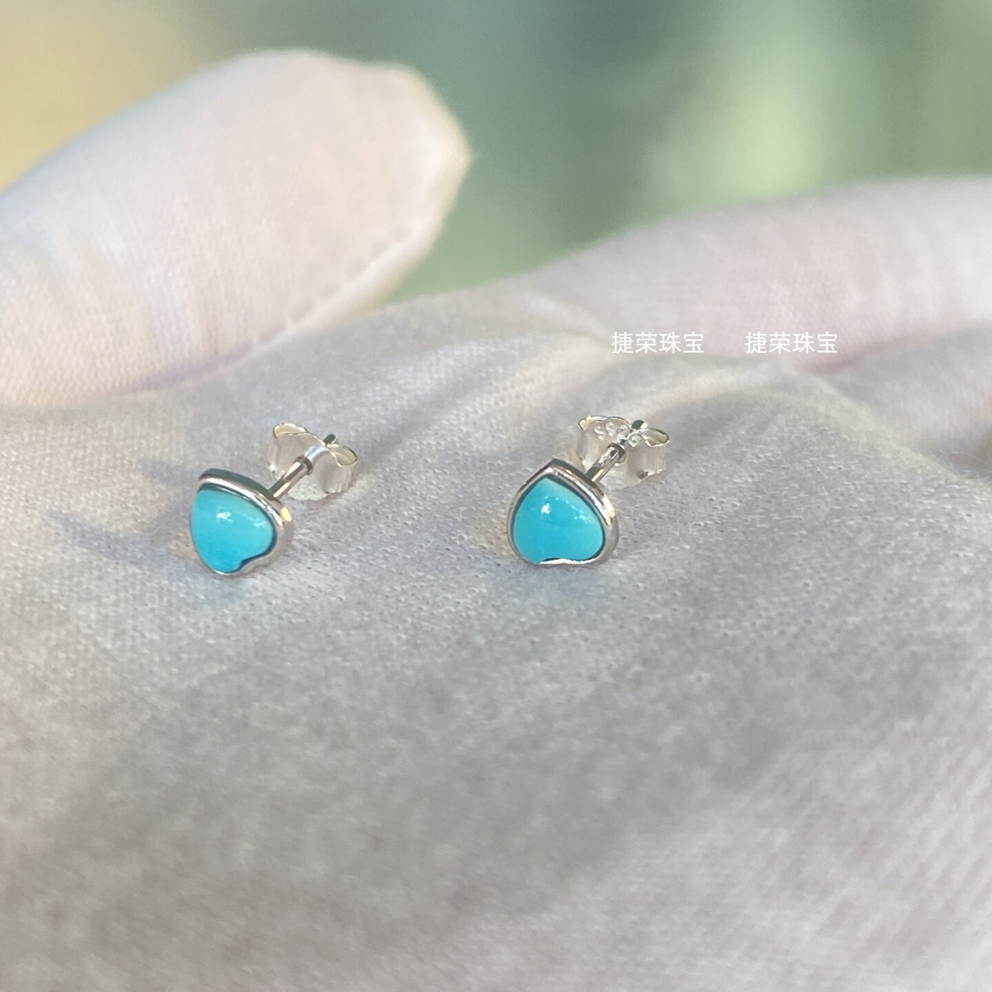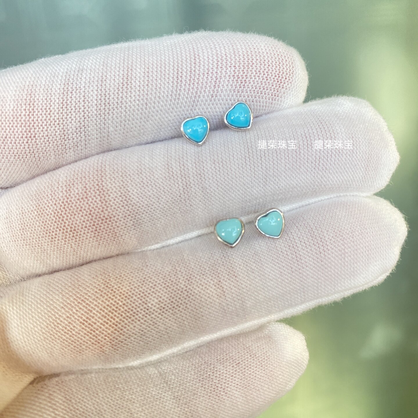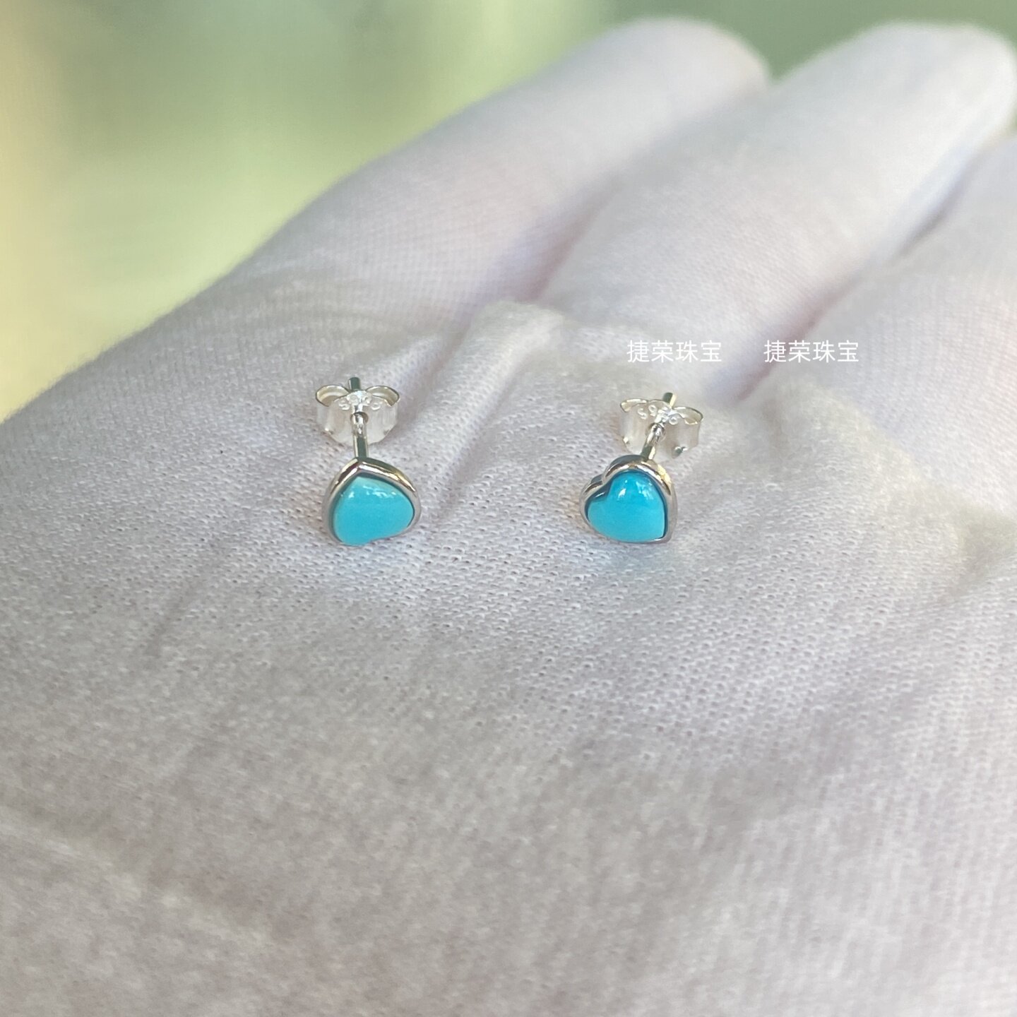 📚 天然原矿蓝绿松石爱心耳钉男女小巧精致925银色镶嵌日常百搭耳饰