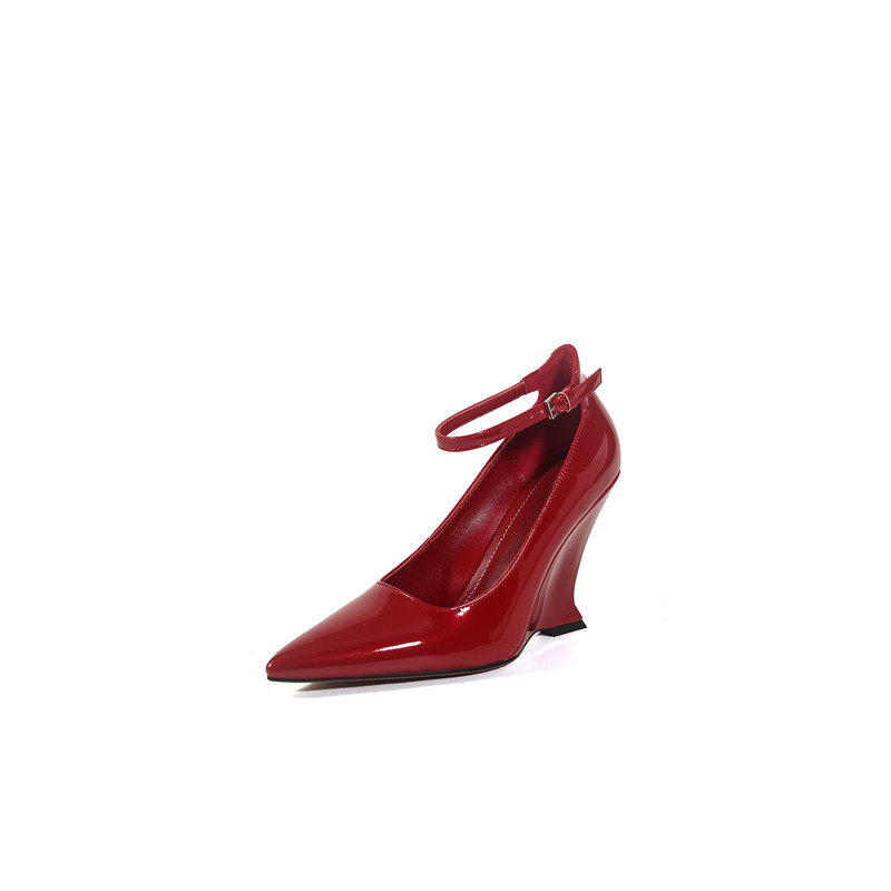 📚 9cm真皮小个子增高显瘦玛丽珍鞋女坡跟红色一字式单鞋尖头高跟鞋