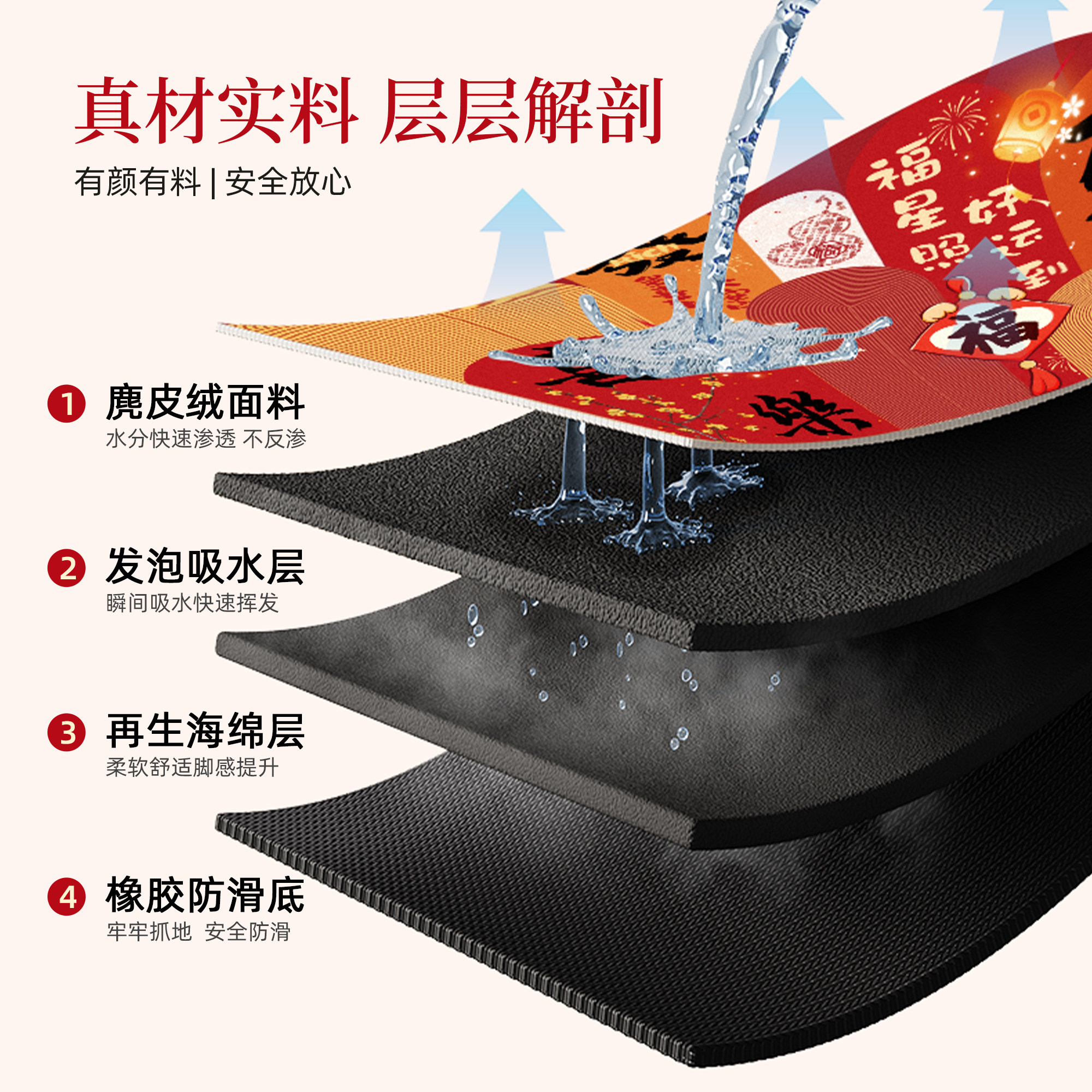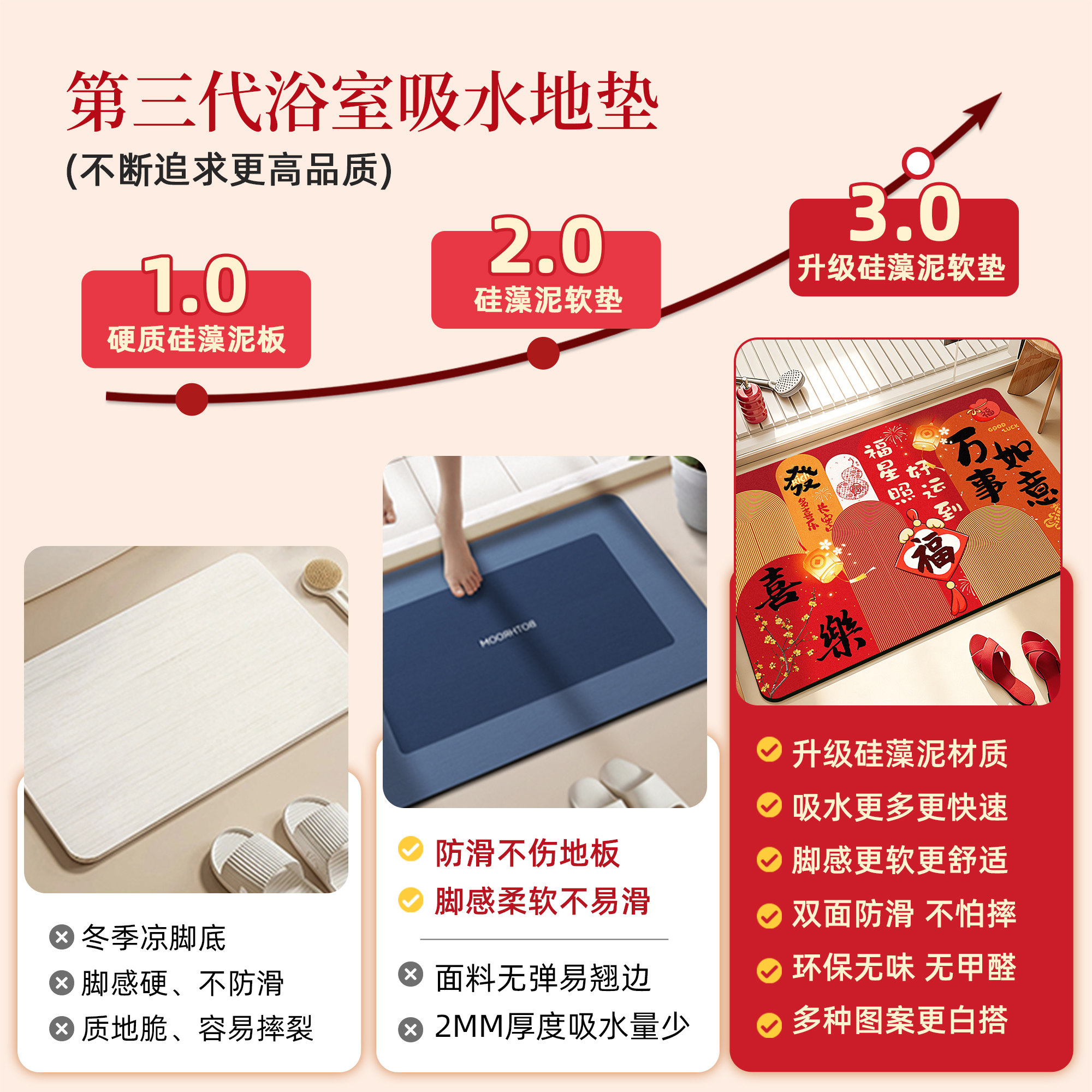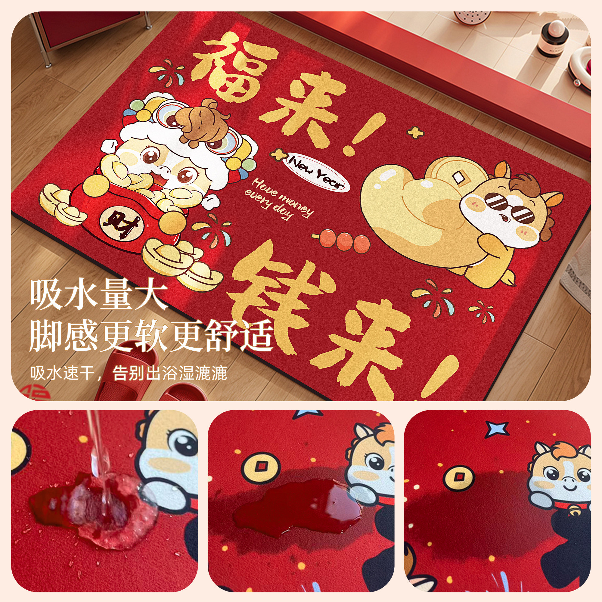 📚 红色喜庆浴室地垫卫生间吸水垫子新年硅藻泥家用防滑脚垫卫浴地毯