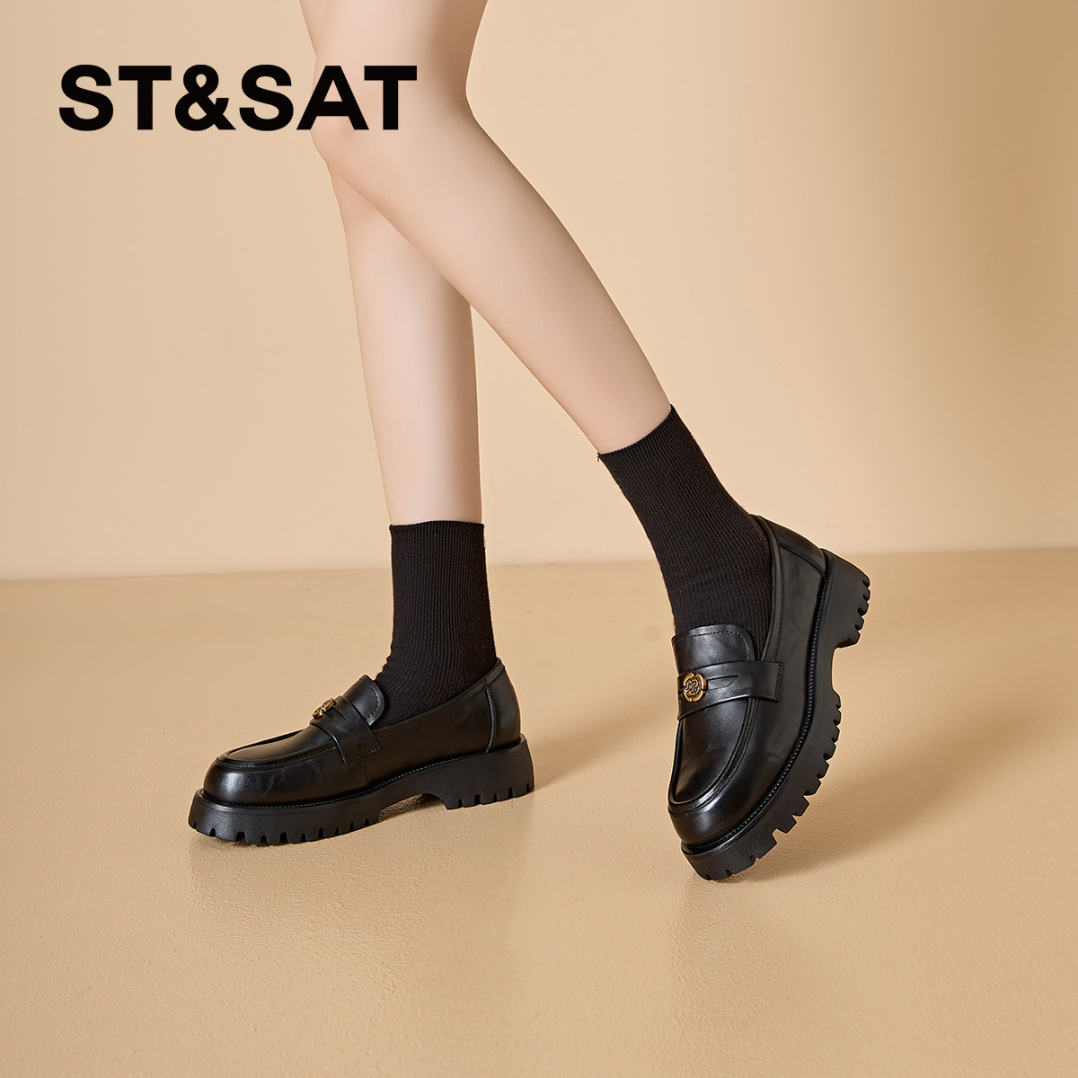 📚 星期六真皮乐福鞋女山茶花新款春季女鞋平底单鞋英伦风黑色小皮鞋