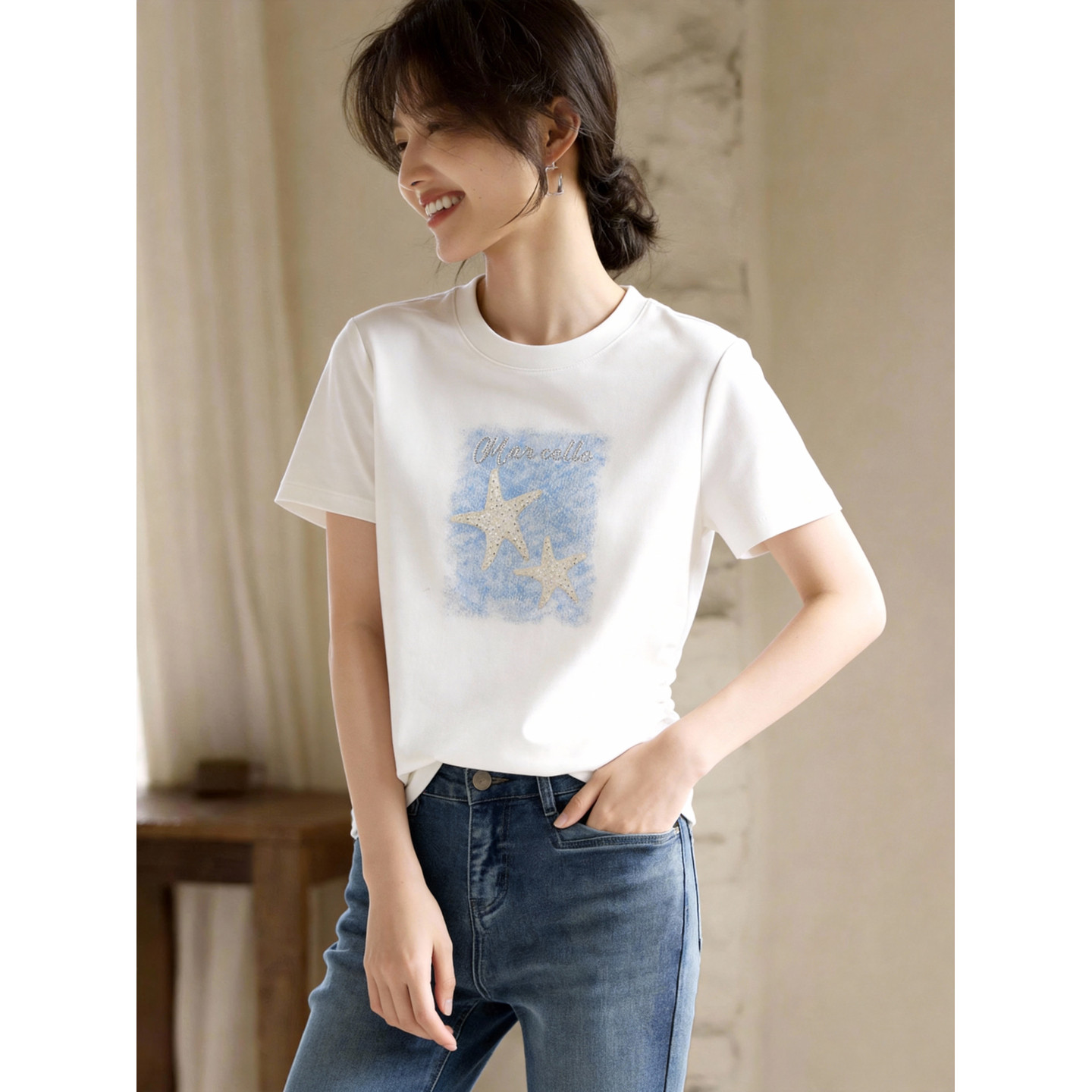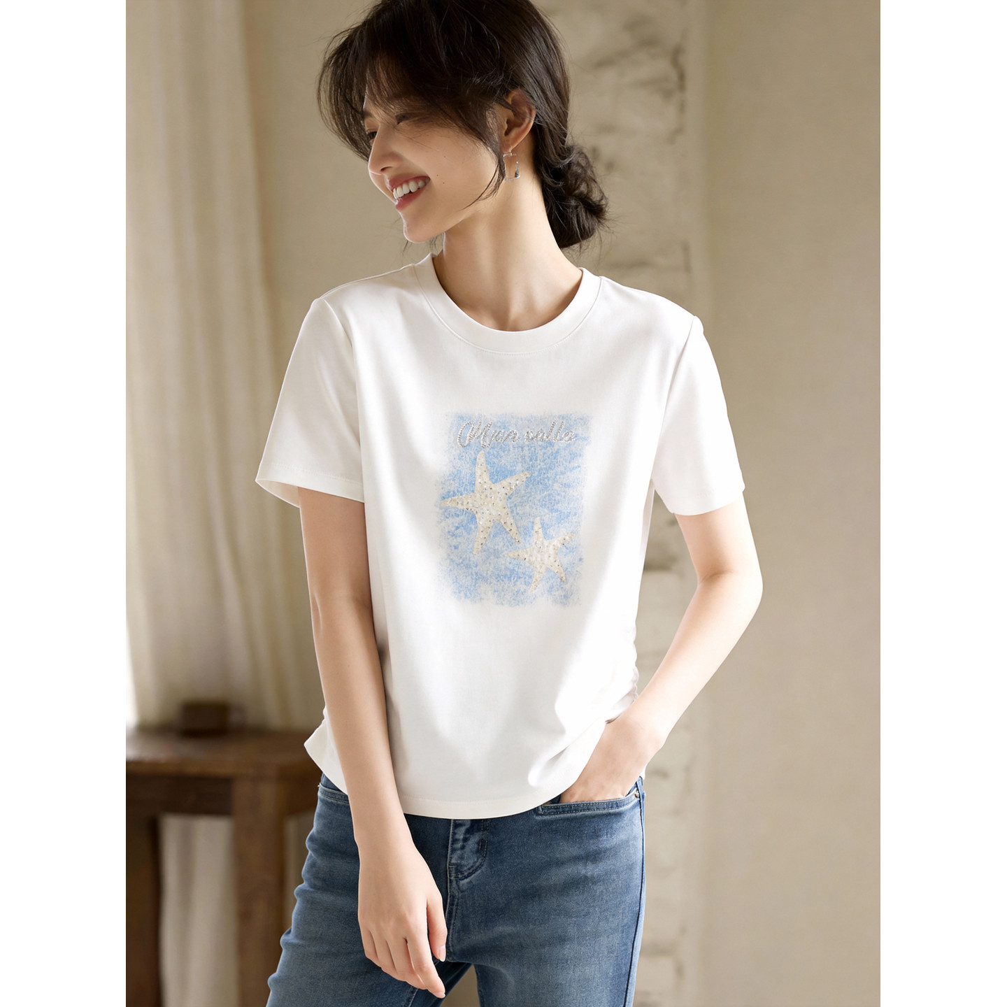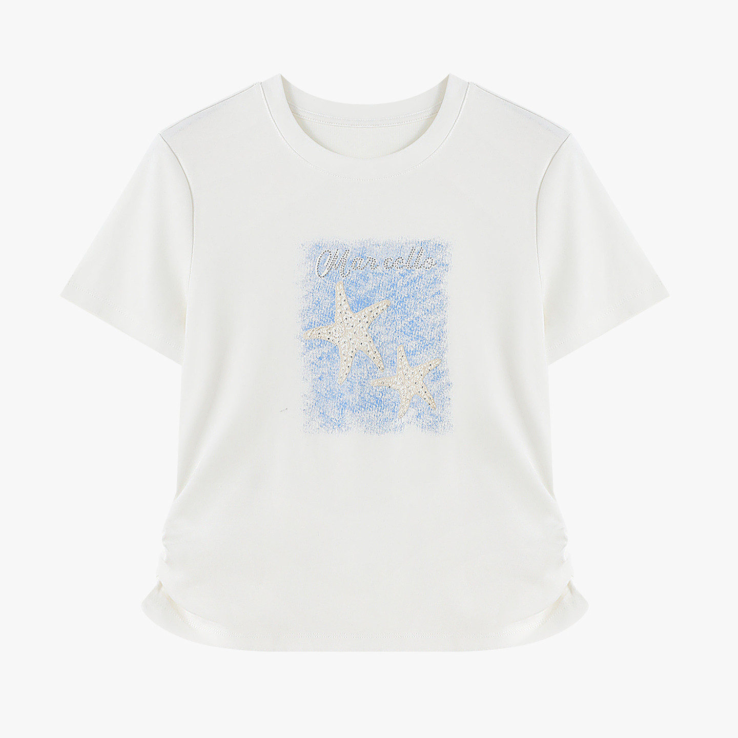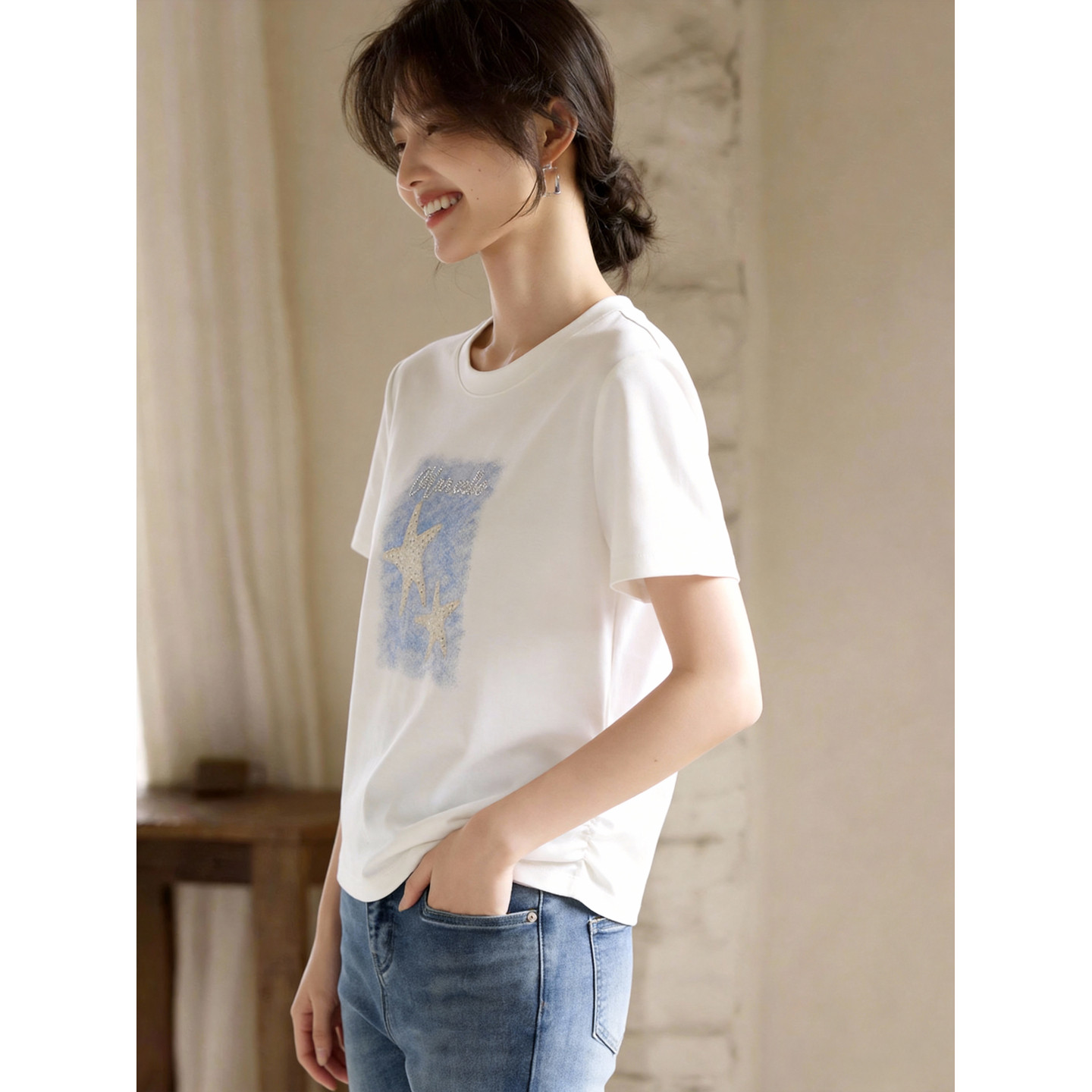 📚 百家好印花白色短袖T恤女春夏新款显瘦内搭圆领正肩收腰捏褶上衣