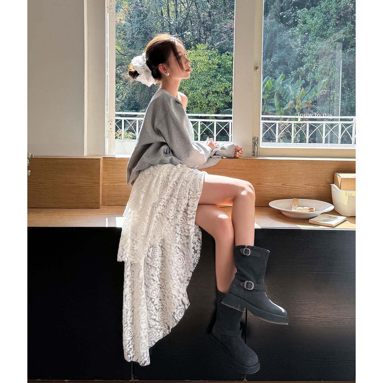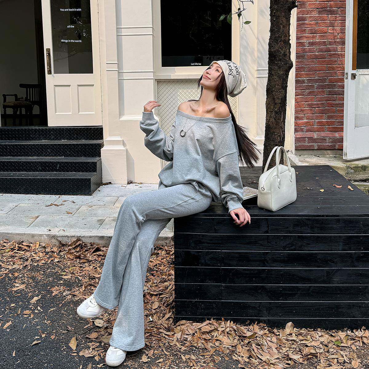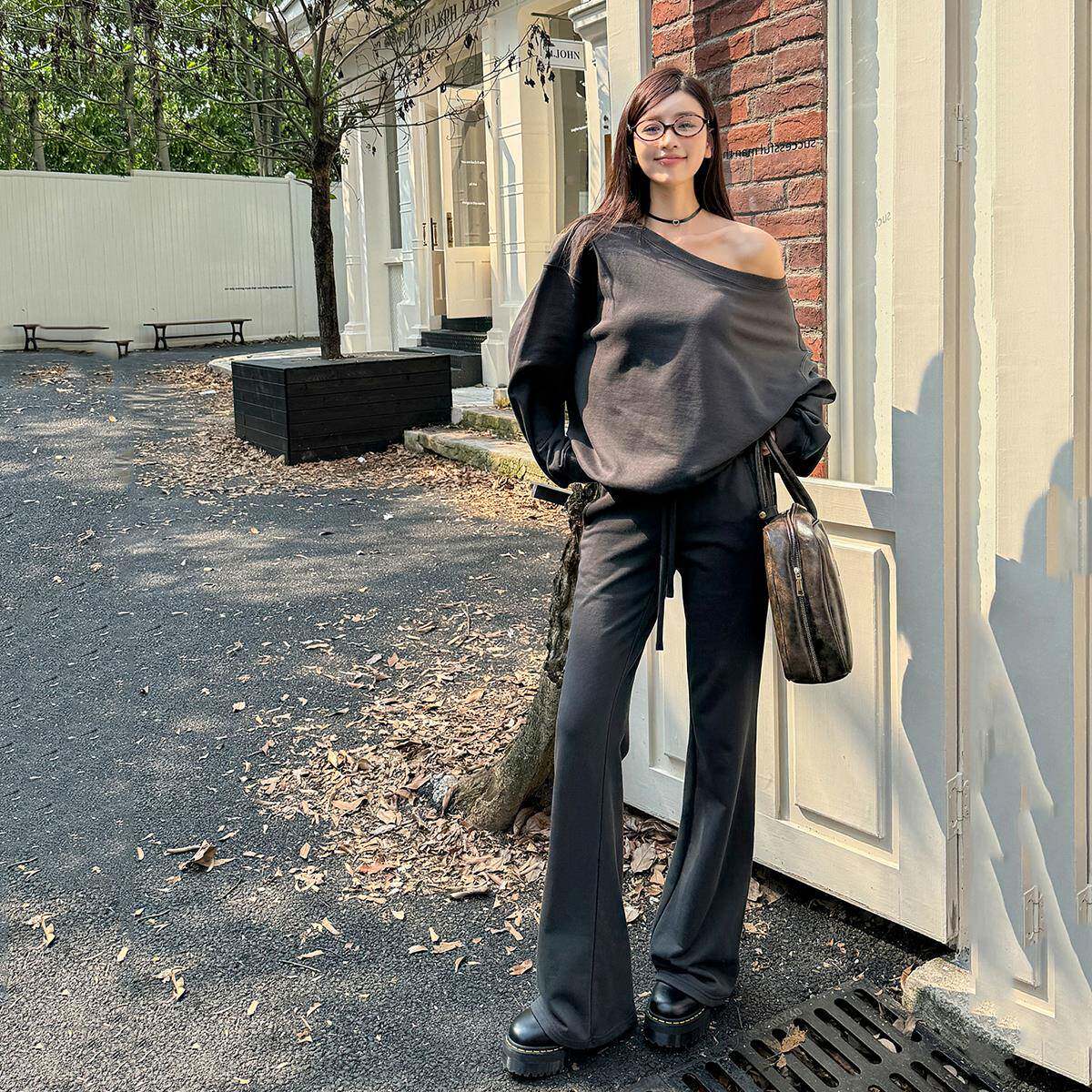 📚 浅布调QBD 春秋新款大圆领斜肩卫衣灰色慵懒感宽松显瘦长袖上衣女