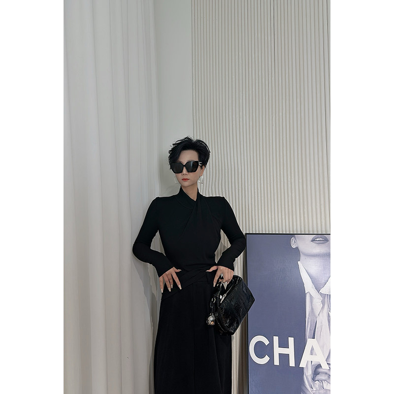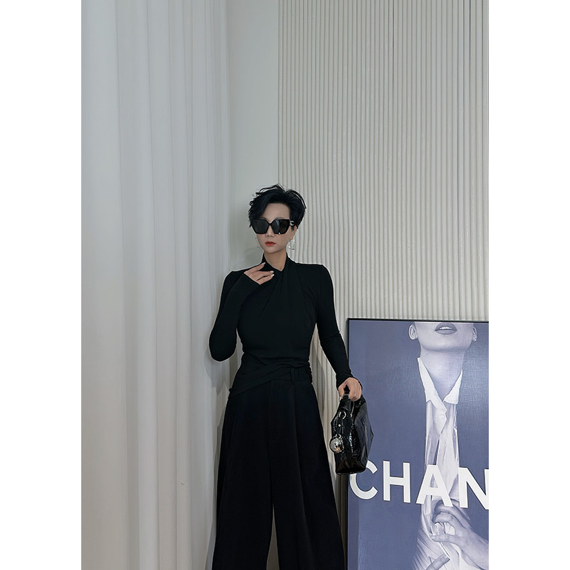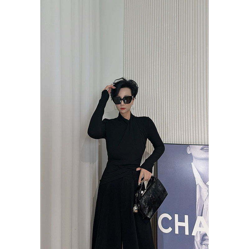 📚 Dan Dan 黑色高级感领子褶皱设计感长袖T恤女 法式显瘦上衣