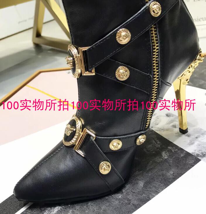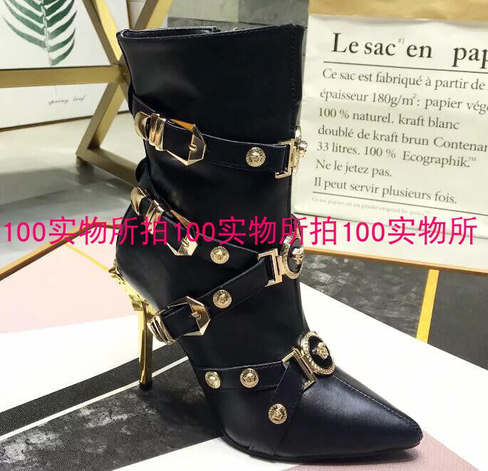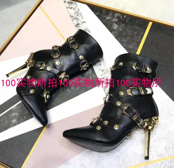 📚 欧洲站新款金属铆钉女靴皮带扣细跟高跟短筒侧拉链性感真皮短靴潮
