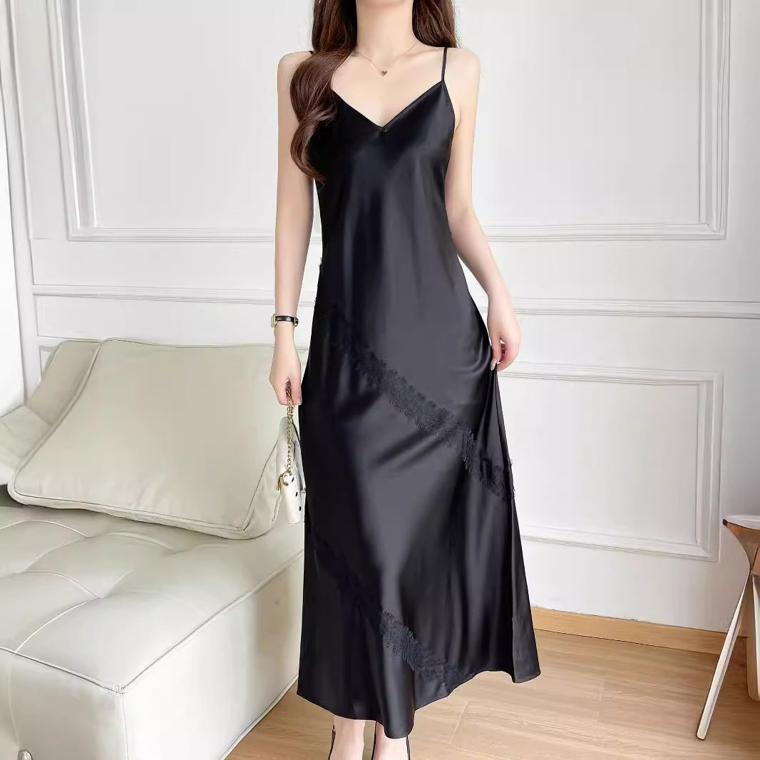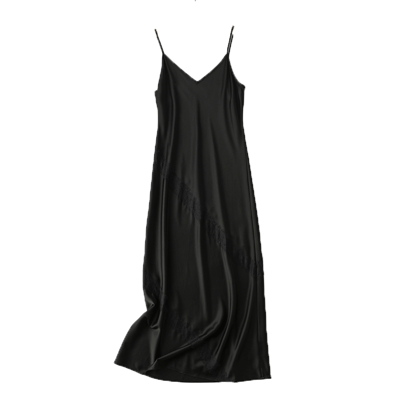 📚 轻奢斜裁真丝吊带重磅22姆米素绸锻连衣裙V领蕾丝拼接蚕丝长裙女