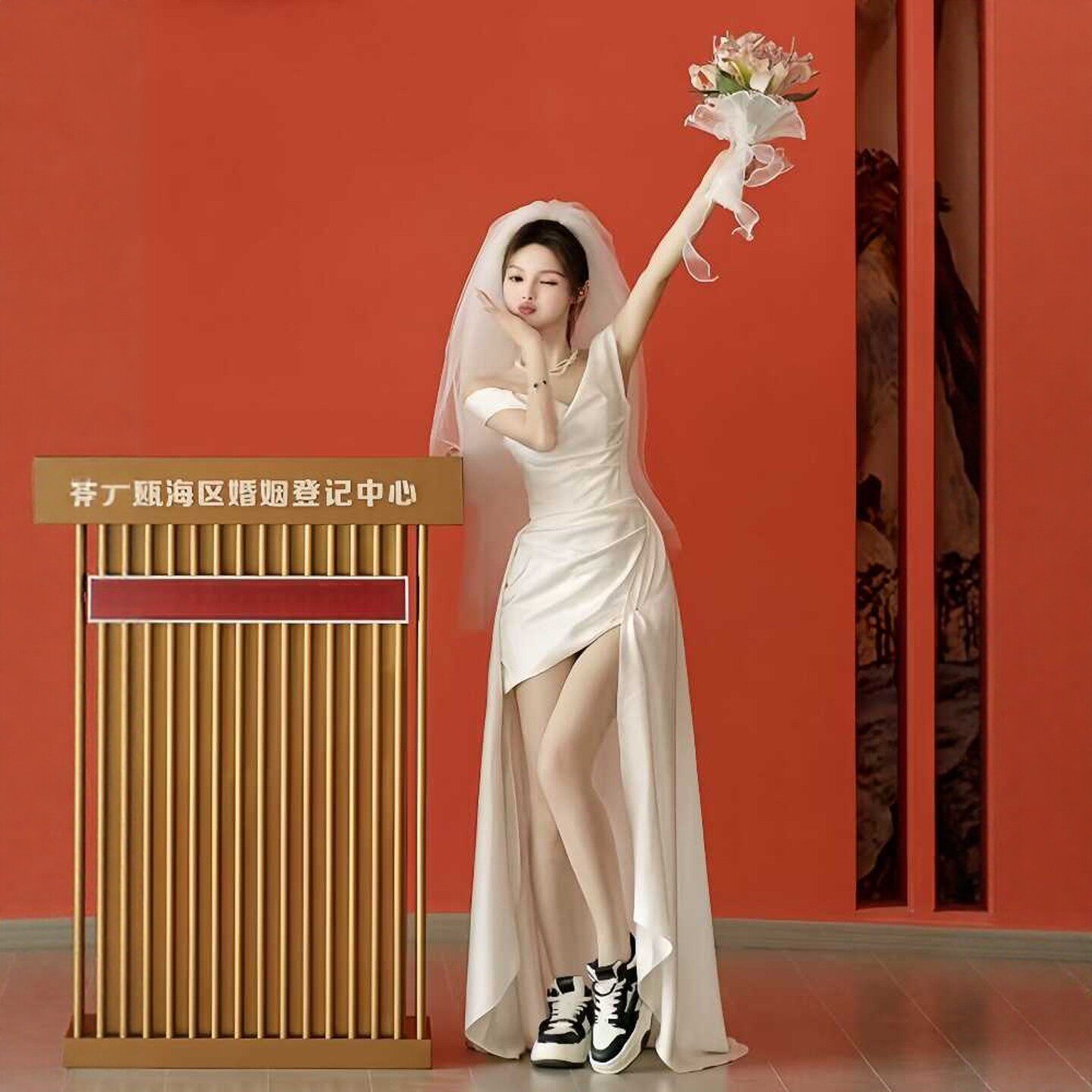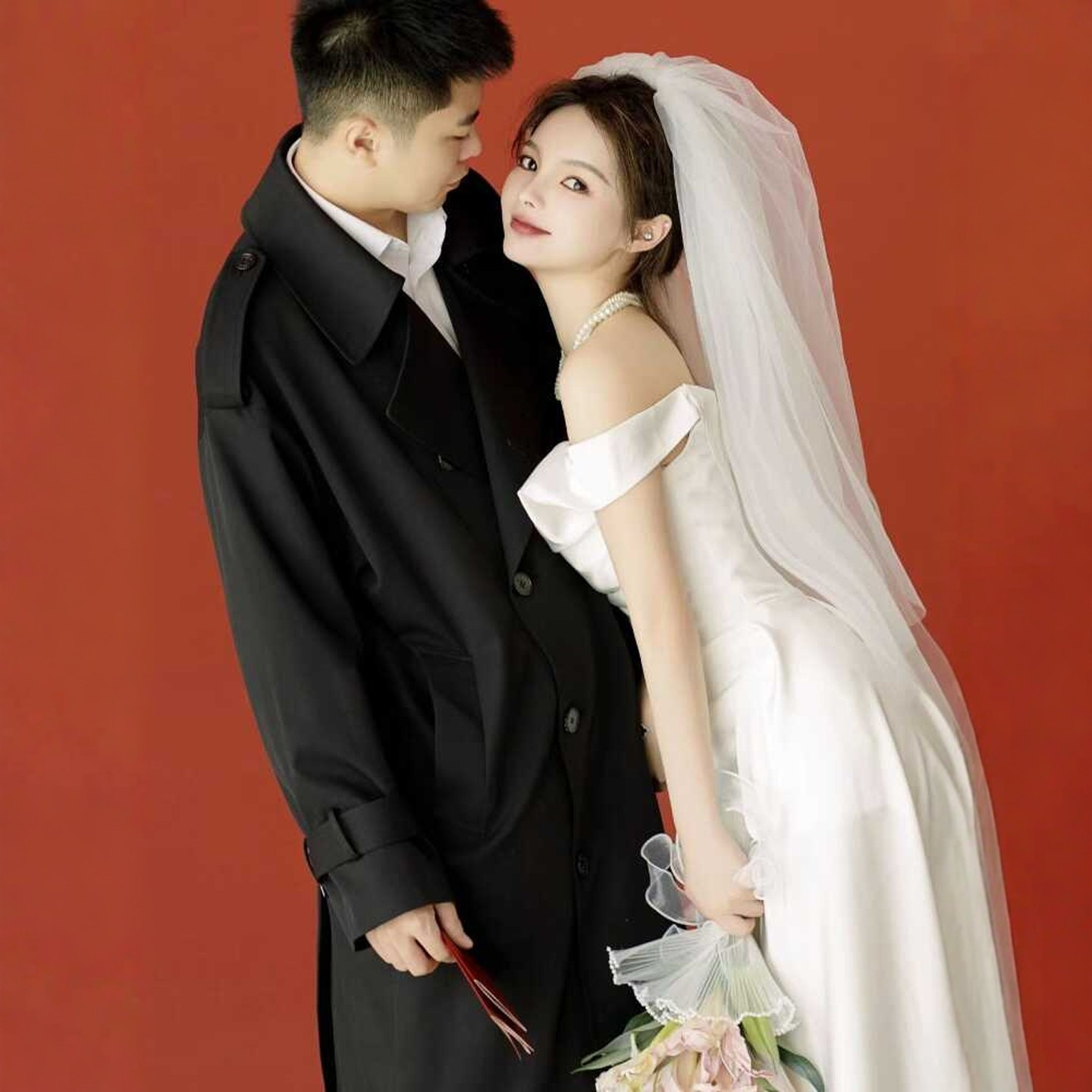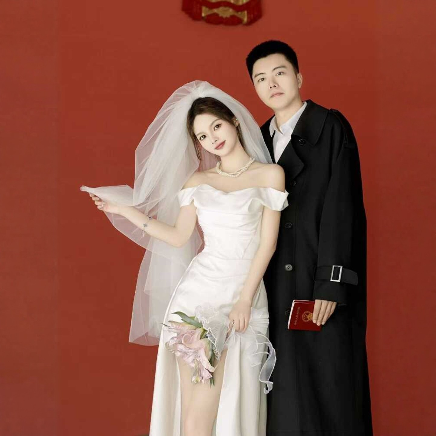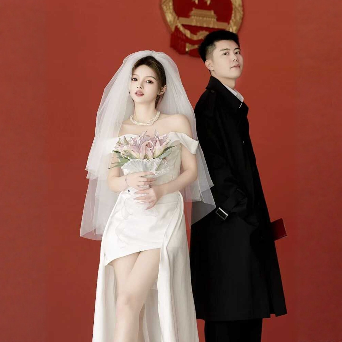📚 海棠记一字肩法式轻婚纱缎面高级感鱼尾小个子领证小白裙订婚礼服