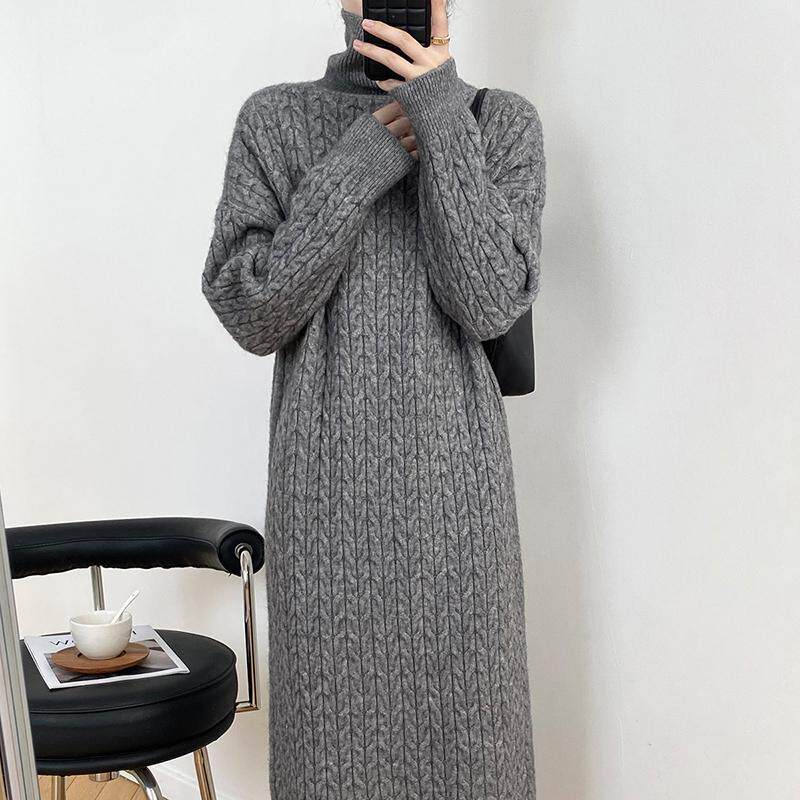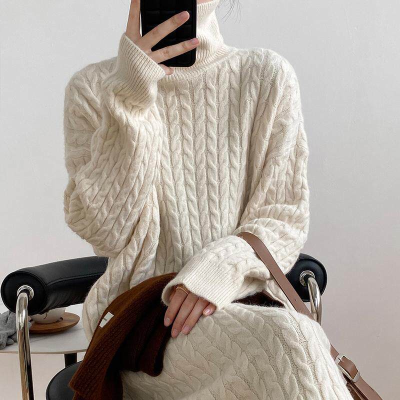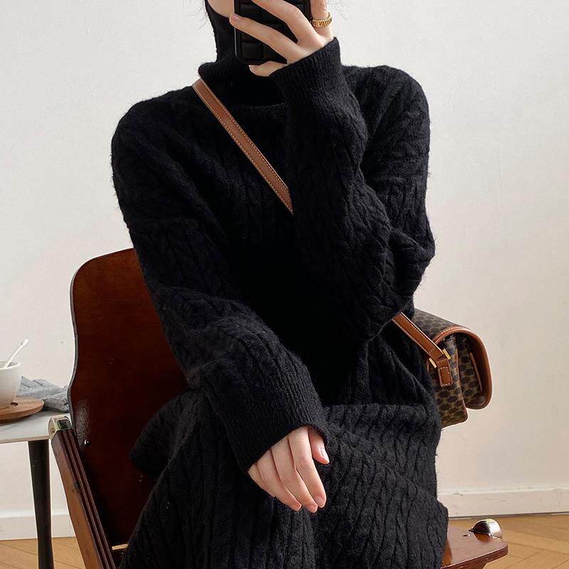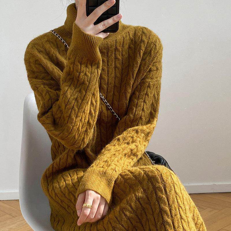 📚 重磅加厚中长100%纯羊毛连衣裙女高领麻花宽松羊绒衫过膝毛衣长裙
