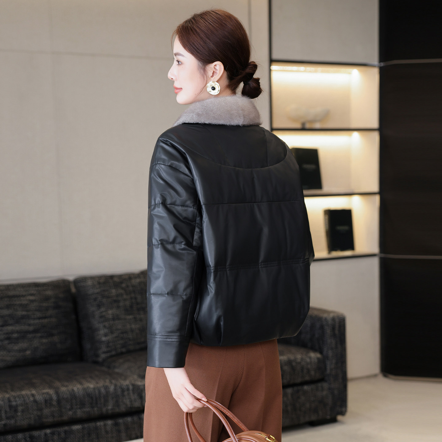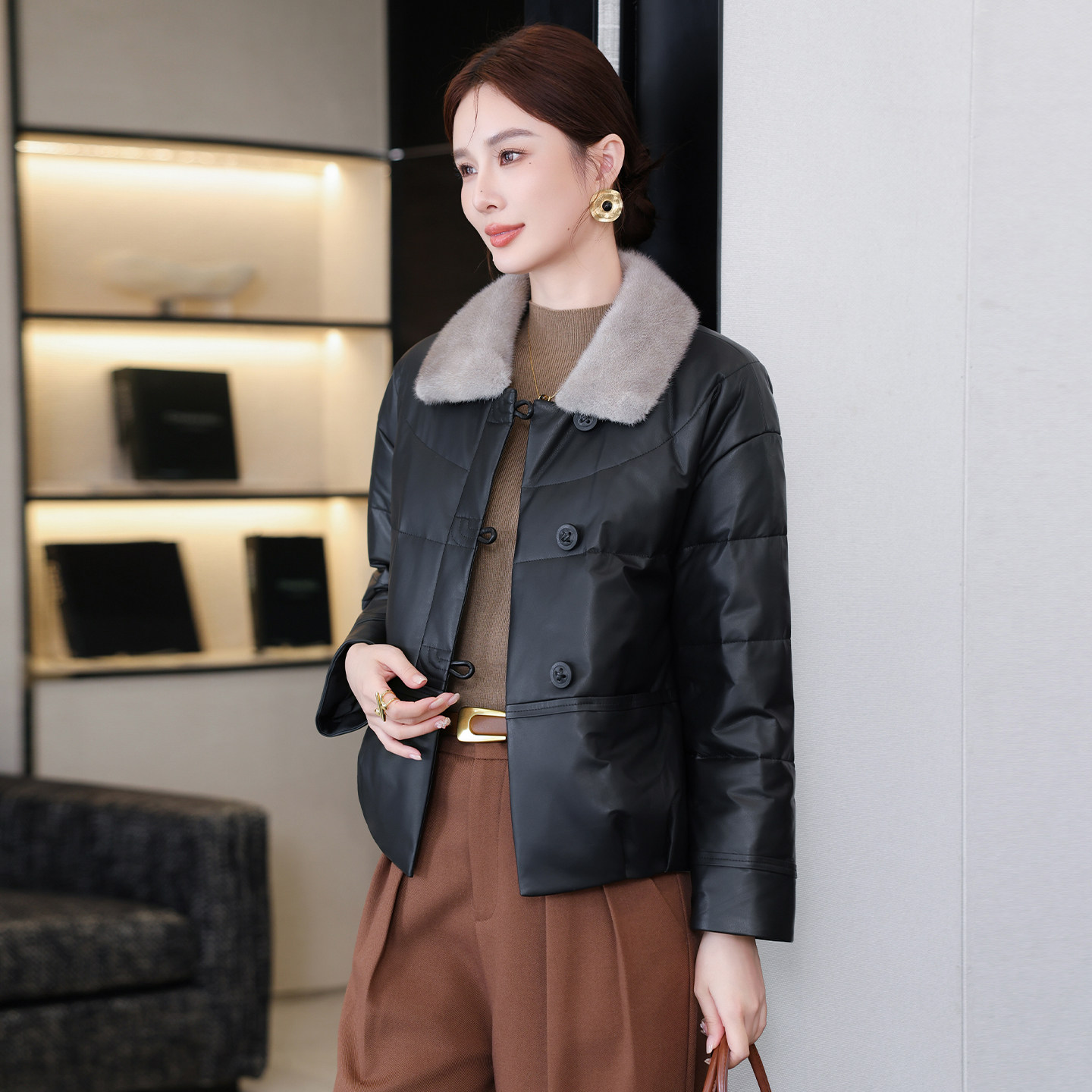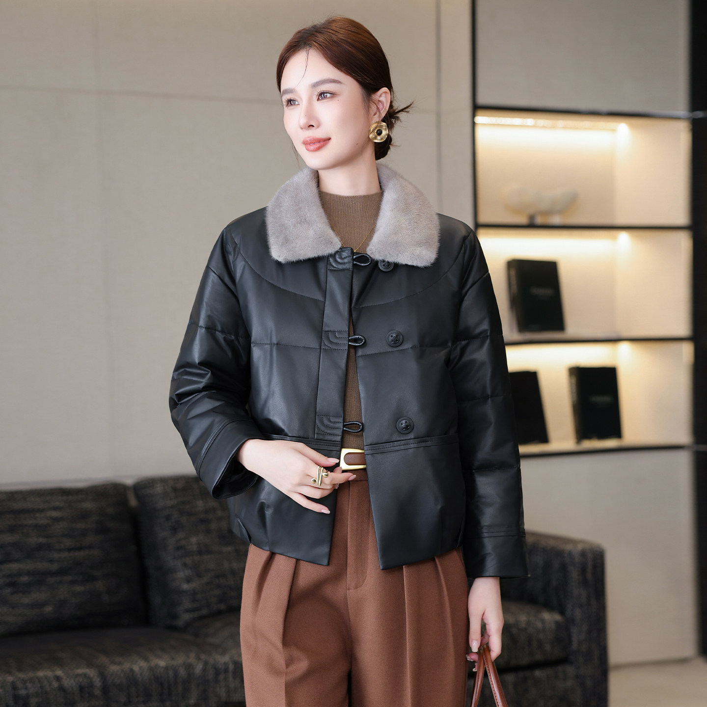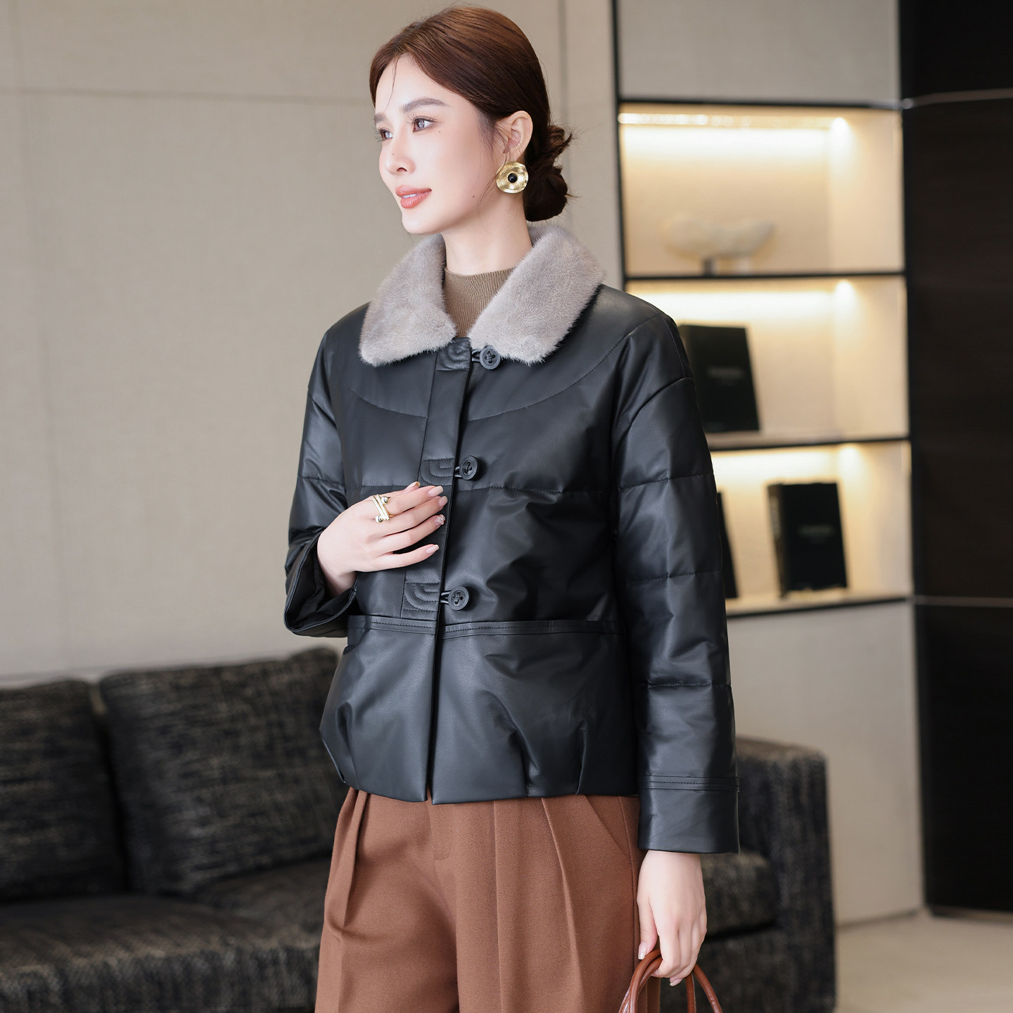 📚 海宁真皮羽绒服皮衣女短款冬季水貂毛领绵羊皮夹克新款黑色外套
