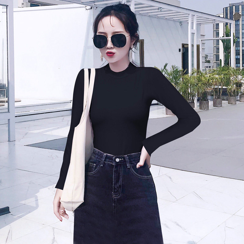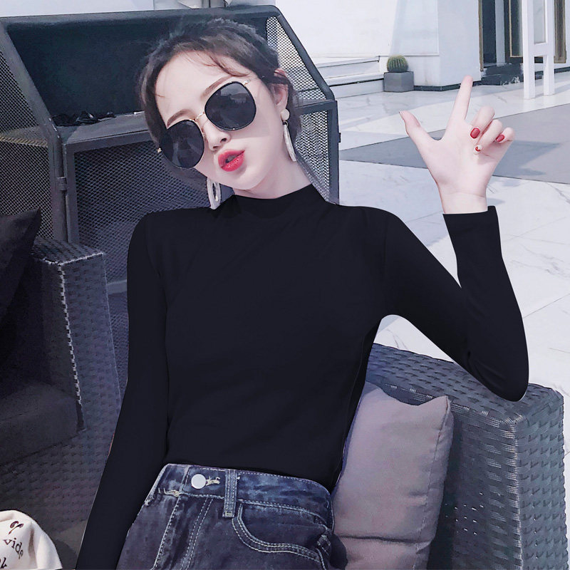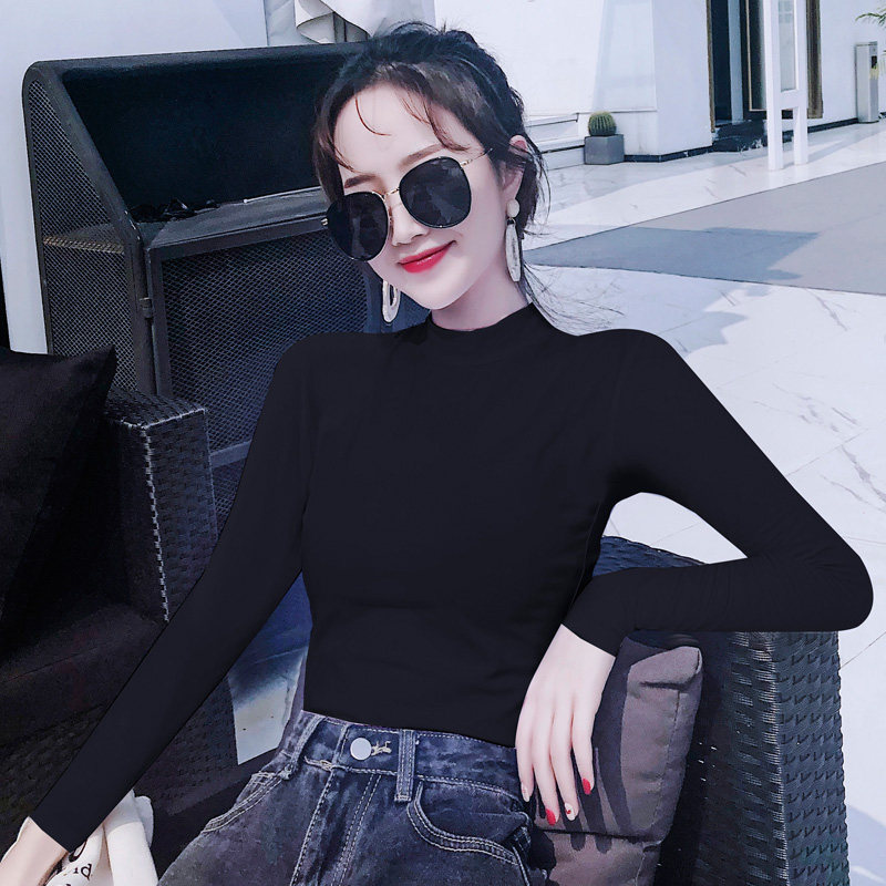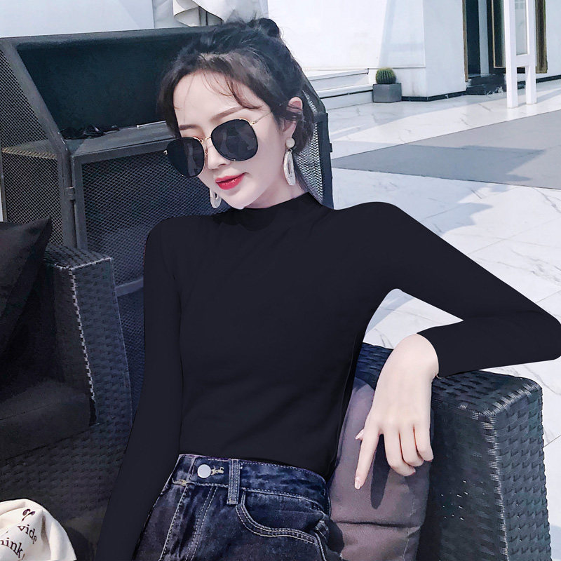 📚 短款长袖T恤女加绒加厚紧身棉内搭打底衫春秋冬中领小半高领上衣