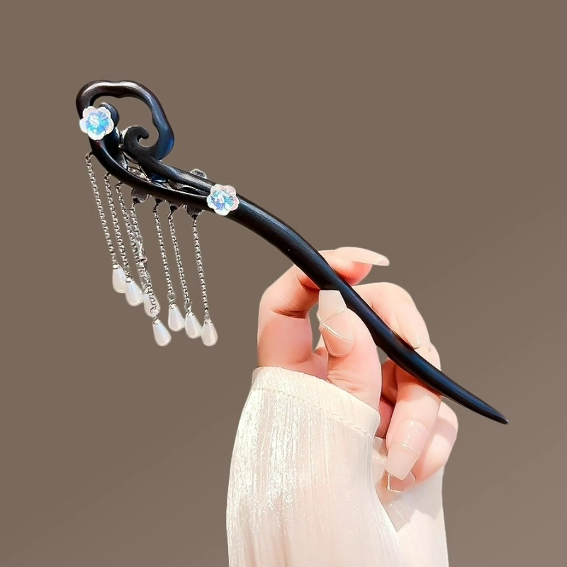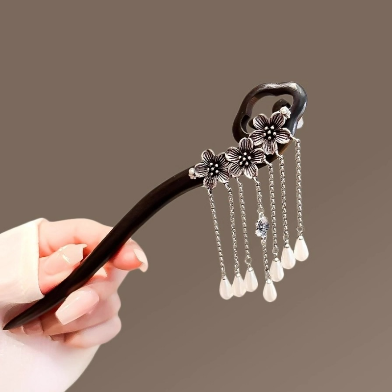 📚 古风黑檀木发簪女祥云古银花朵流苏步摇气质盘发簪子高级感发钗