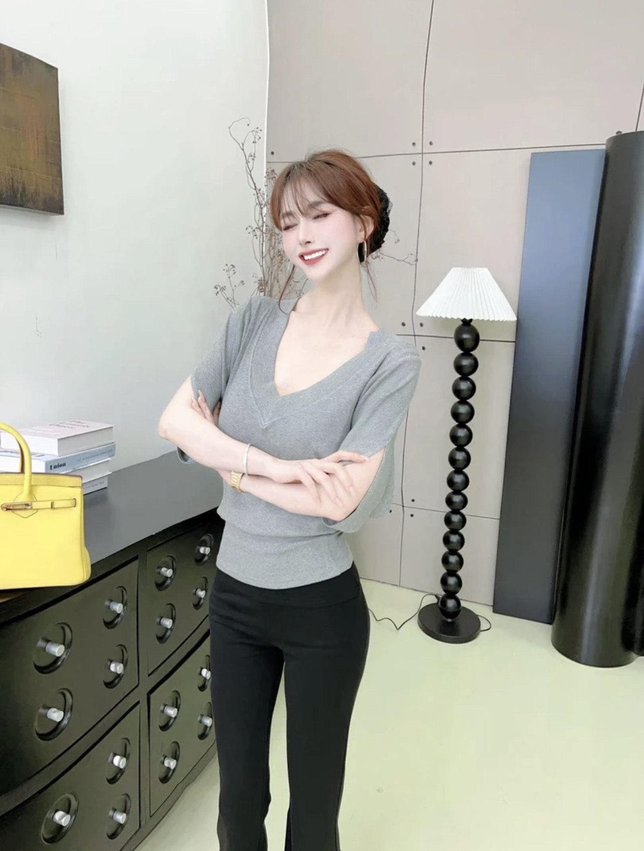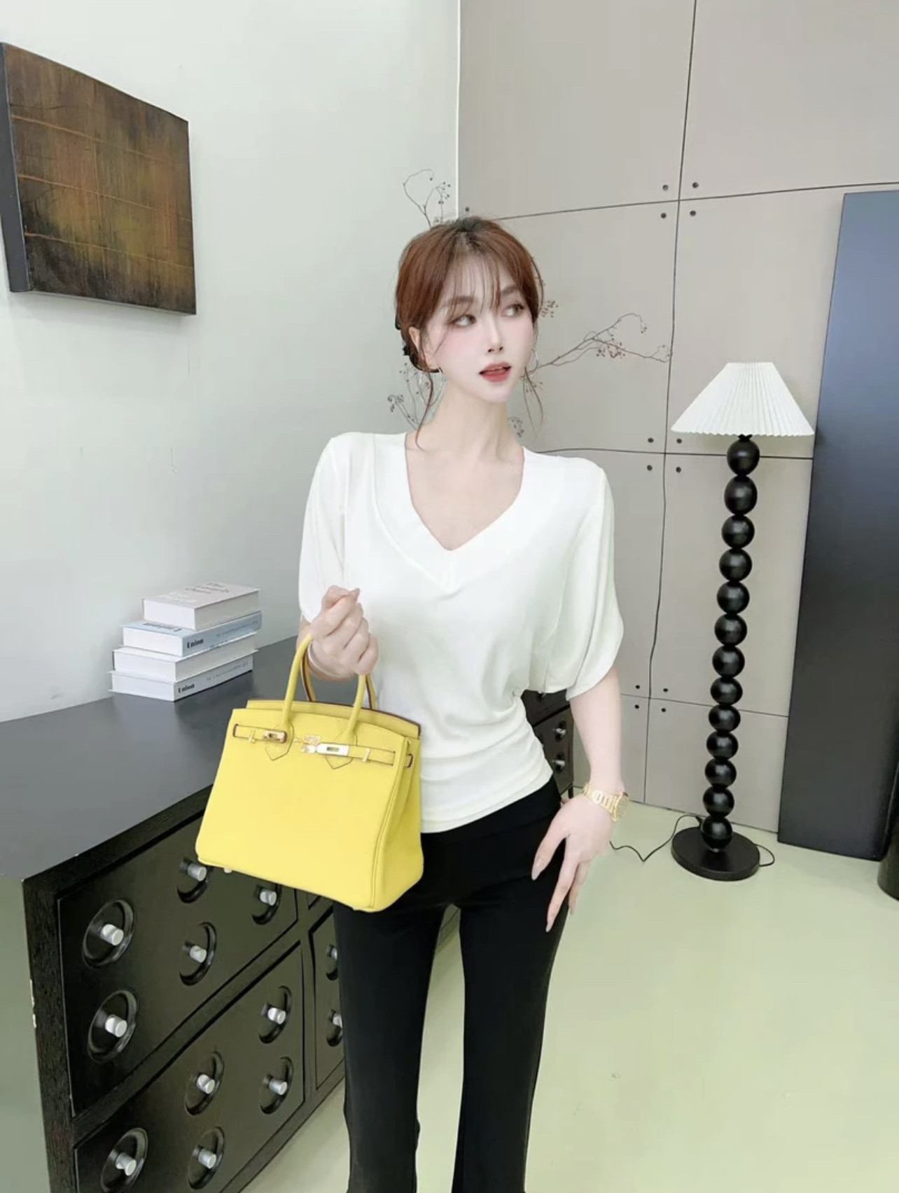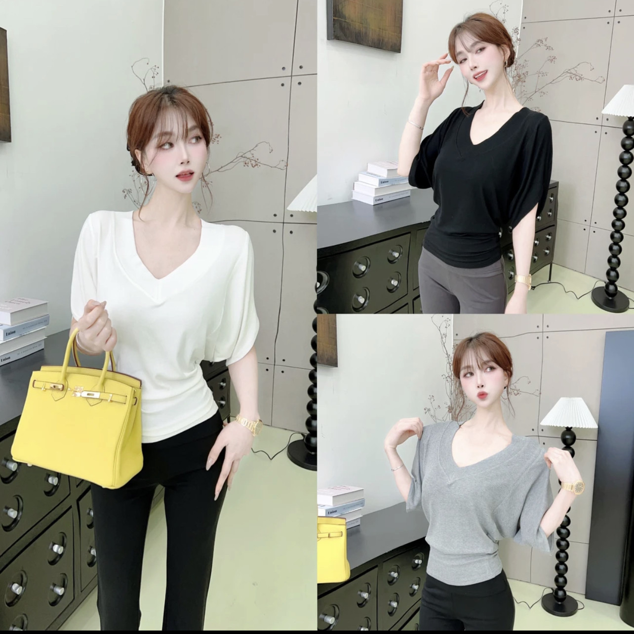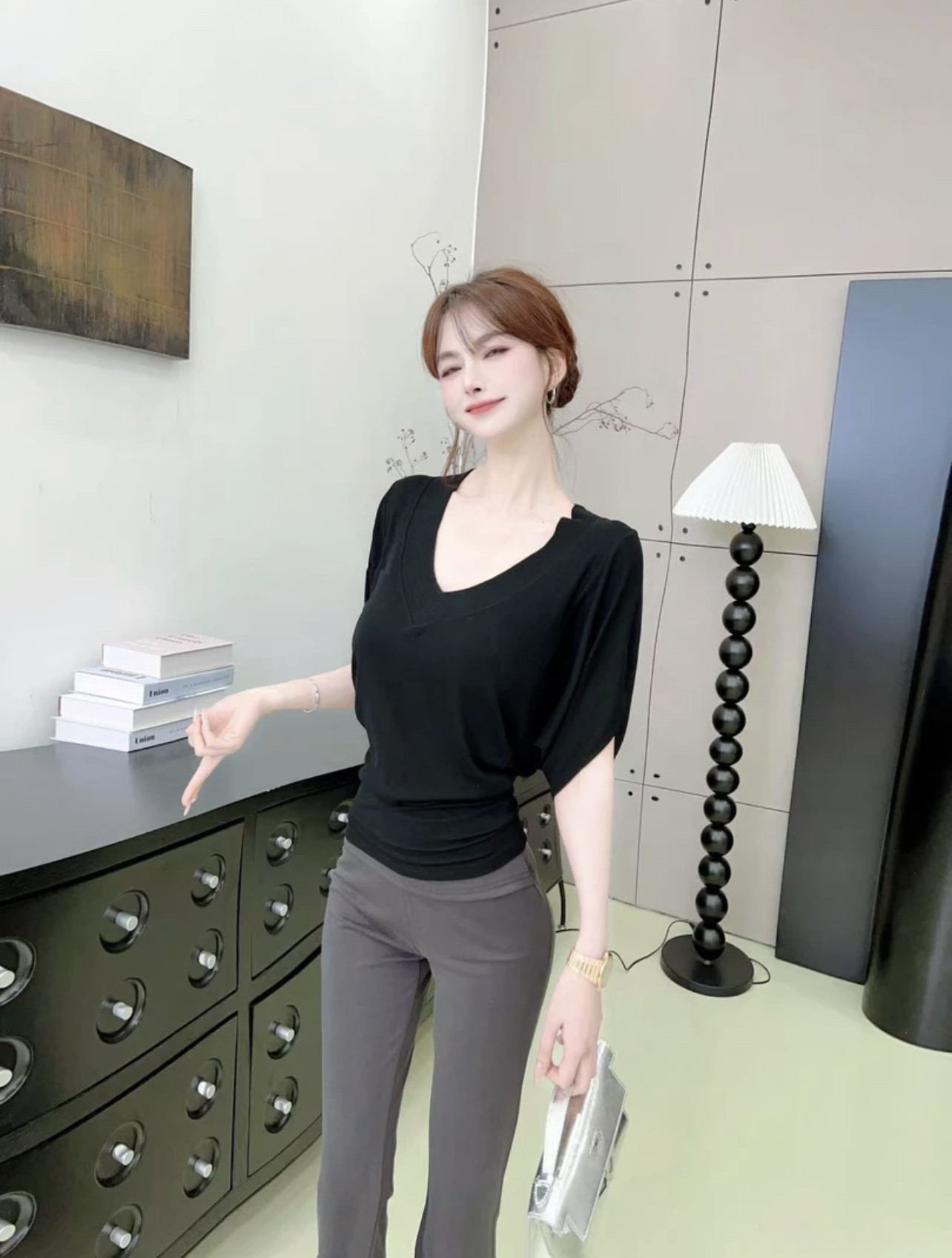 📚 卡卡正品《具象松弛》夏季螺纹宽V领短袖女蝙蝠袖罩衫针织打底衫