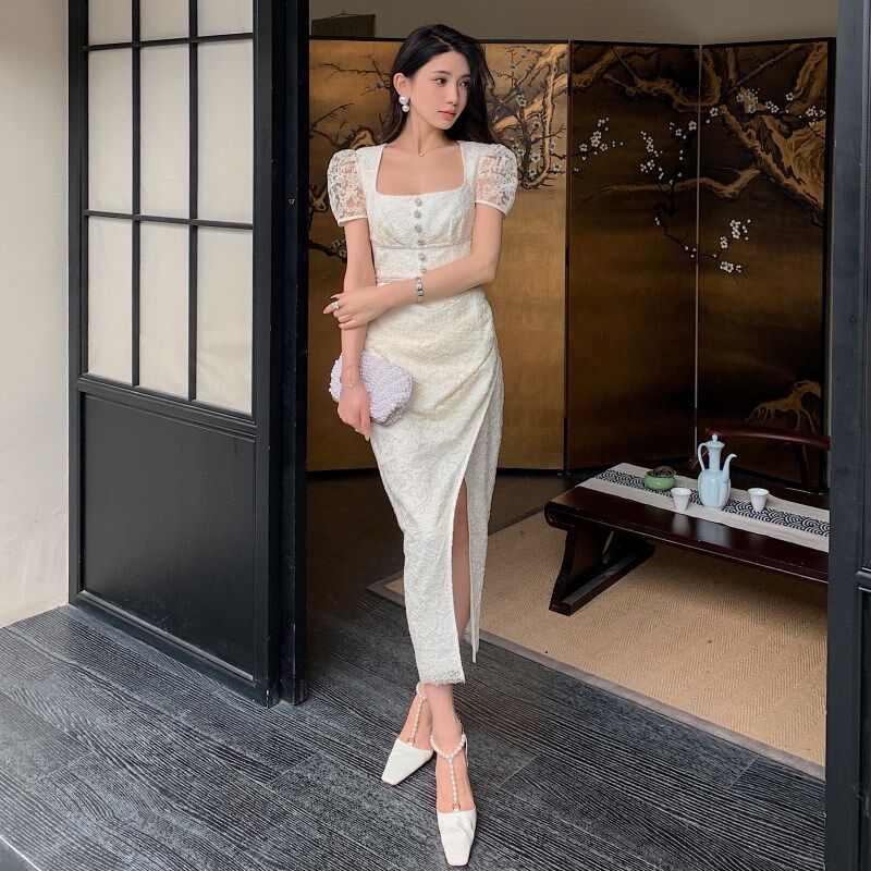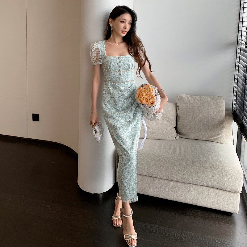 📚 时尚知性优雅风穿搭开叉方领短袖蕾丝连衣裙气质修身长裙子女秋季
