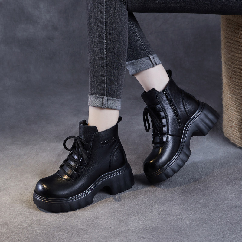 📚 头层牛皮小短靴女2025秋冬厚底马丁靴英伦风高跟粗跟真皮加绒棉鞋