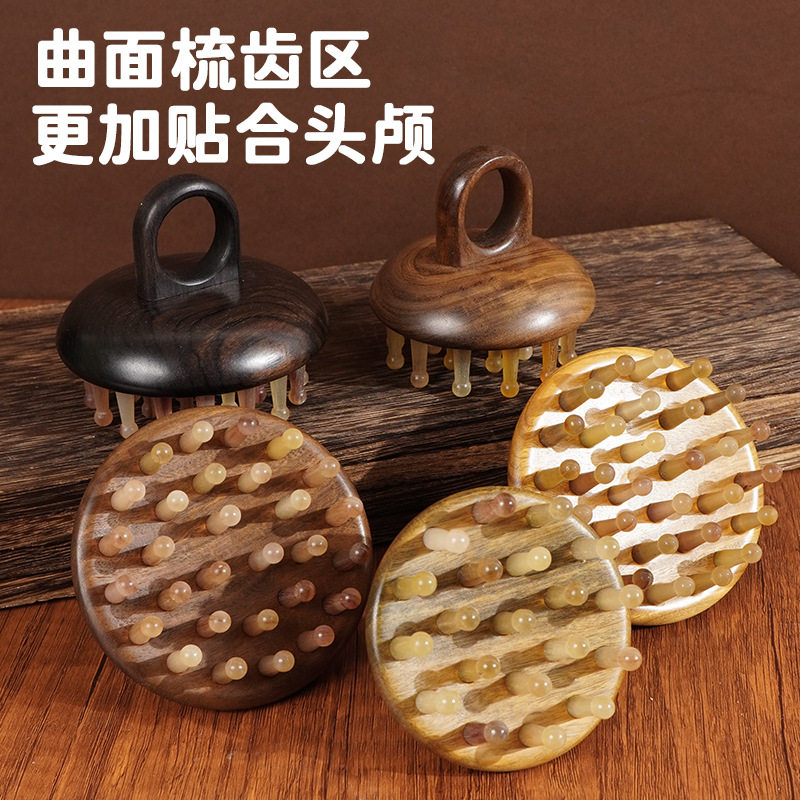 📚 绿檀木羊角齿圆盘头疗按摩梳子按摩头部肩颈刮痧经络疏指环羊角梳