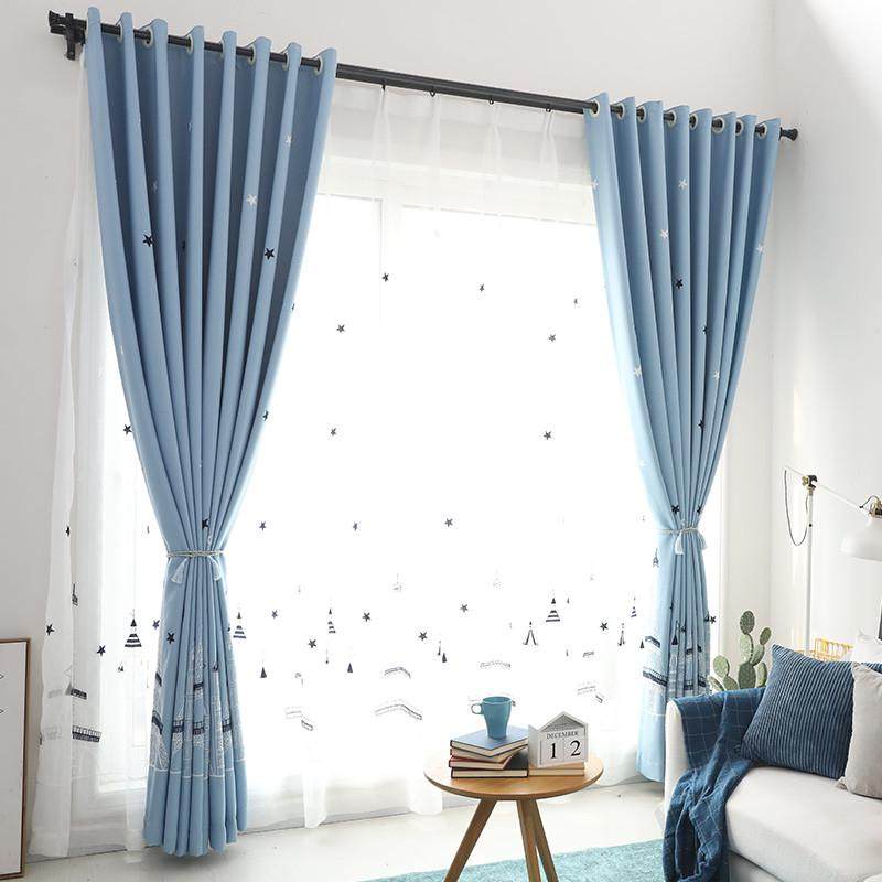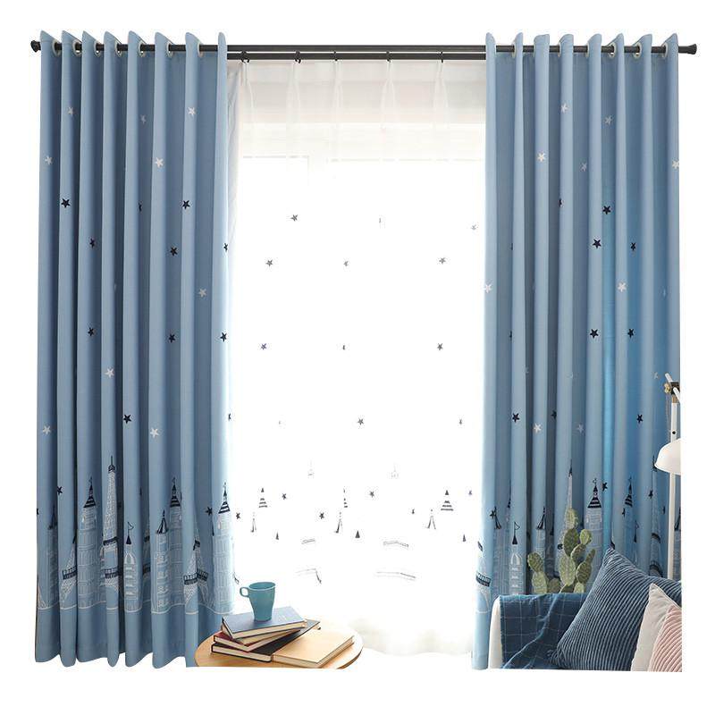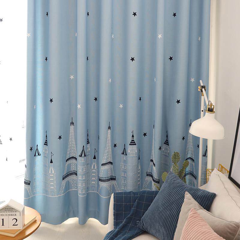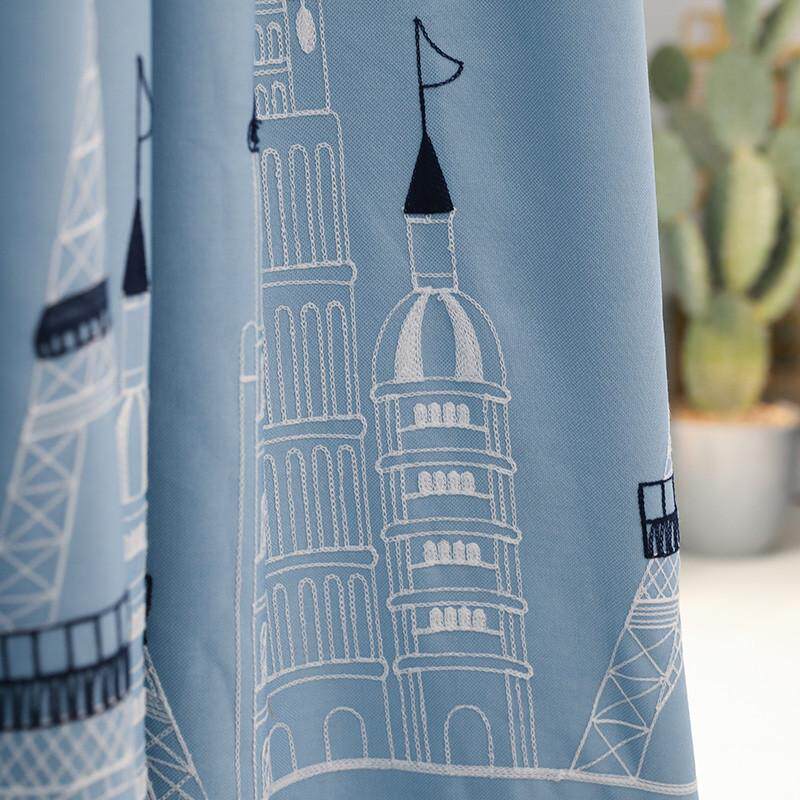 📚 蓝色地中海城堡棉麻绣花飘窗遮光儿童房男孩卧室窗帘成品简约现代