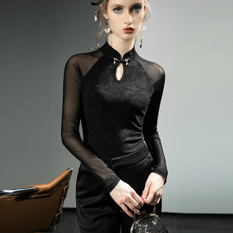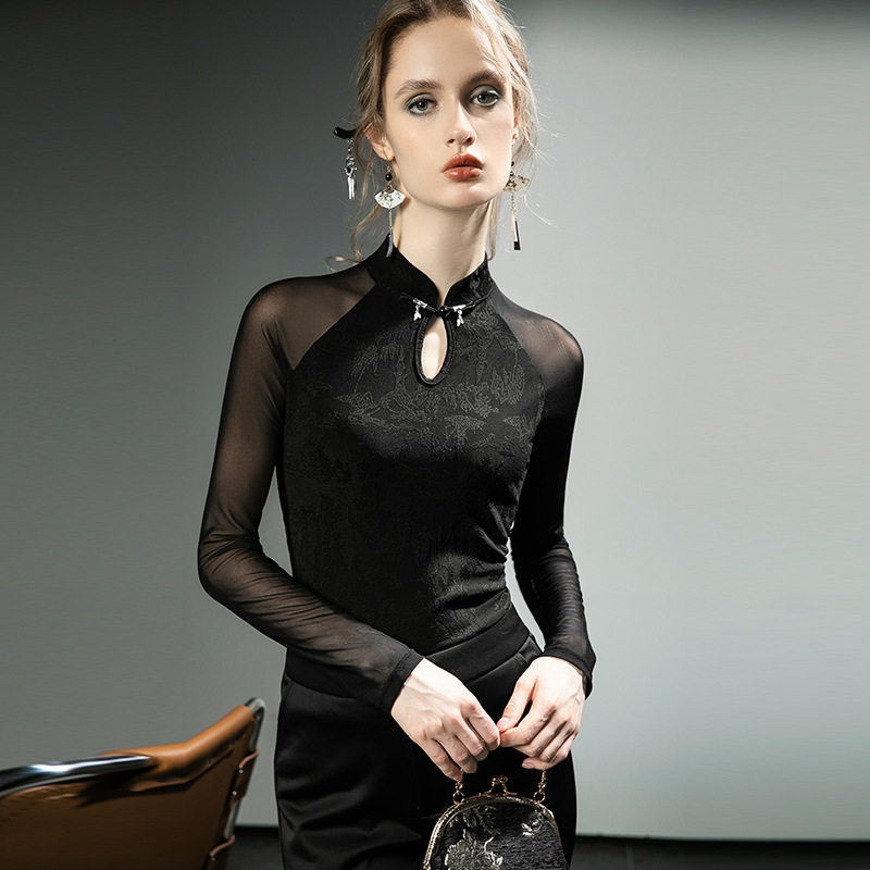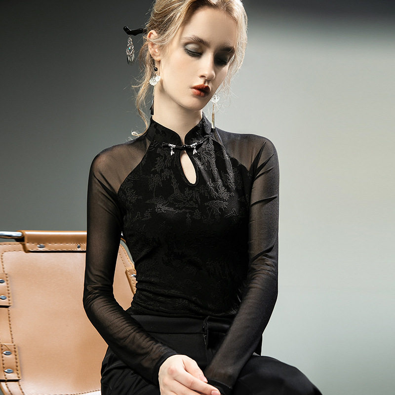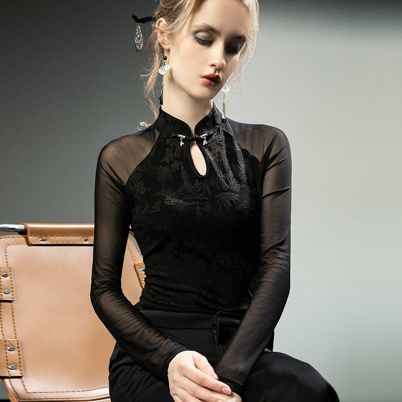 📚 新中式盘扣镂空上衣女秋新款复古印花微透蕾丝网纱长袖t恤打底衫