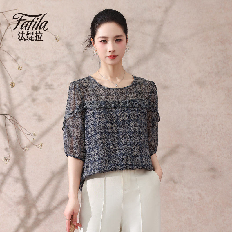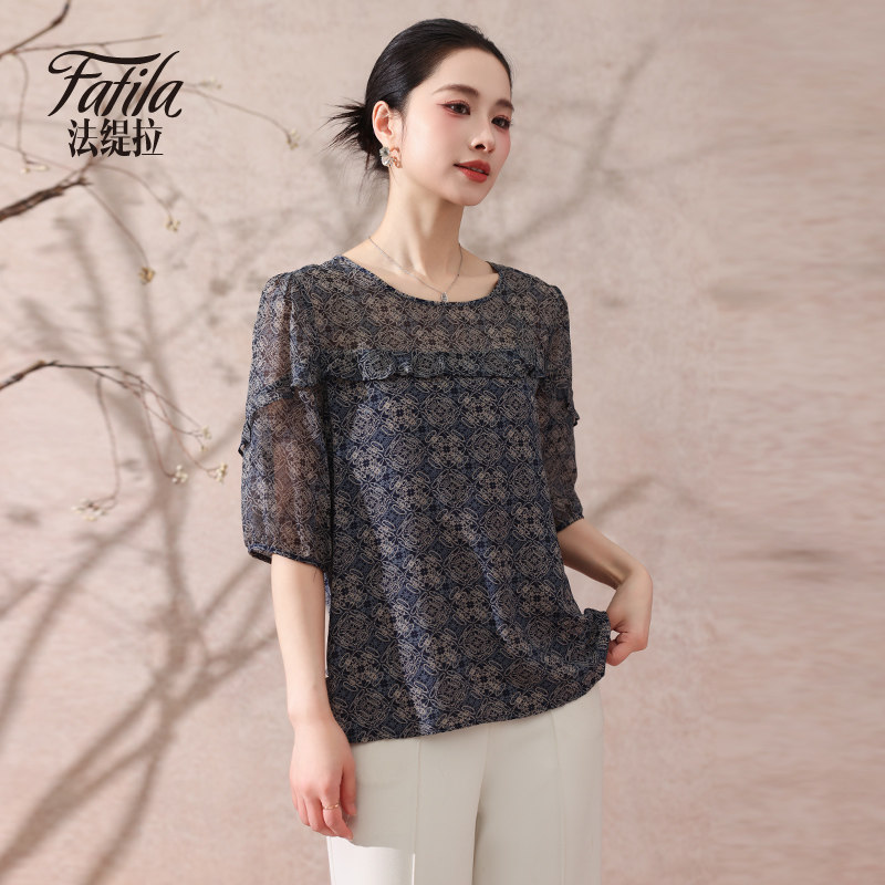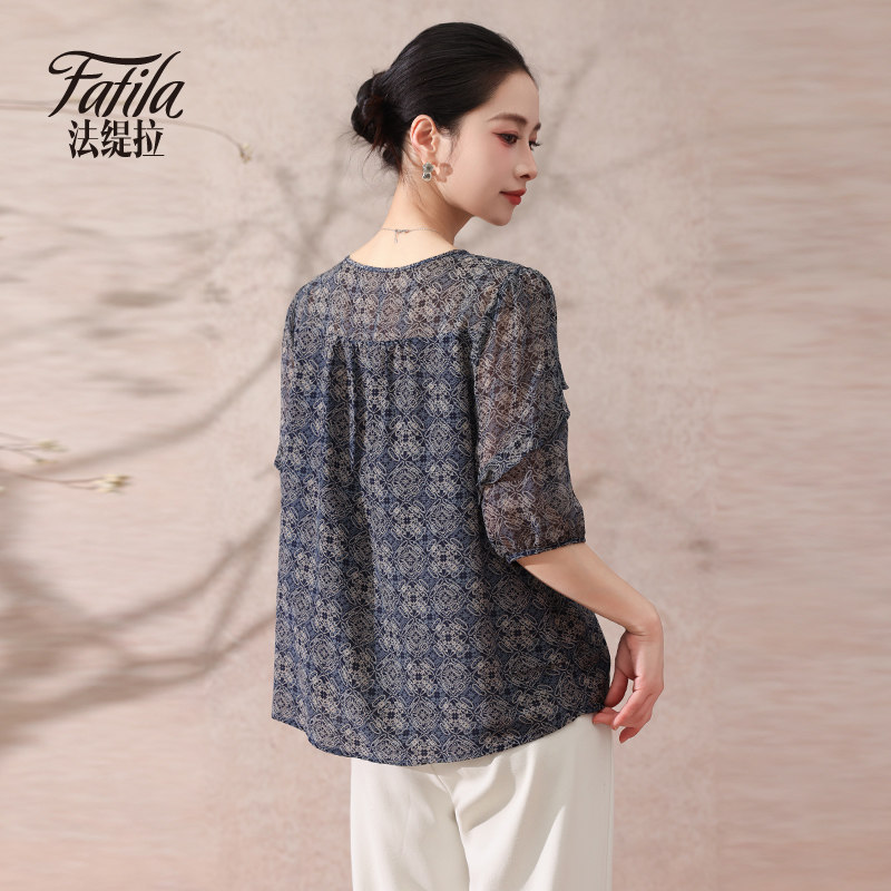 📚 时尚双绉真丝衬衫女中袖春夏新款大码印花桑蚕丝上衣洋气妈妈小衫