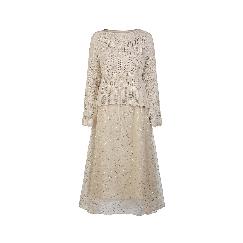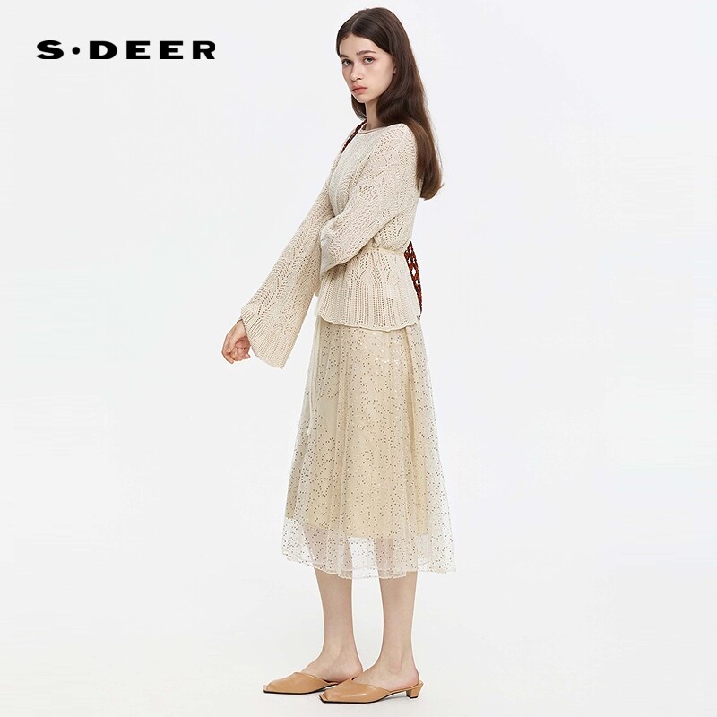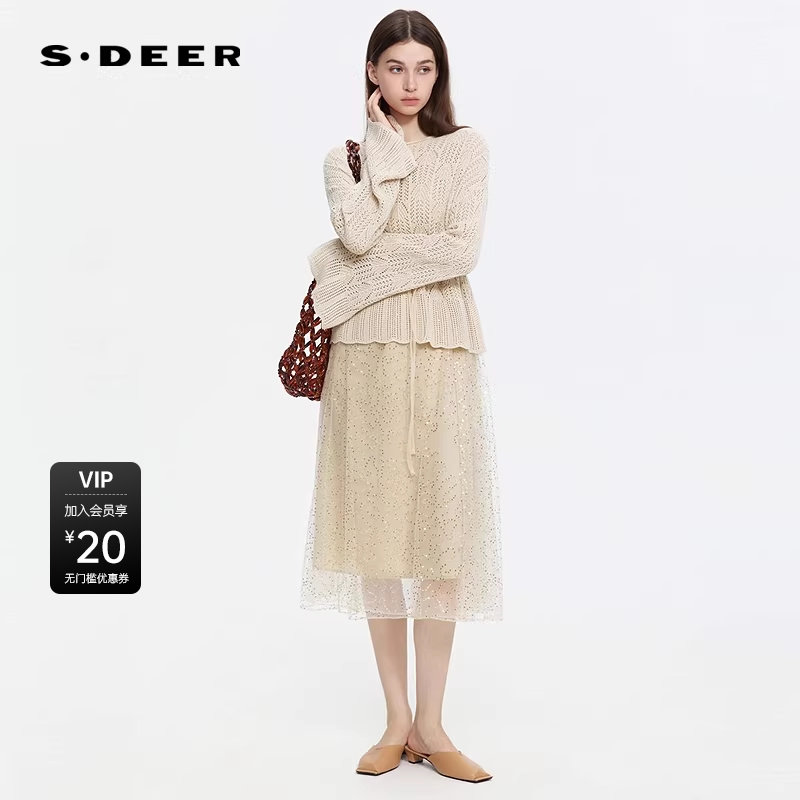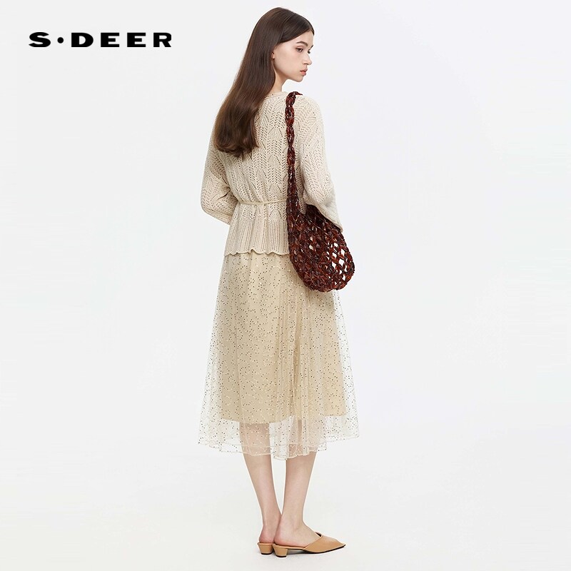 📚 sdeer圣迪奥女装春秋装复古圆领网纱针织衫连衣裙套装S253Z1411