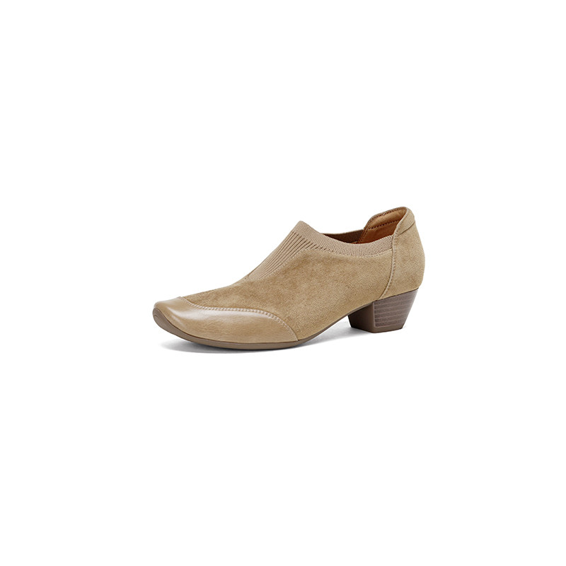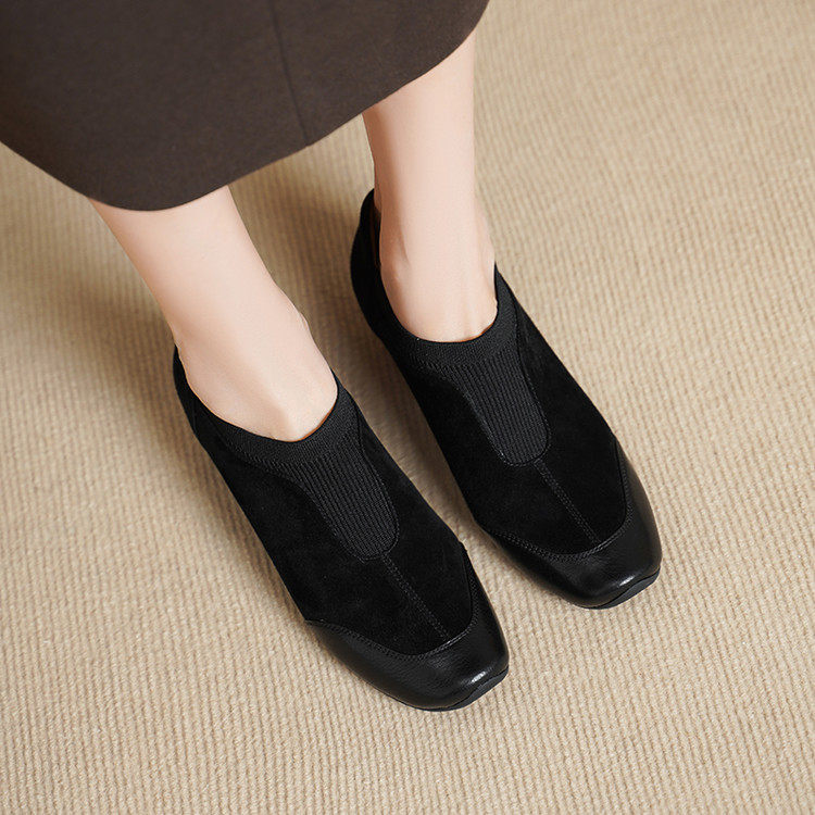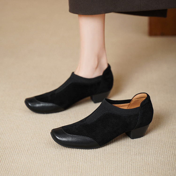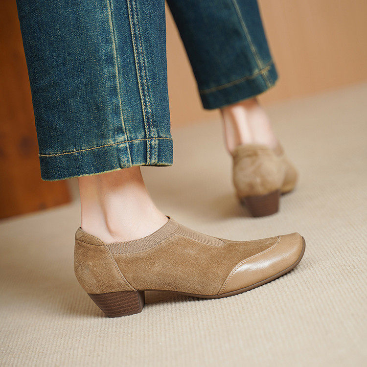 📚 4cm复古风拼接深口单鞋女中跟方头磨砂真皮奶奶鞋软底百搭小皮鞋