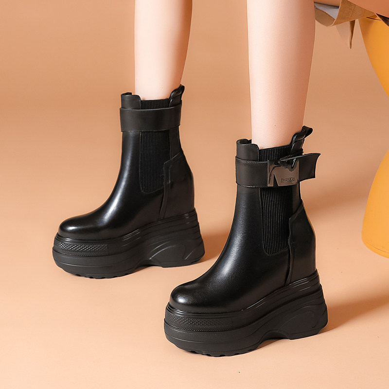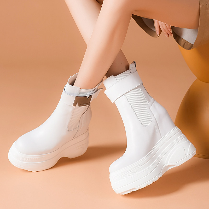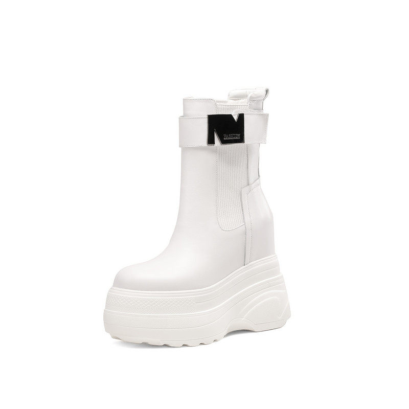 📚 白色内增高靴子女小个子14cm松糕厚底短靴真皮防水台超高跟马丁靴