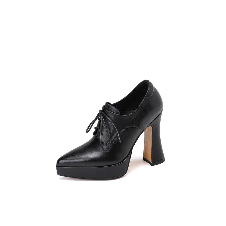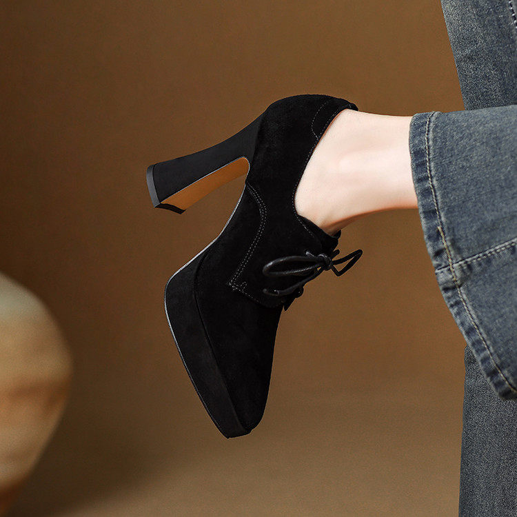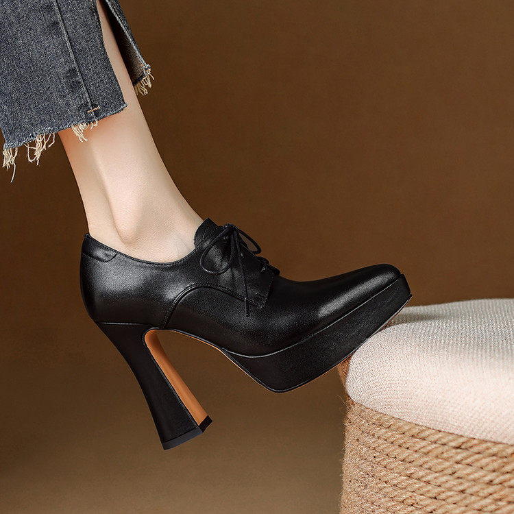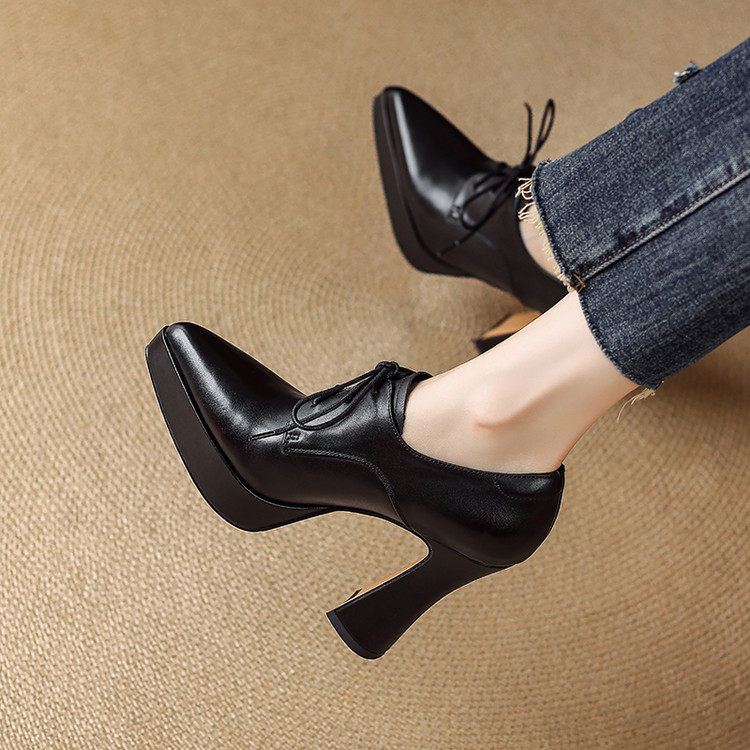 📚 2026新款尖头粗跟系带深口单鞋不累脚防水台真皮裸靴高跟鞋女