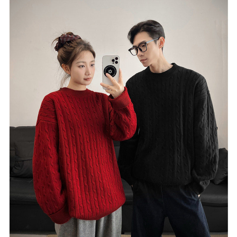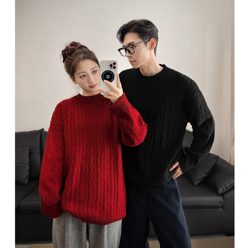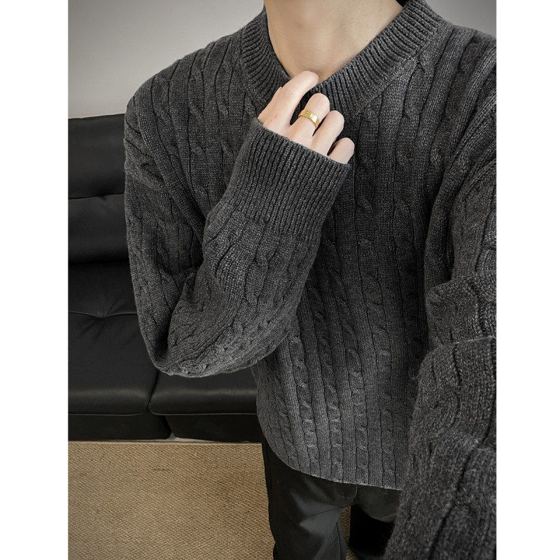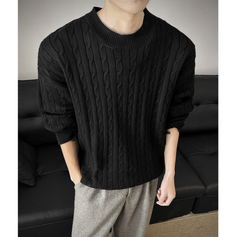 📚 老钱风黑色圆领麻花毛衣男款秋冬保暖人夫感内搭打底衫加厚针织衫