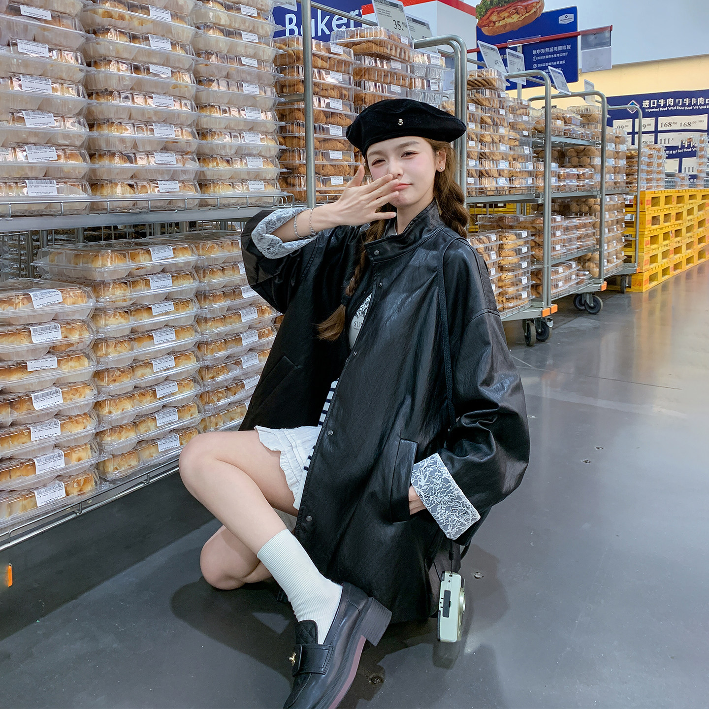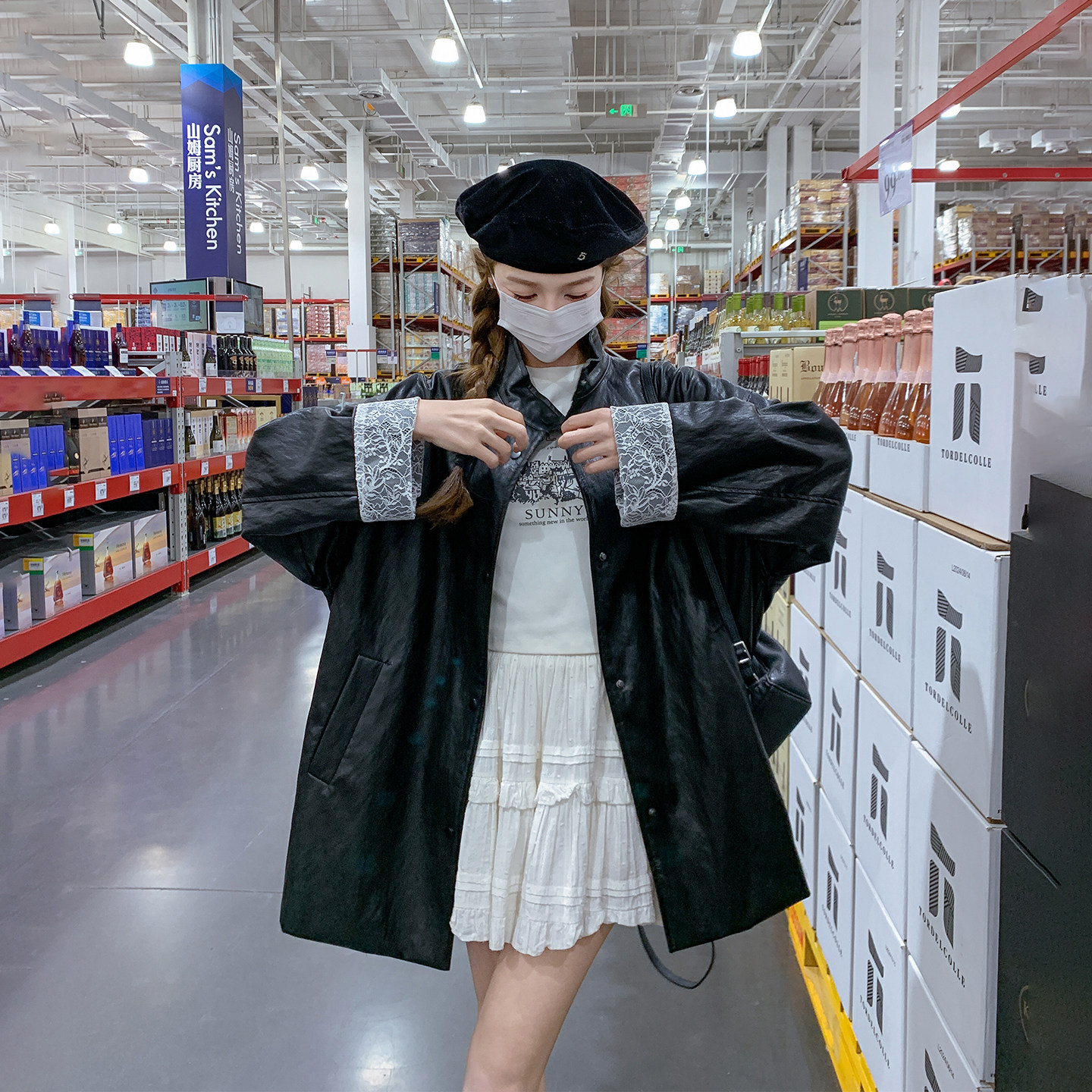 📚 蕾丝拼接黑色皮衣外套女春季2026新款中长款独特漂亮复古PU皮夹克