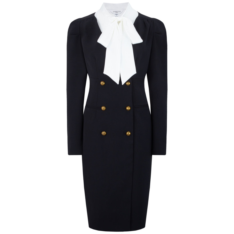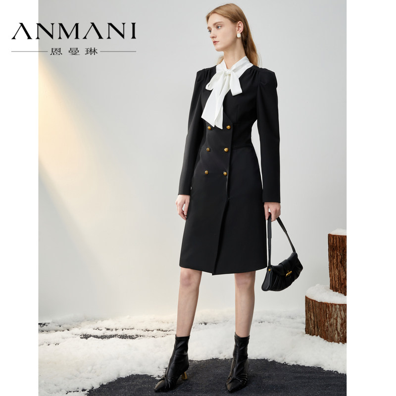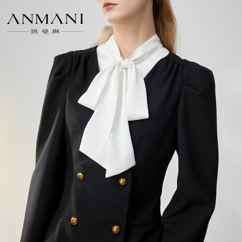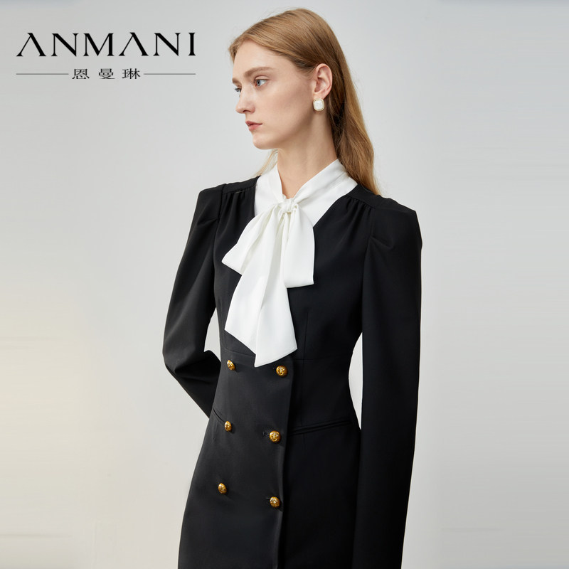 📚 ANMANI恩曼琳秋冬新款飘带领双排扣泡泡袖西装连衣裙EANCDH28