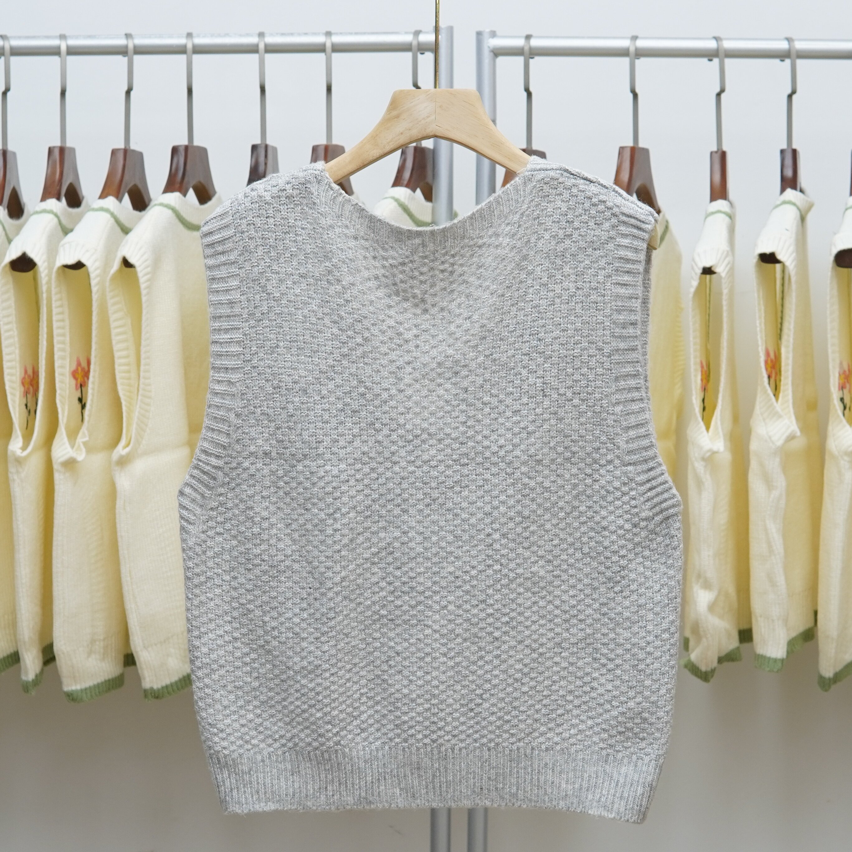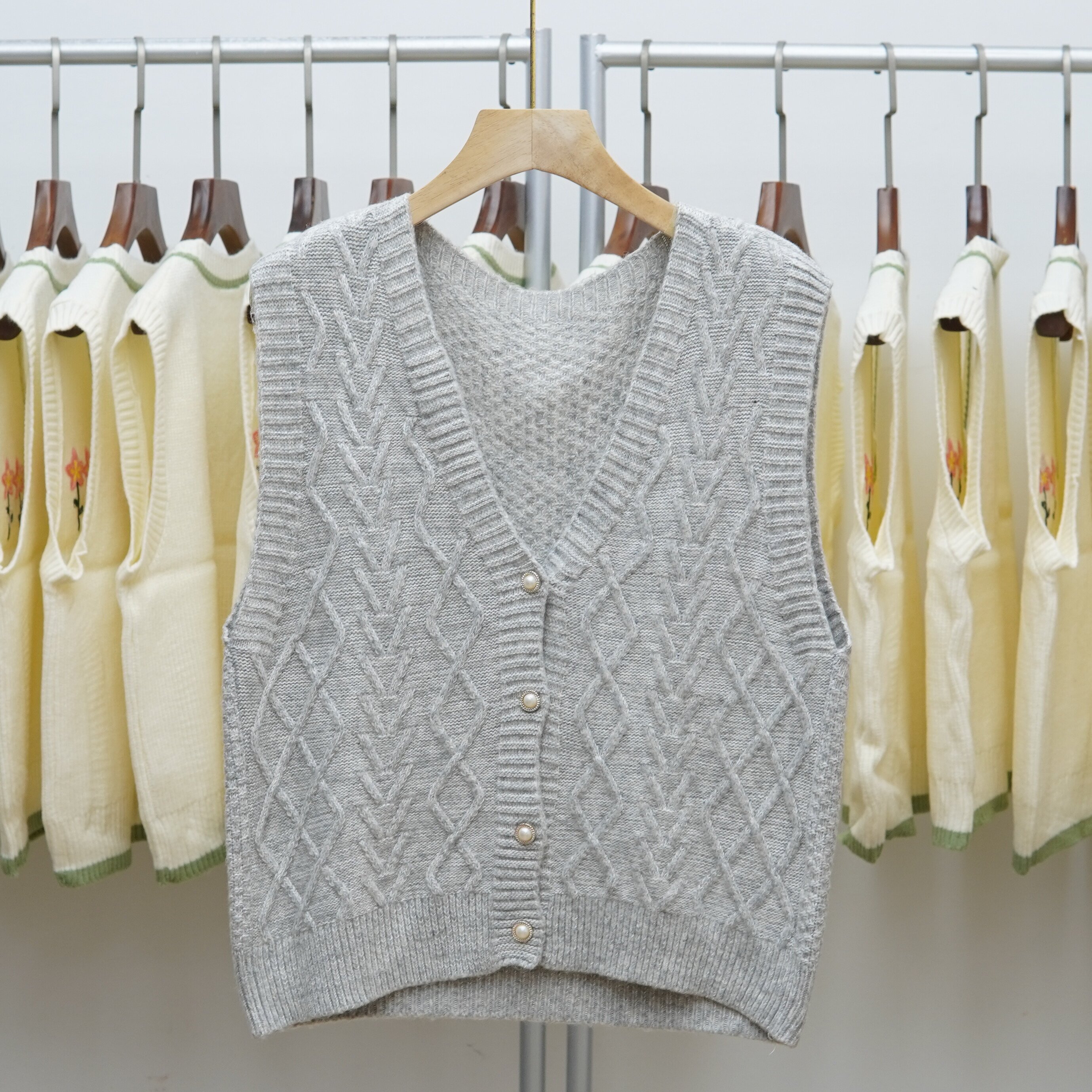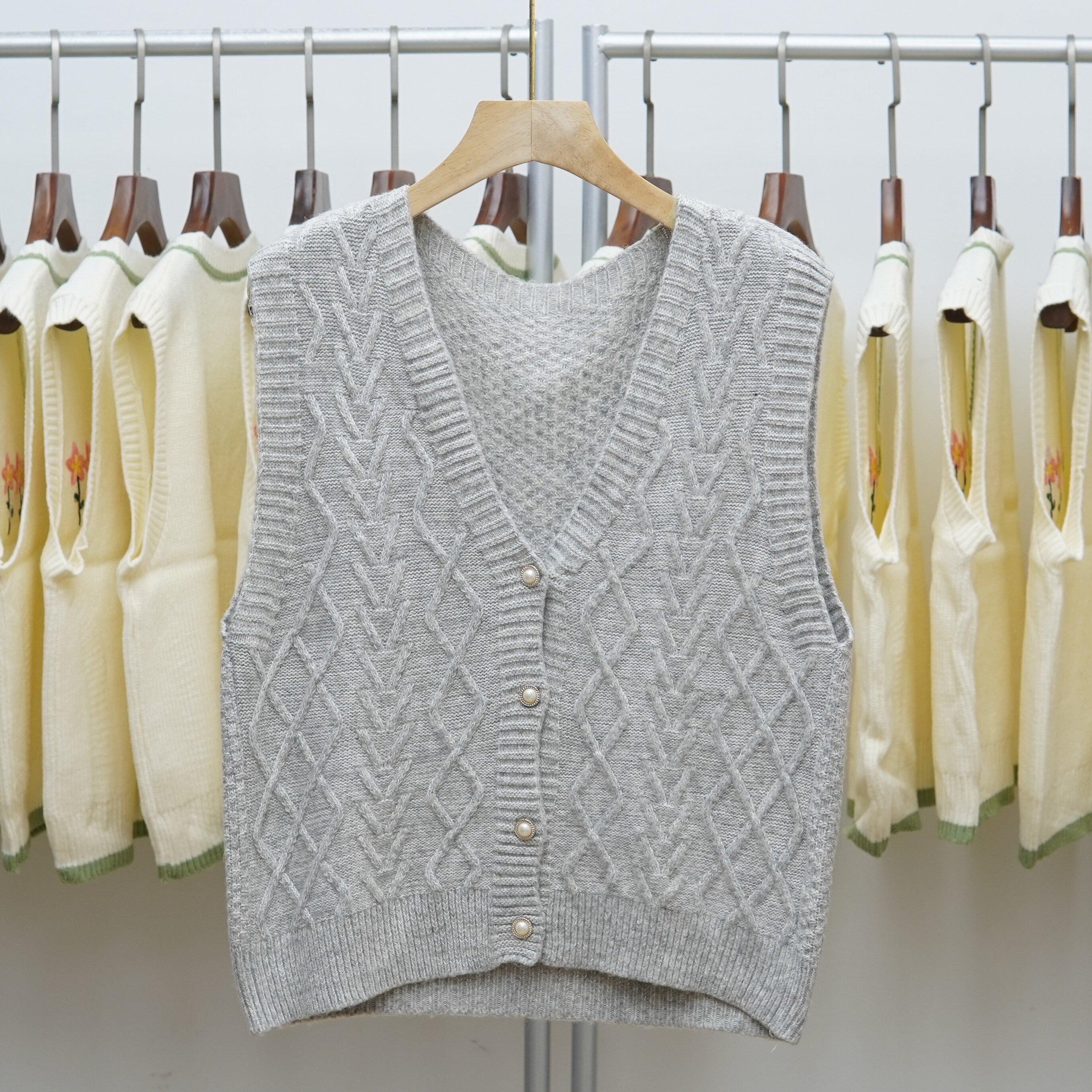 📚 586 灰色V领麻花针织马甲女无袖宽松毛衣开衫百搭菱形背心坎肩