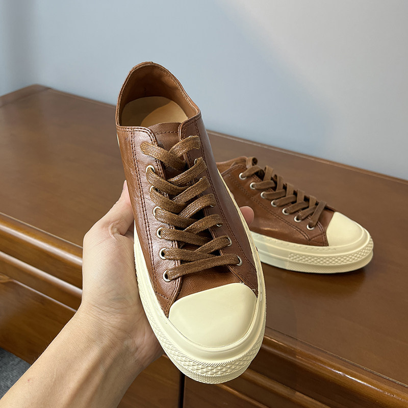 📚 手工~洗水马皮~小白鞋女春秋款透气真皮平底系带棕色复古休闲板鞋