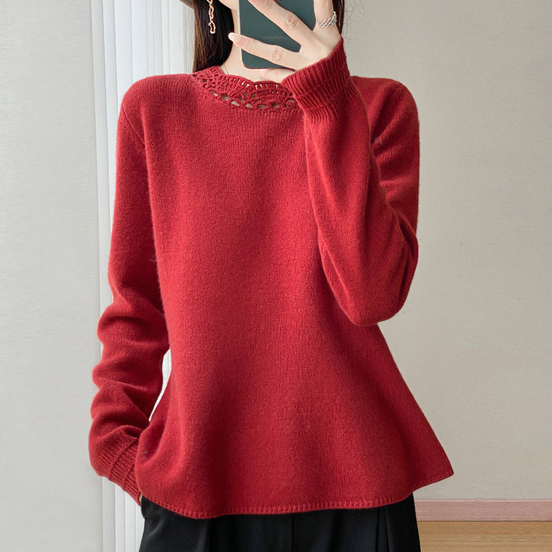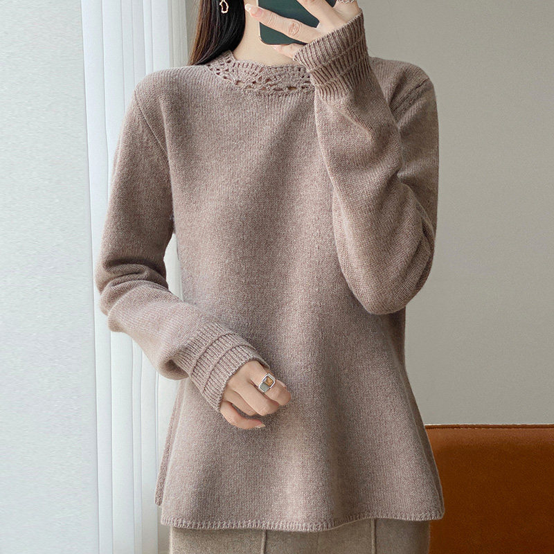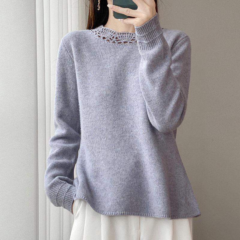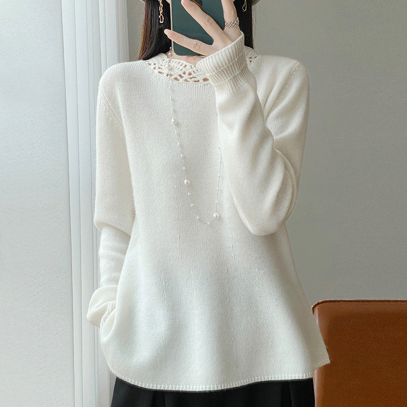 📚 秋冬新款100%纯羊毛衫女花边圆领镂空钩花针织毛衣宽松羊绒衫打底