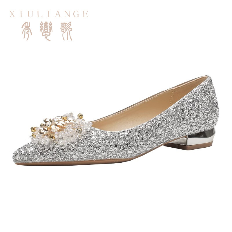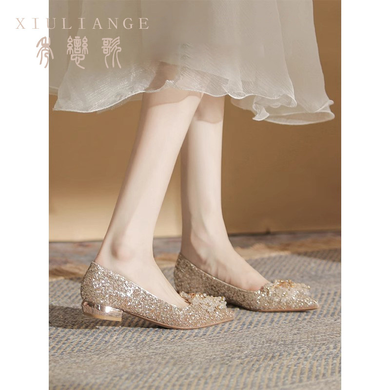 📚 平底孕妇大码水晶婚鞋女婚纱秀禾两穿新娘鞋不累脚亮片敬酒鞋单鞋