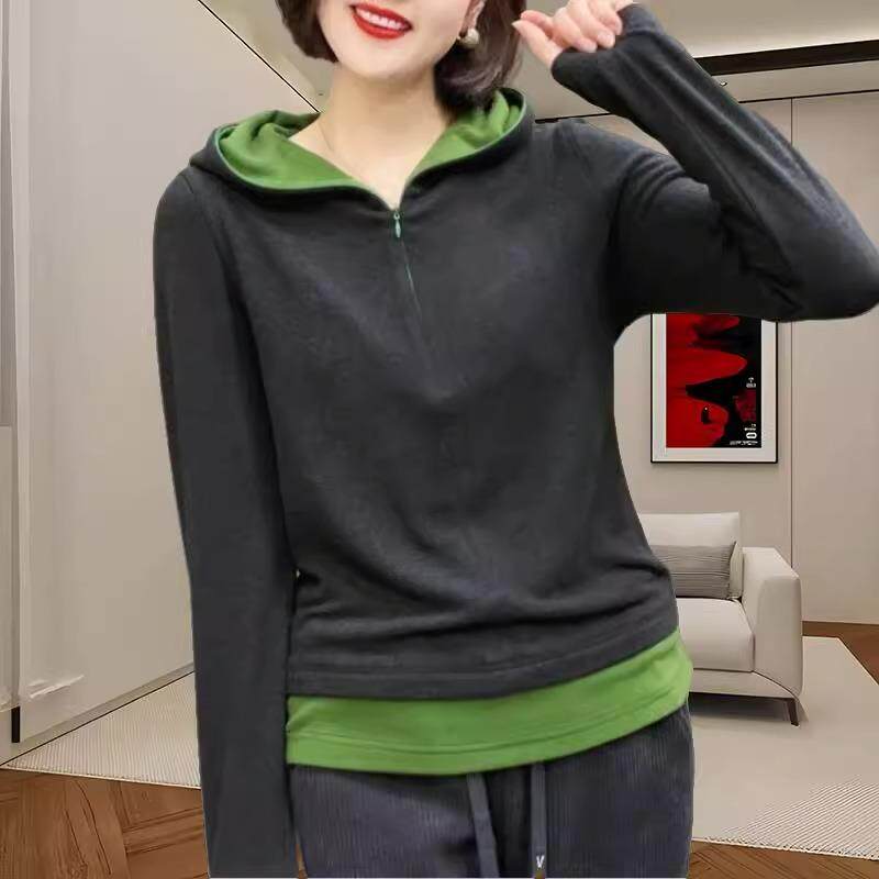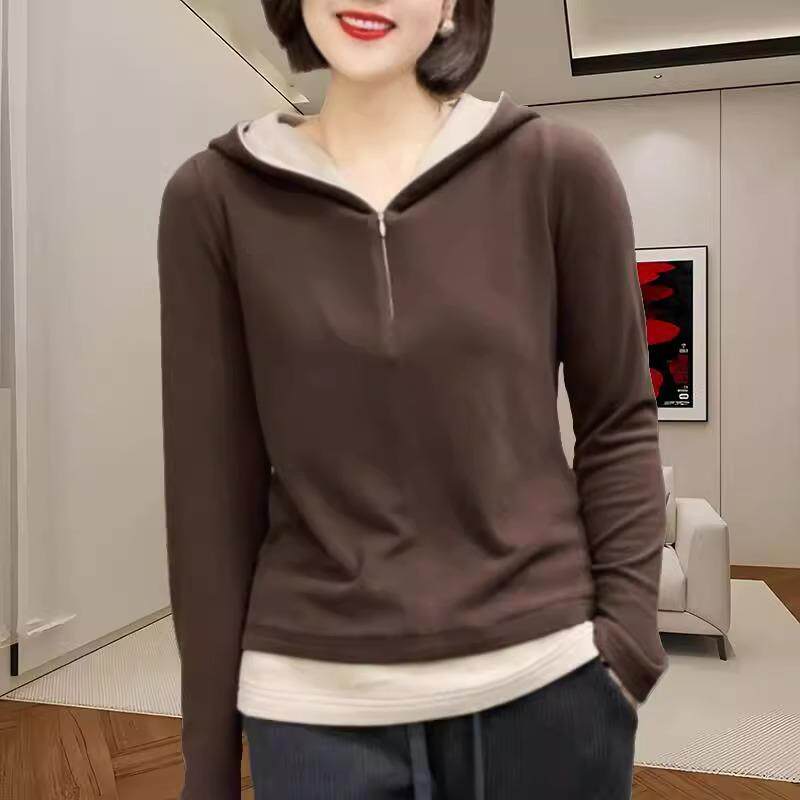 📚 韩国洋气假两件长袖t恤女2025春秋新款连帽休闲百搭纯色显瘦上衣-