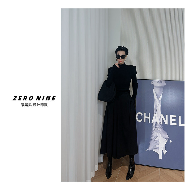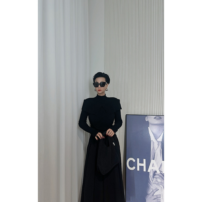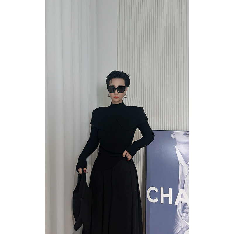 📚 Dan Dan 暗黑风黑色高领针织衫女 披肩假俩件设计感上衣