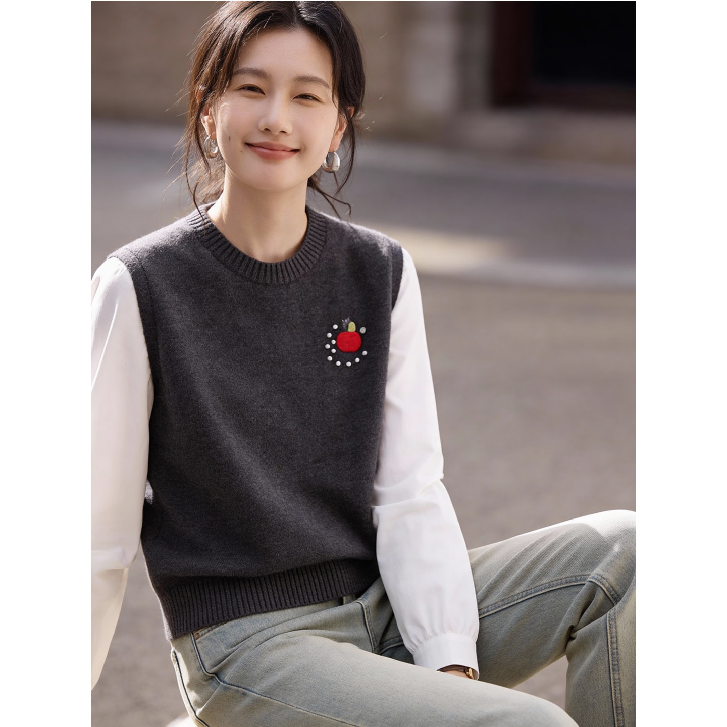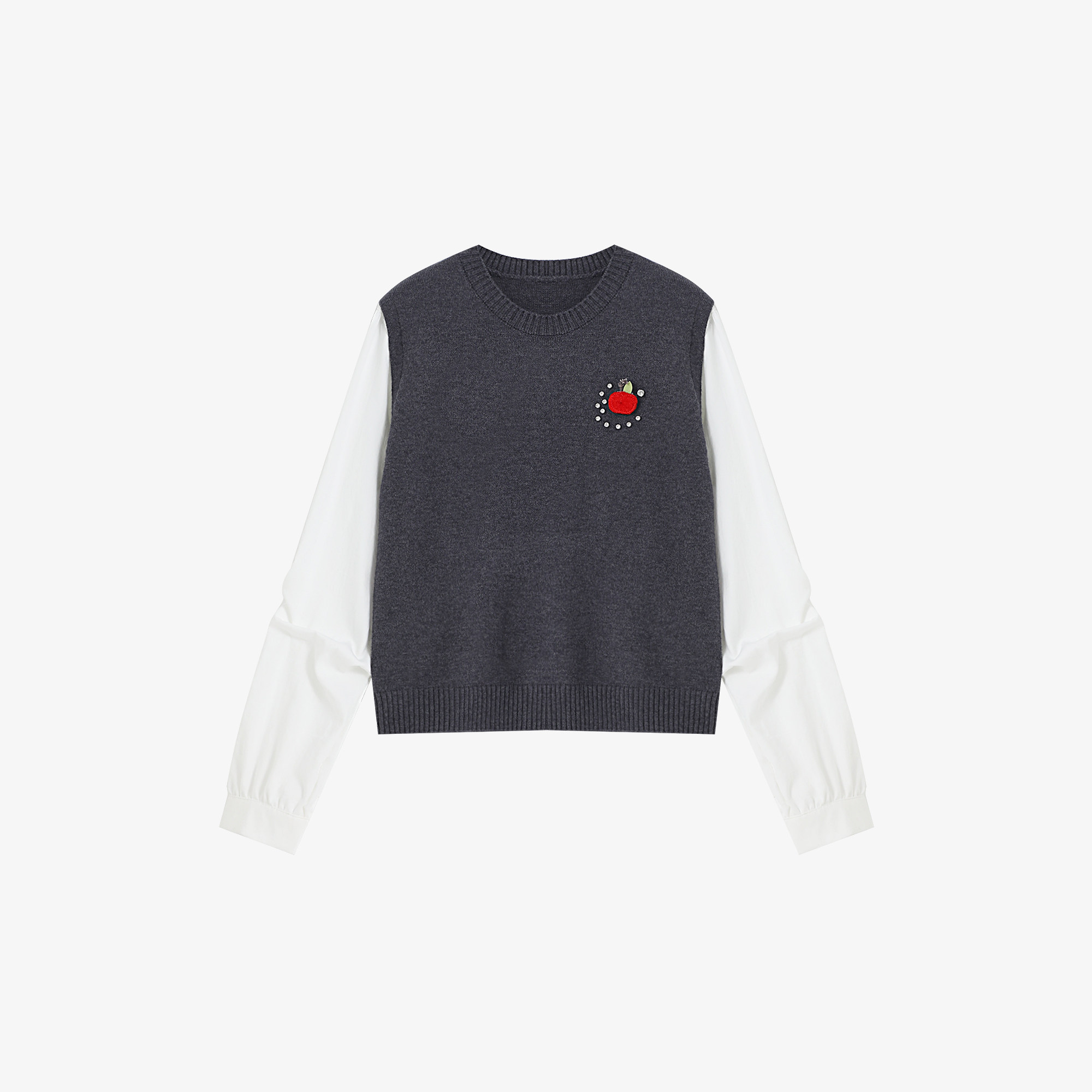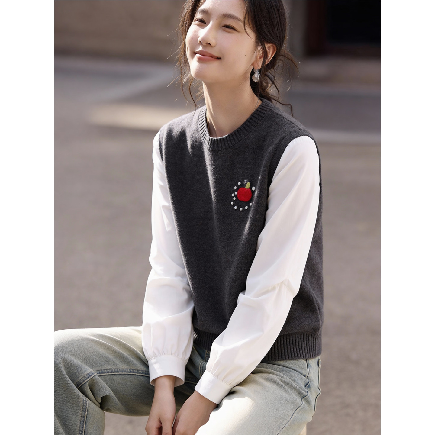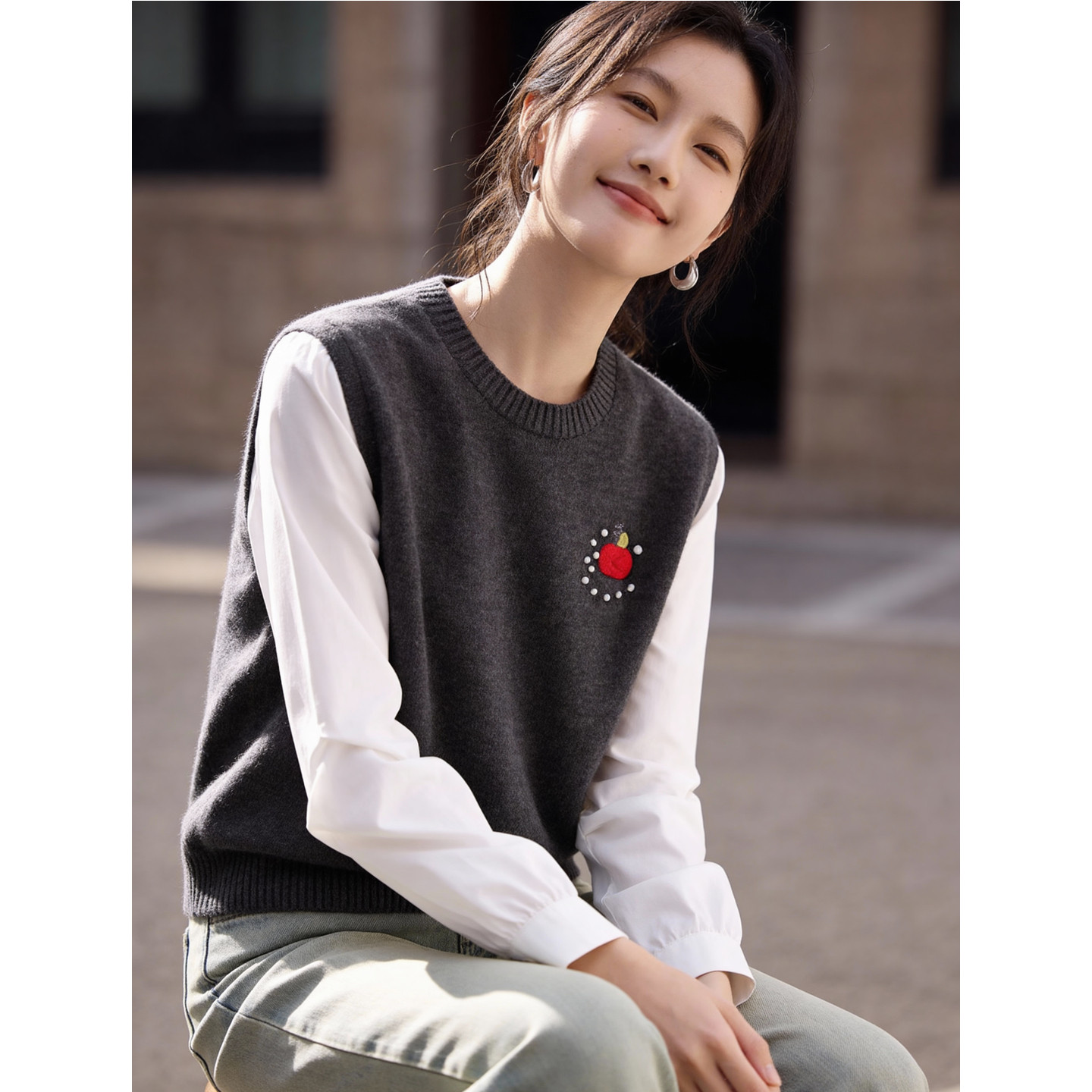 📚 百家好撞色假两件刺绣毛衣女春季新款灰色马甲拼接长袖设计感上衣