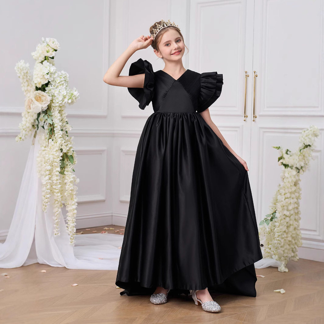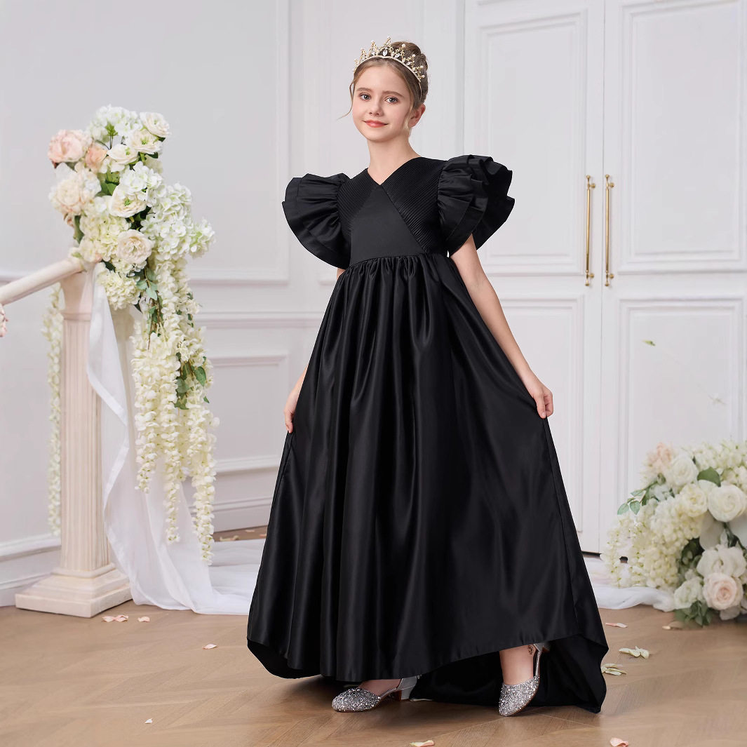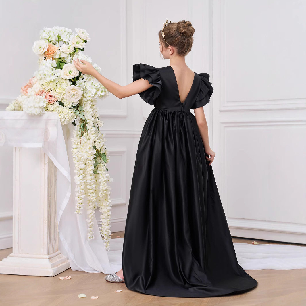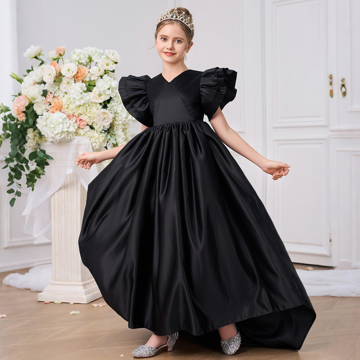 📚 跨境新款儿童燕尾裙 女童小飞袖背后深V缎布公主裙女童走秀拖尾裙