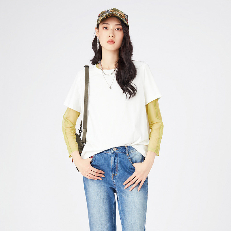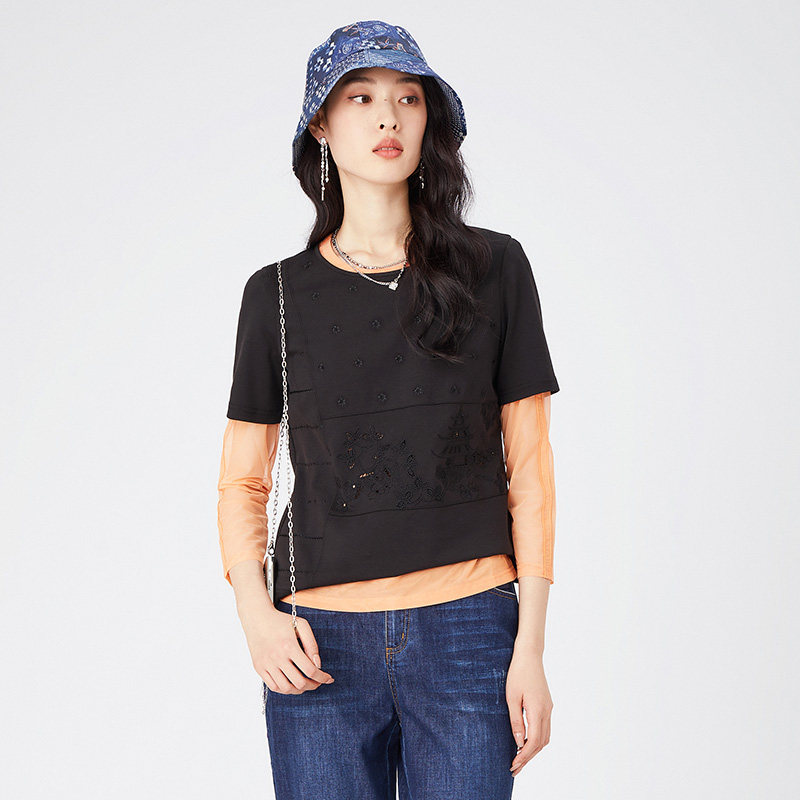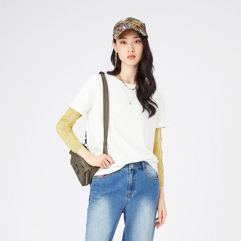 📚 渔牌女装打底衫女2024新款弹力长袖圆领休闲绣花内搭T恤FGGA2042