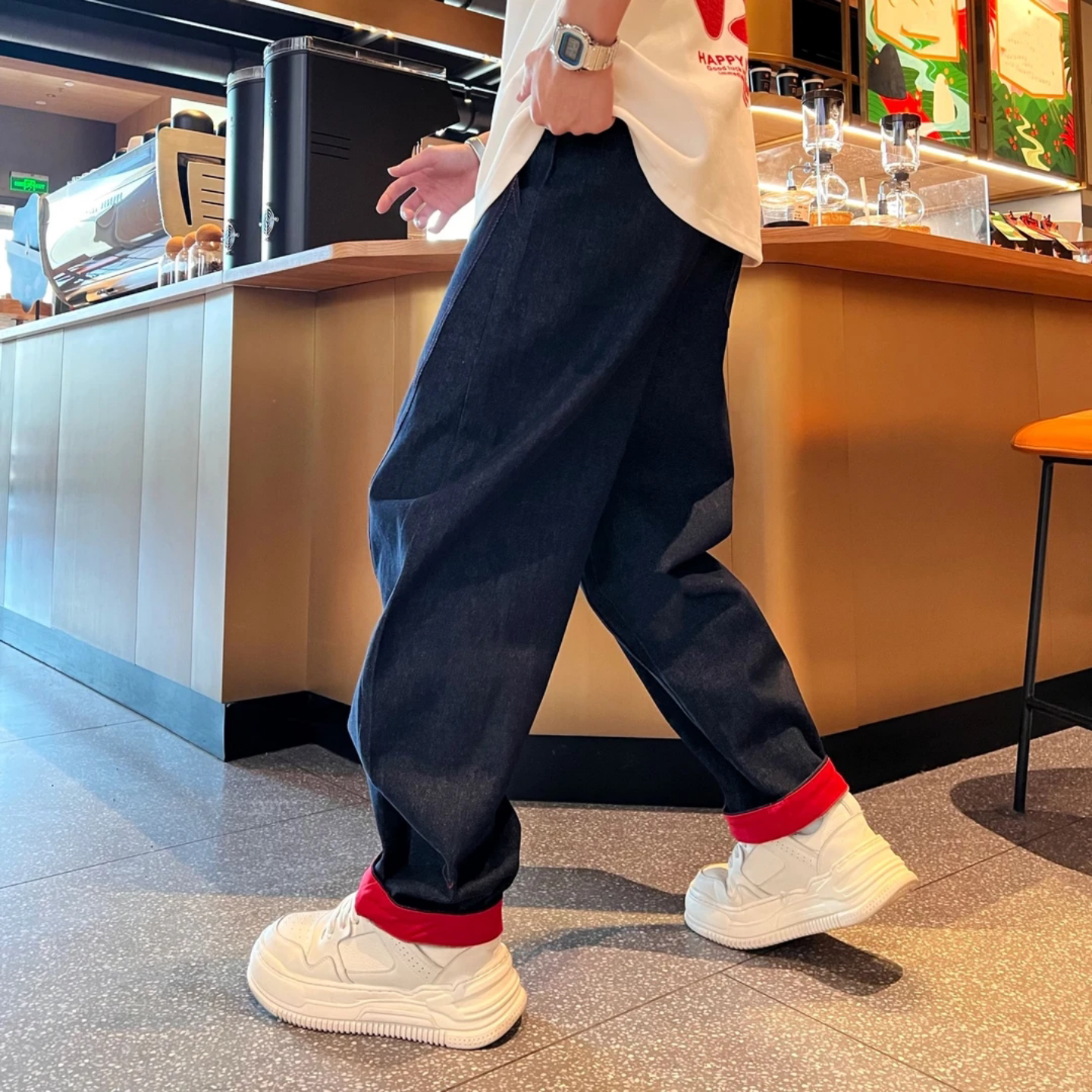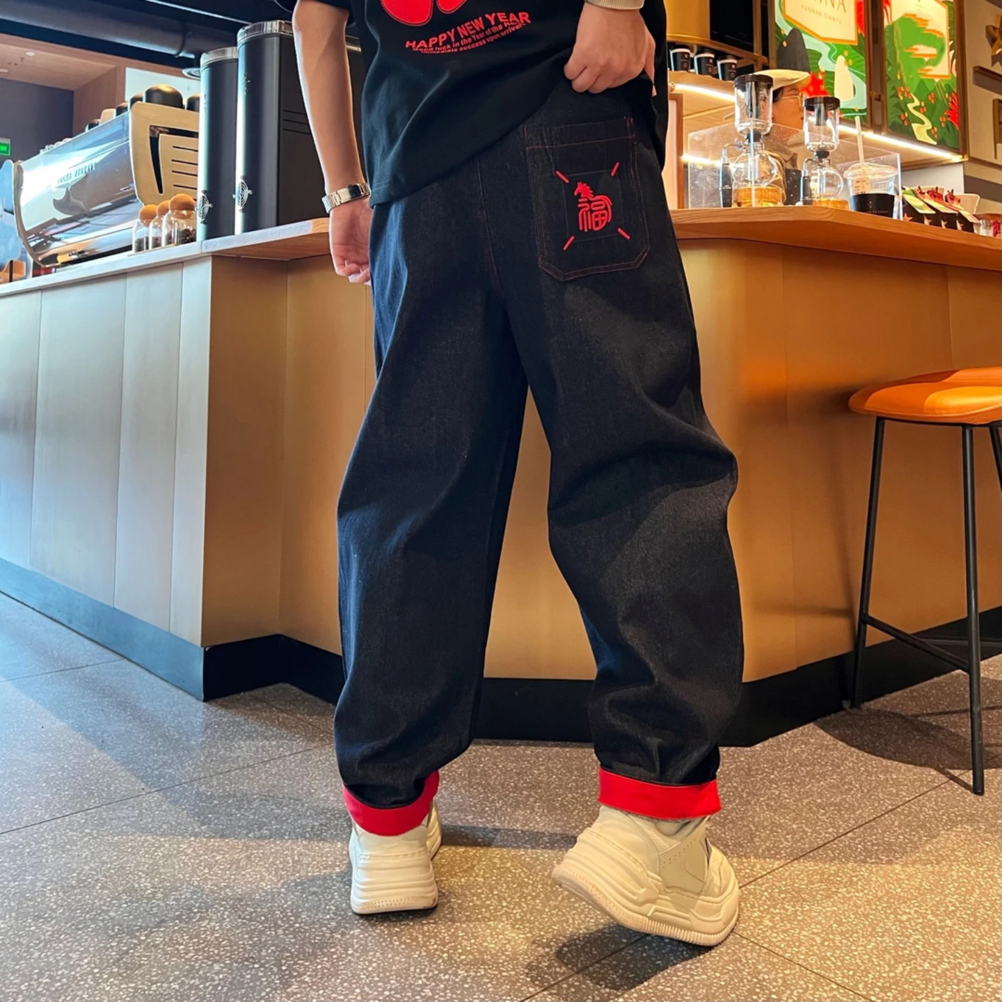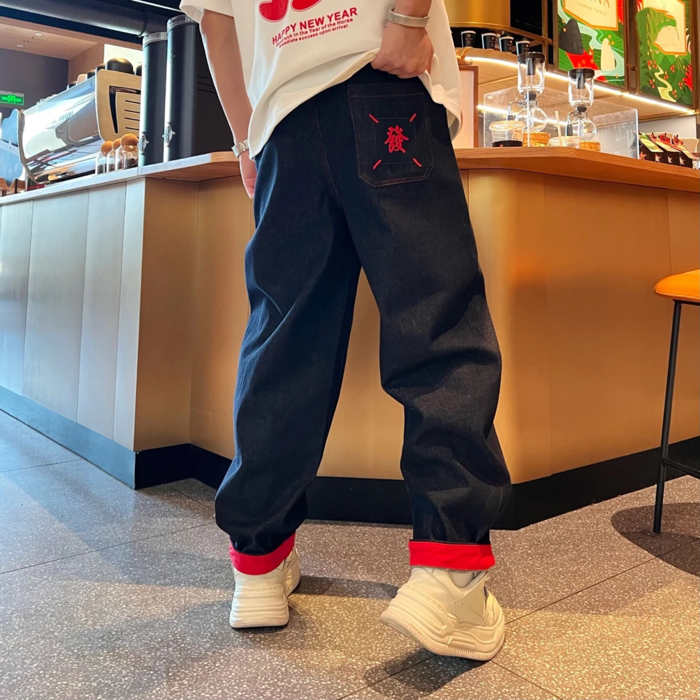 📚 【马年贺岁】冬季百搭时尚休闲潮流个性痞帅刺绣撞色弯刀牛仔裤男