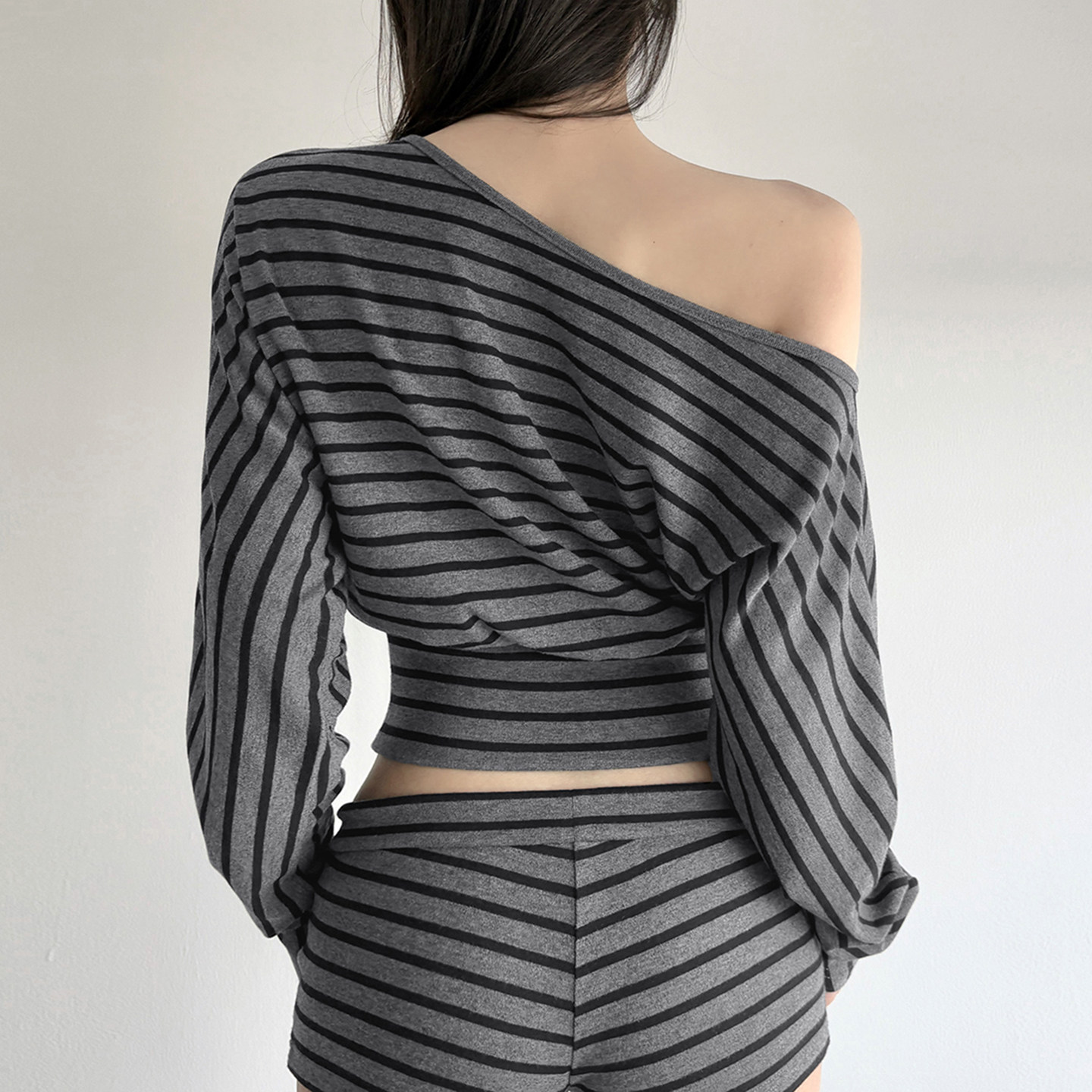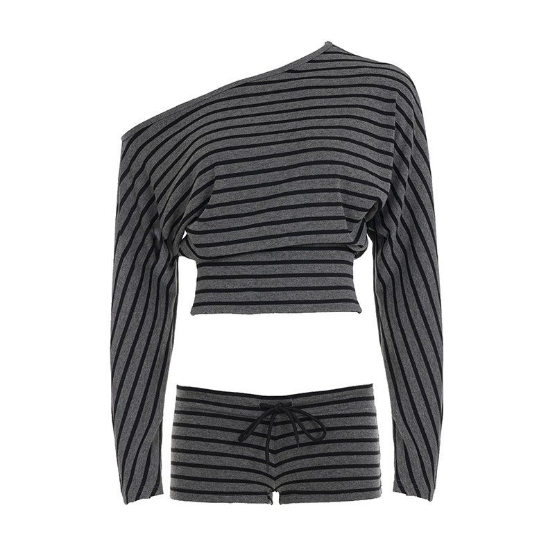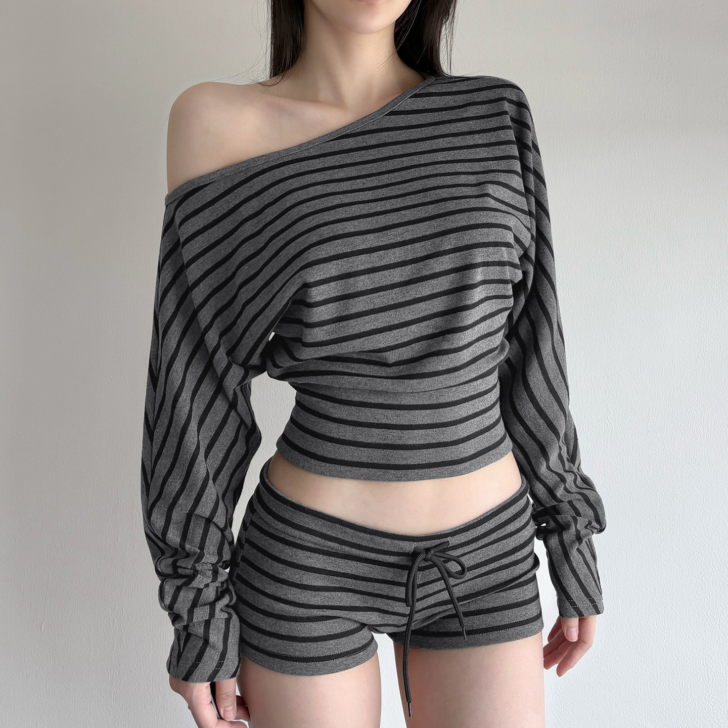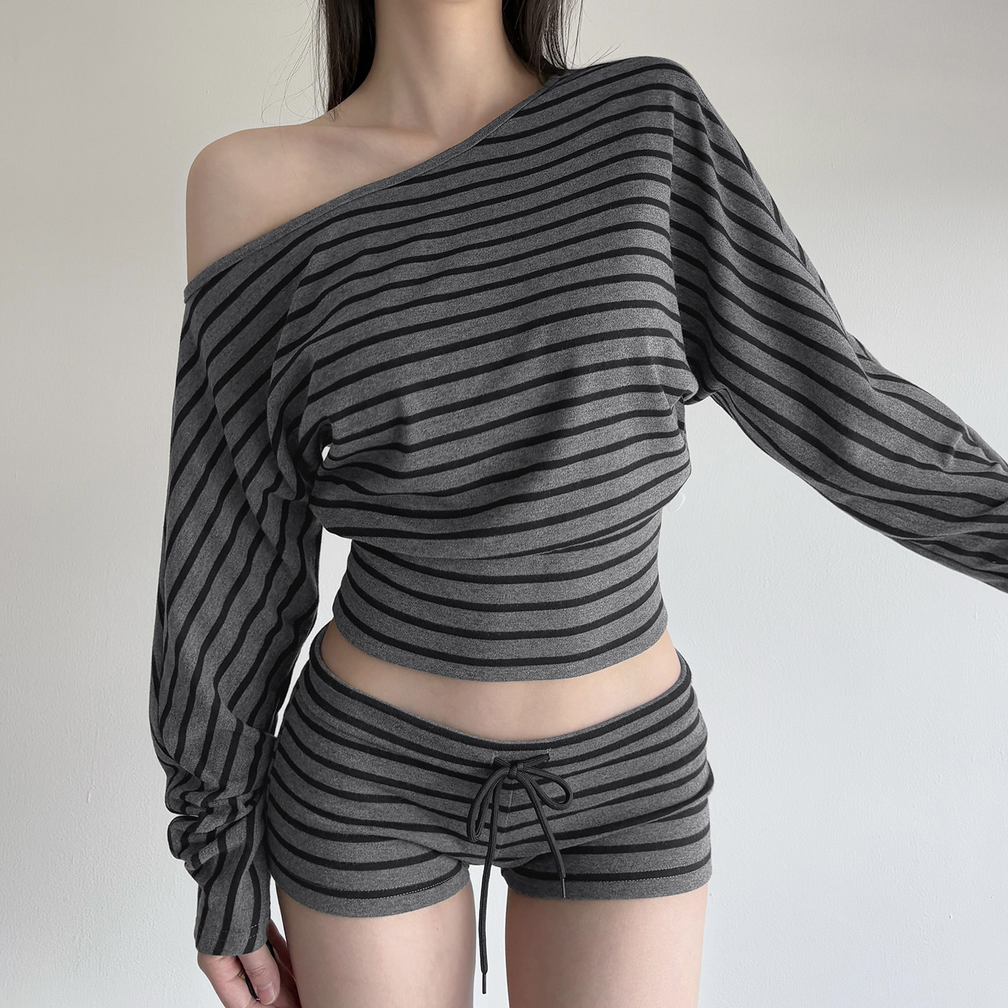 📚 WEEKEEP 休闲百搭条纹斜肩收腰长袖T恤女低腰撞色系带包臀短裤