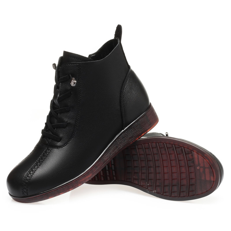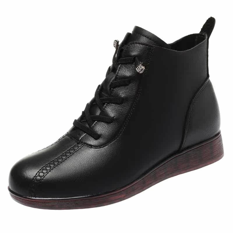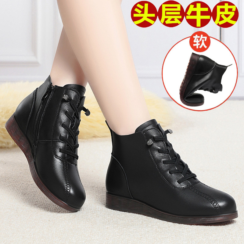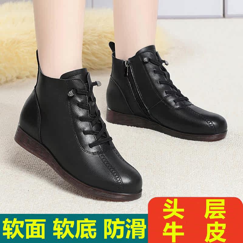 📚 秋冬季女单靴真皮低跟平底棉皮鞋中老年妈妈短靴子加绒保暖牛筋底