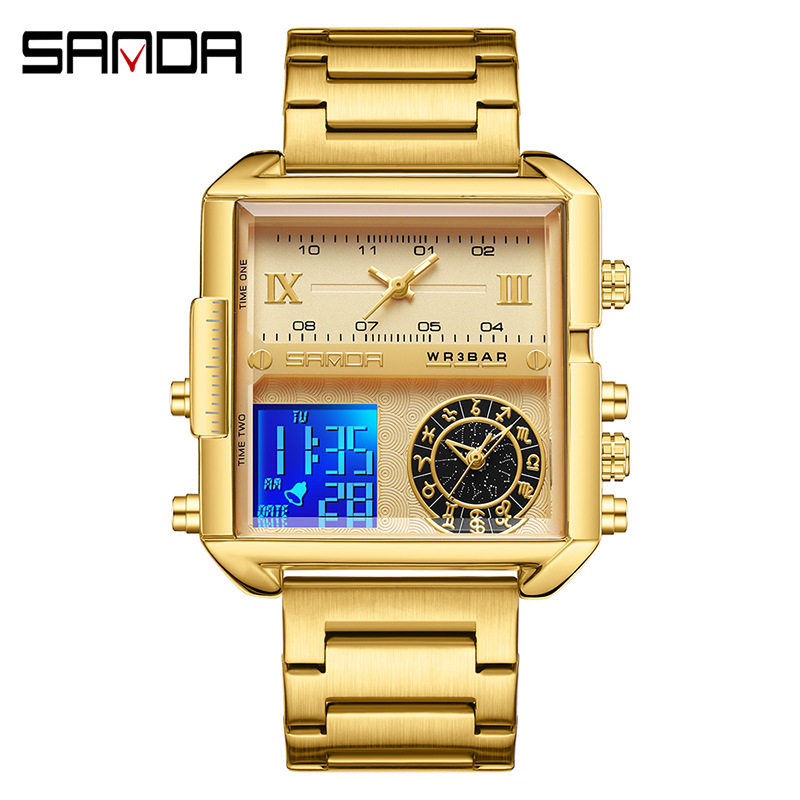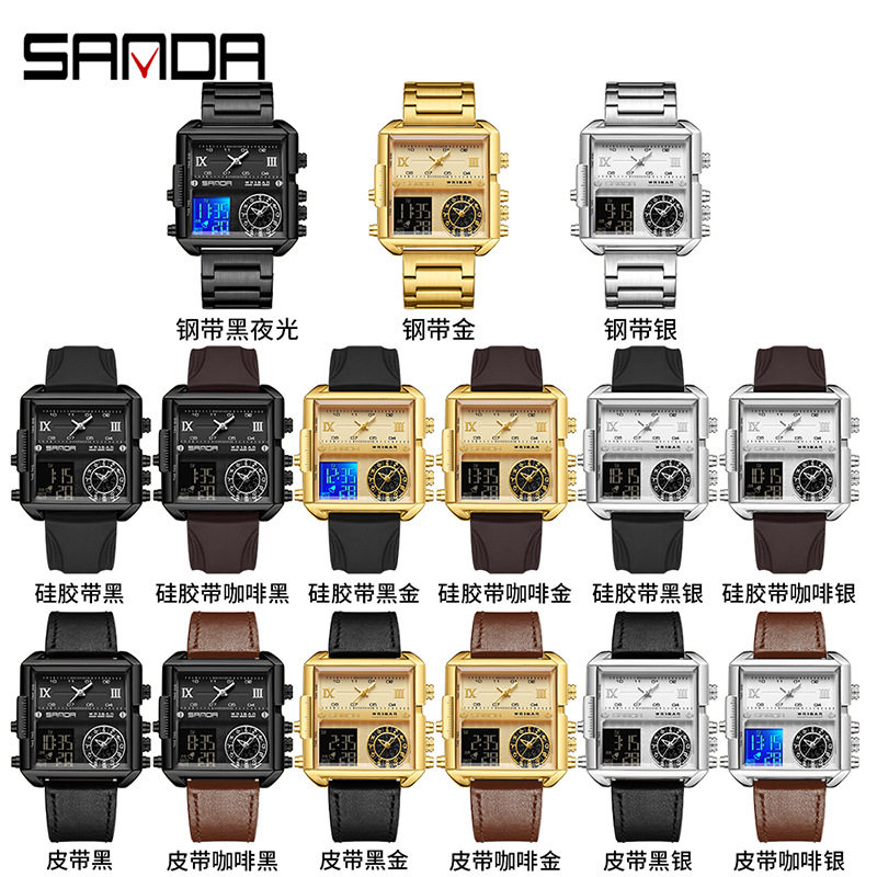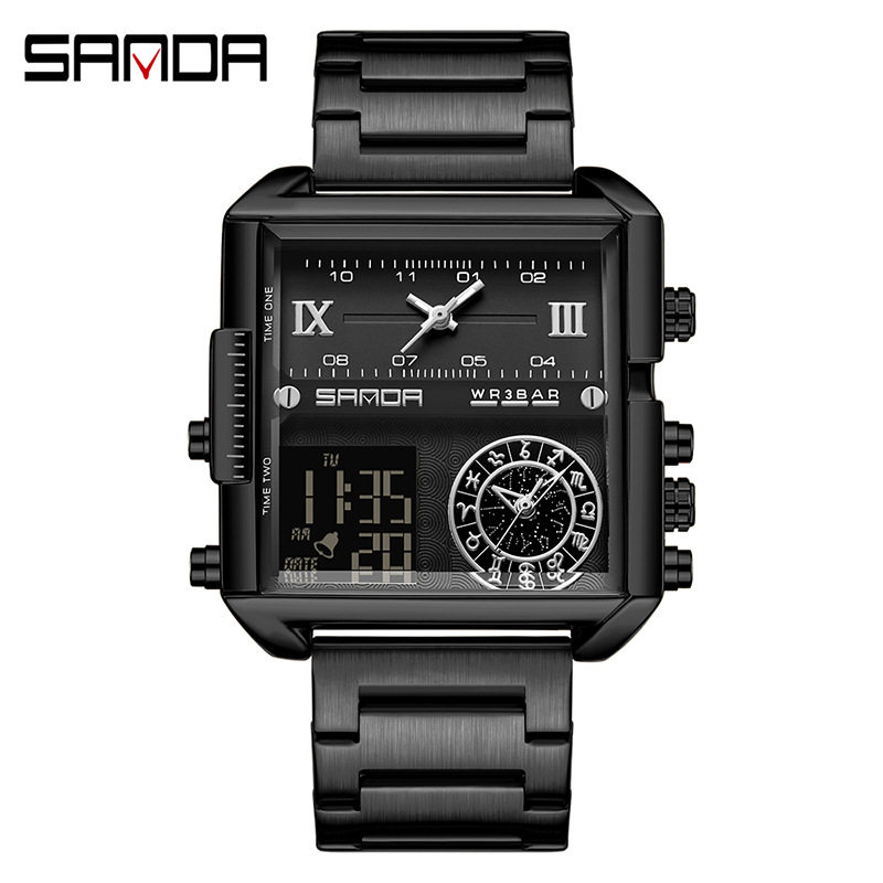 📚 SANDA三达双显手表方形星座腕表霸气男士商务电子表防水多功能潮