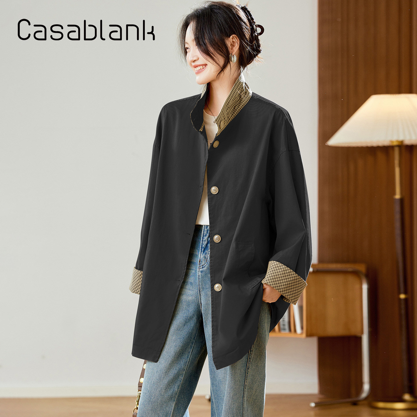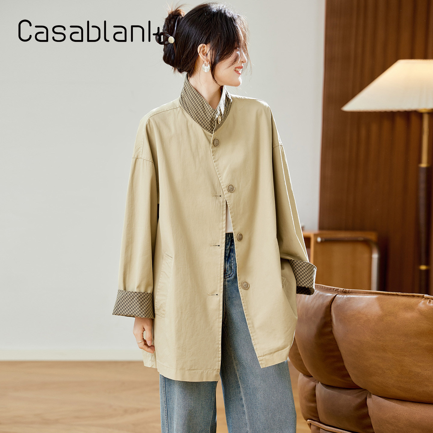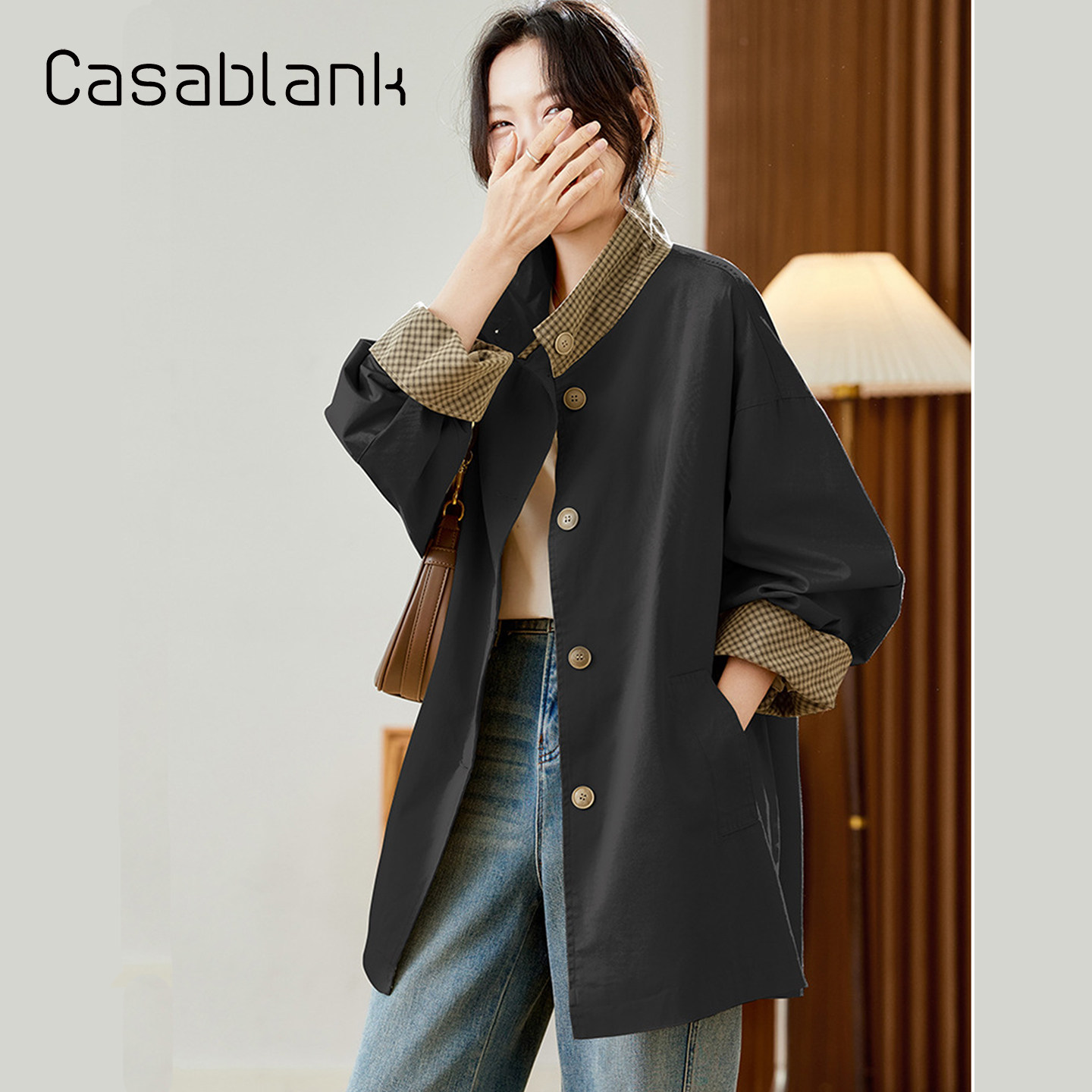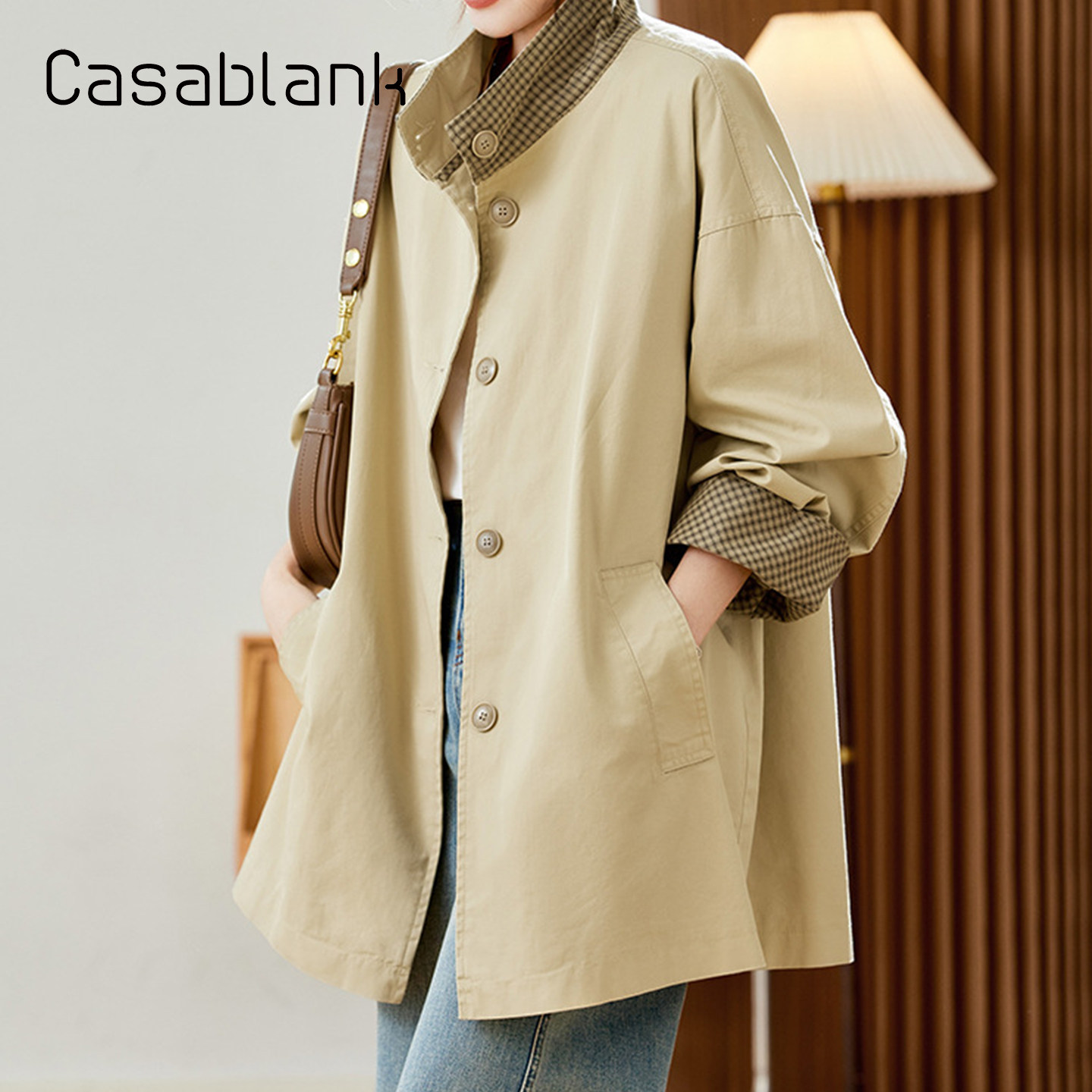 📚 Casablank韩版时尚格子拼接风衣女2025秋新款高级感宽松立领外套