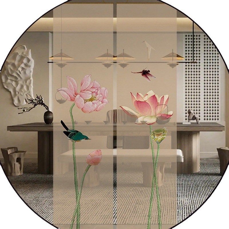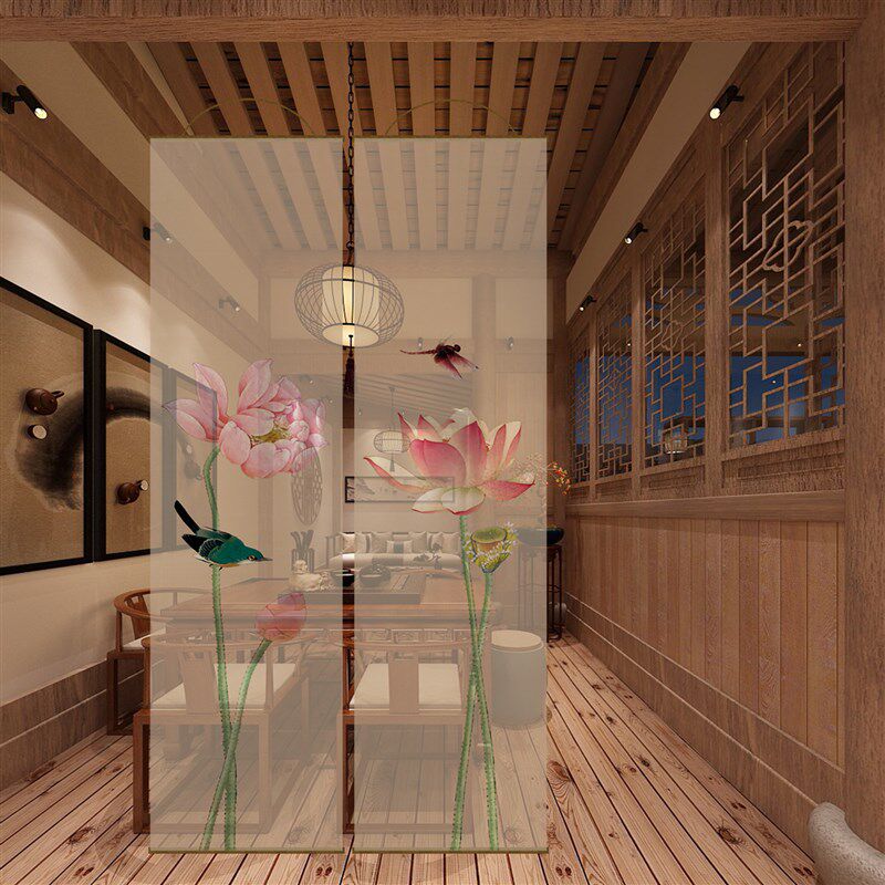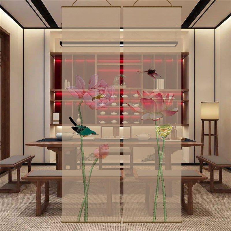📚 半透水墨莲花双面透景屏风纱中式卷帘隔断帘挂帘水墨窗帘纱帘透光