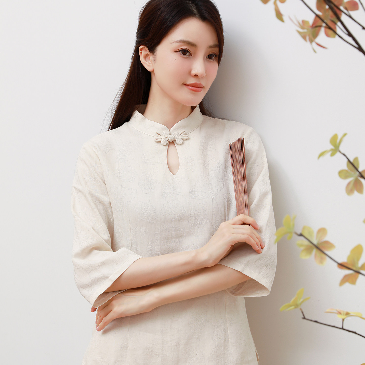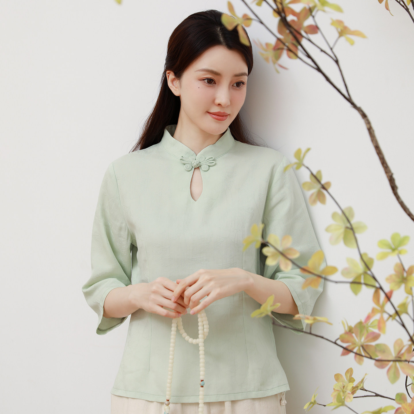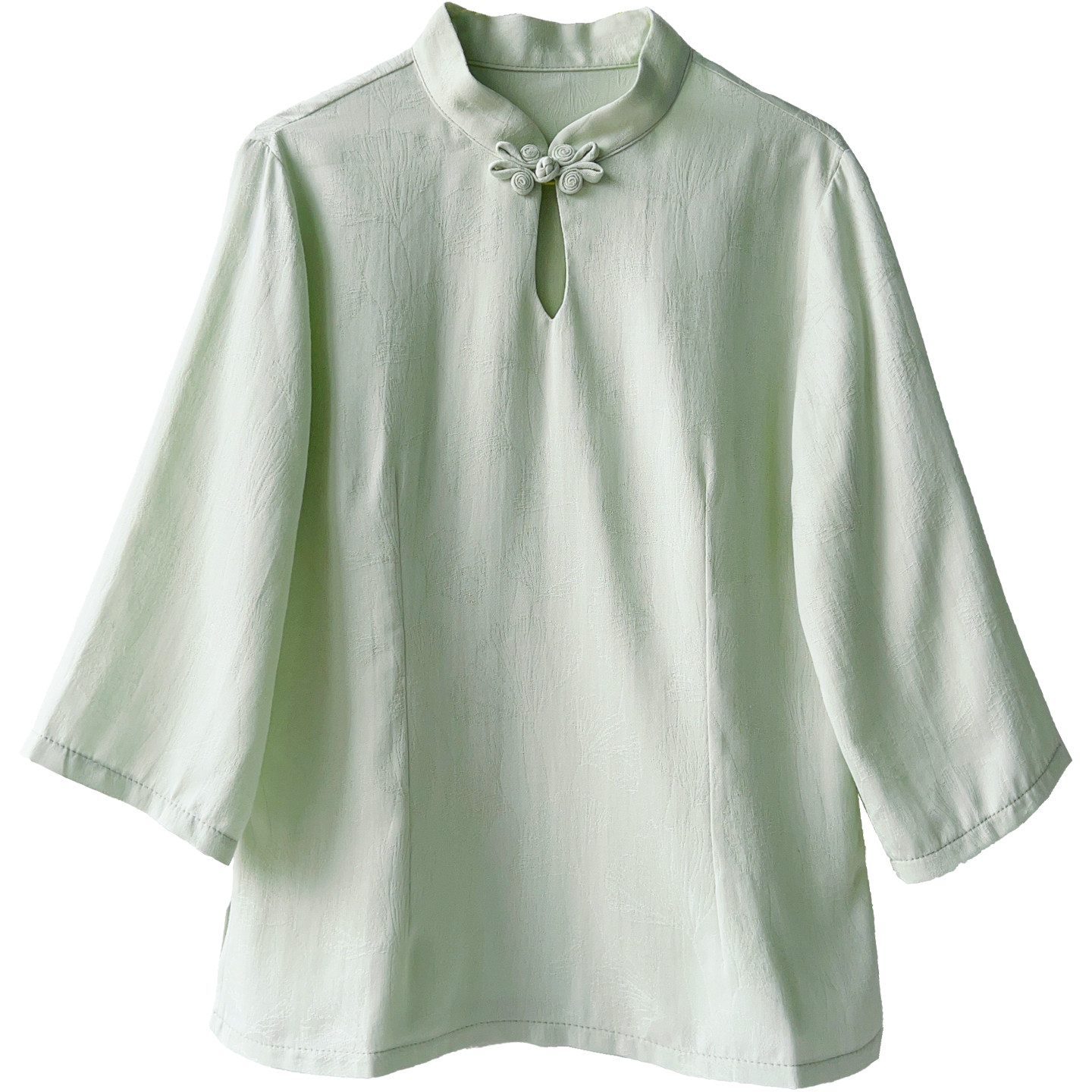 📚 棉麻衬衫立领五分袖T恤亚麻茶服春季新款新中式盘扣上衣打底衫女
