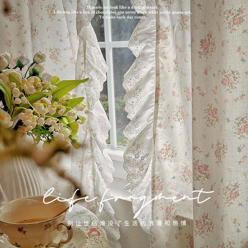 📚 韩式小清新粉花透光不透人w窗帘法式波浪花边田园风碎花印花半帘