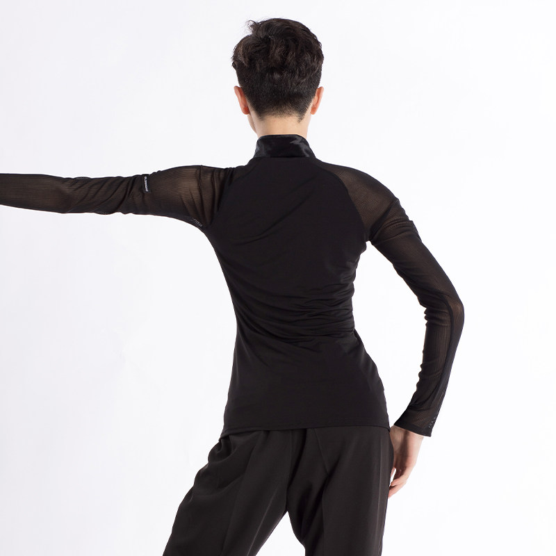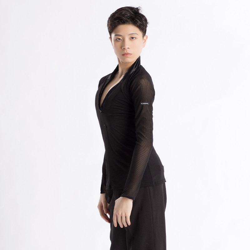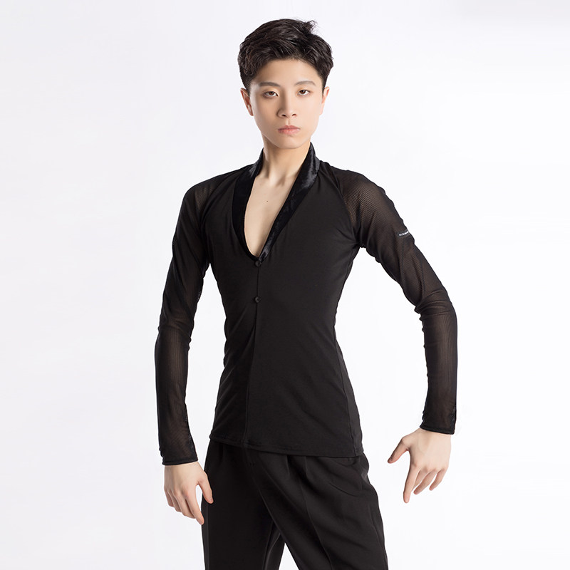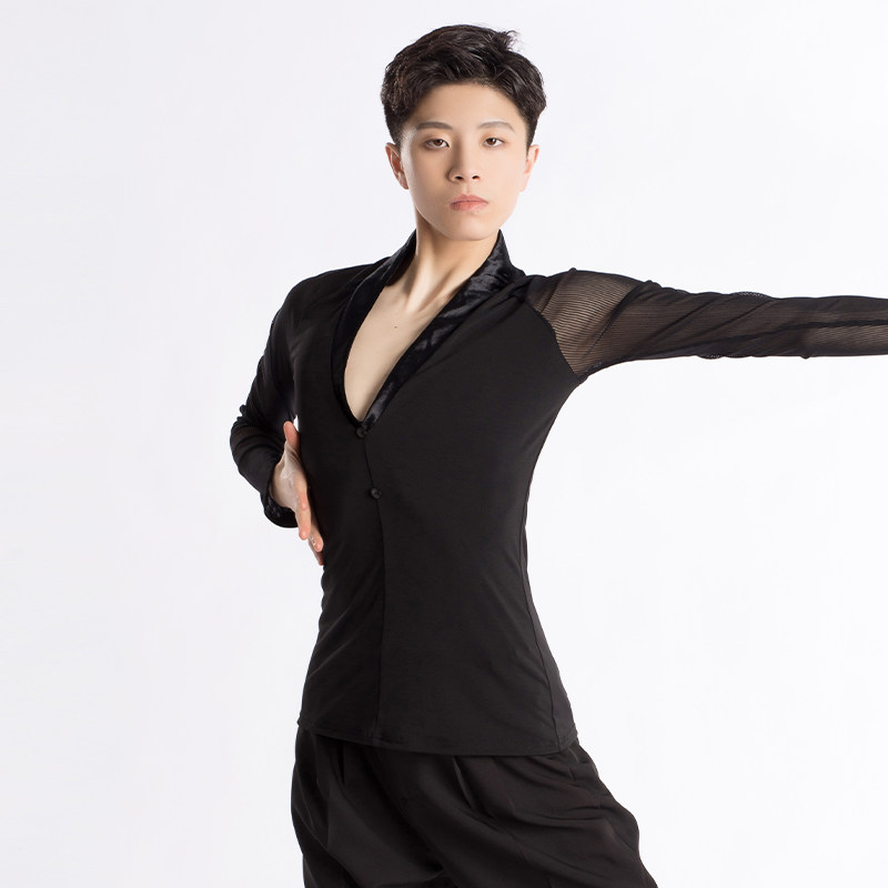 📚 歌瑞亚舞服男士拉丁舞训练功服秋新款V领网纱拼接长袖上衣考级服