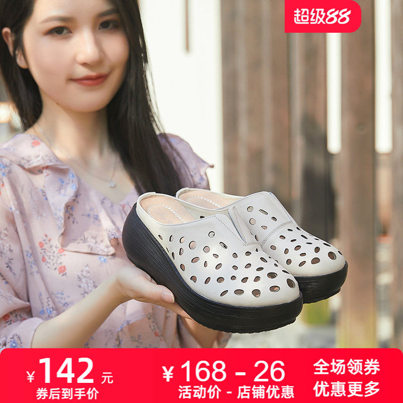 📚 真皮镂空拖鞋女外穿夏新款高跟厚底松糕鞋女士凉拖女软底女鞋