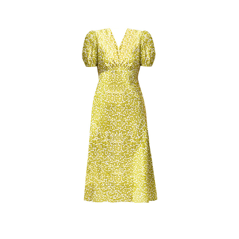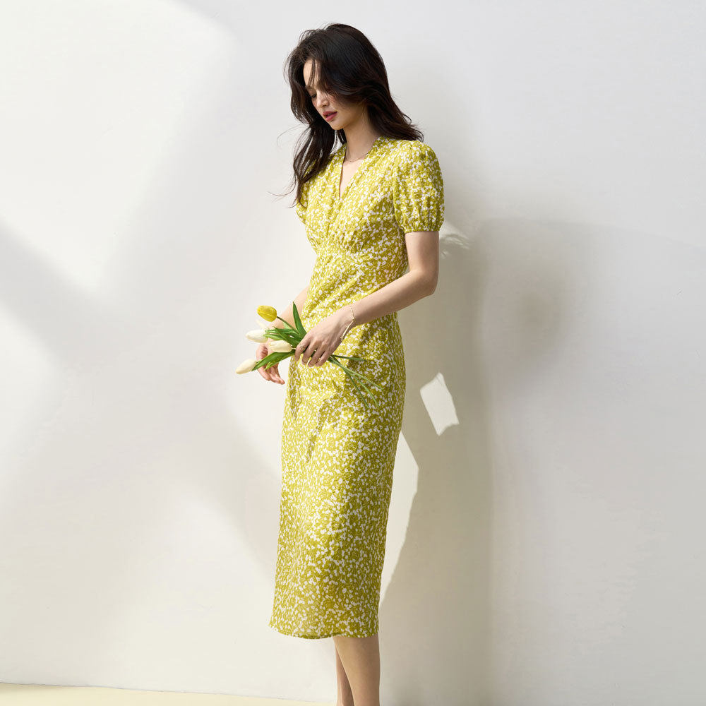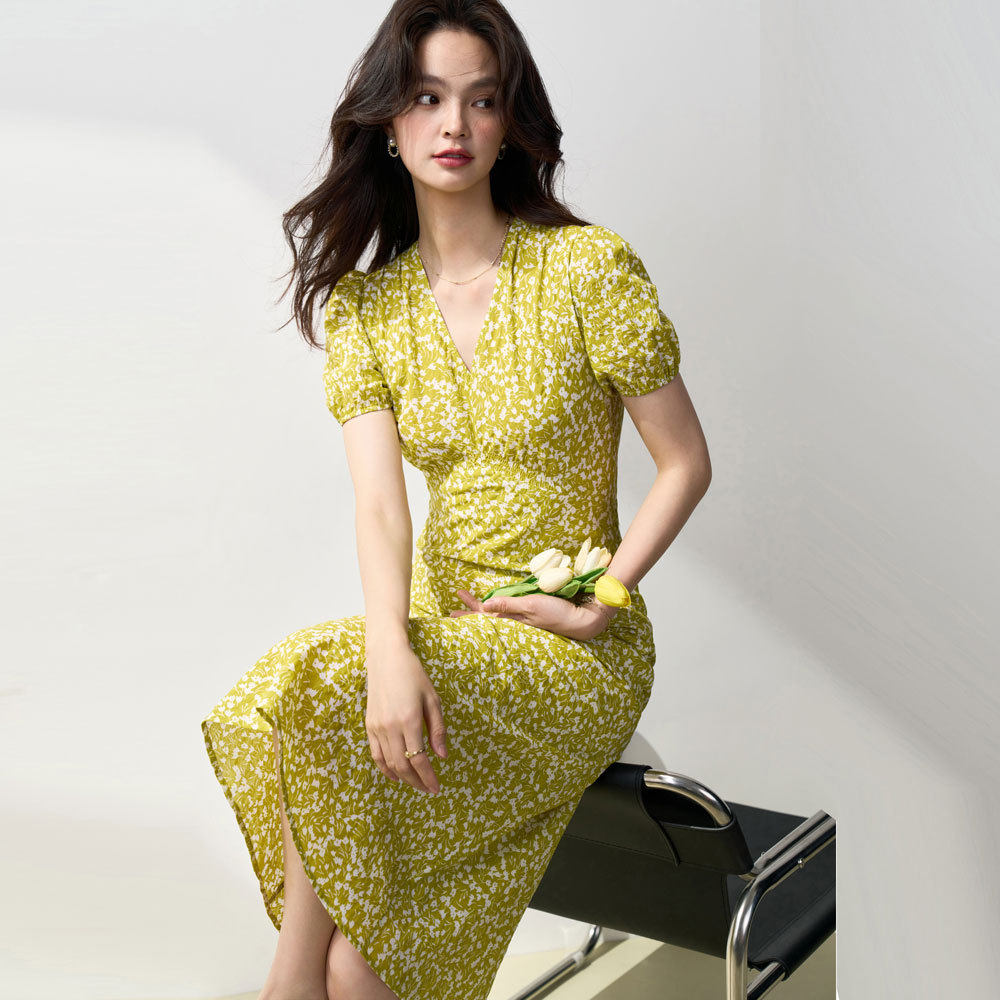 📚 法式茶歇碎花桔梗黄色赫本风碎花连衣裙收腰V领棉2025新款长裙女